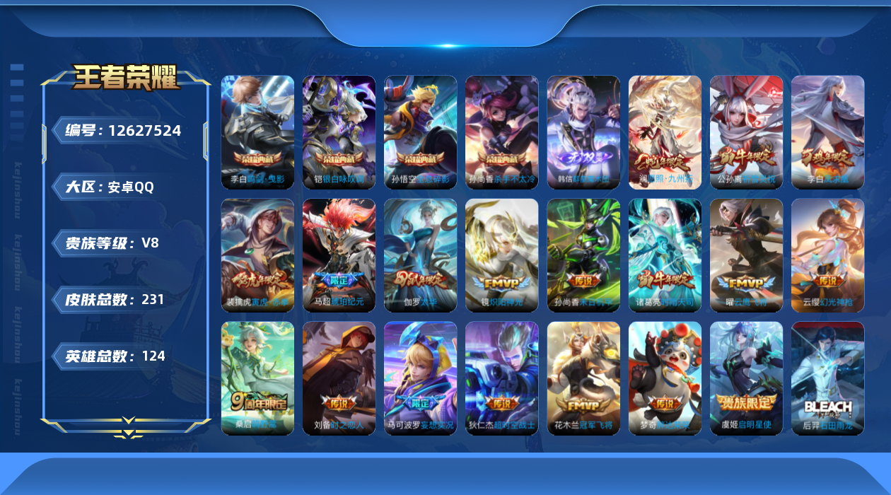 [12627524]安卓Q-V8-永恒钻石III段位-124英雄-231皮肤-4典藏-0珍品无双-1无双-0珍品传说-18传说-74史诗