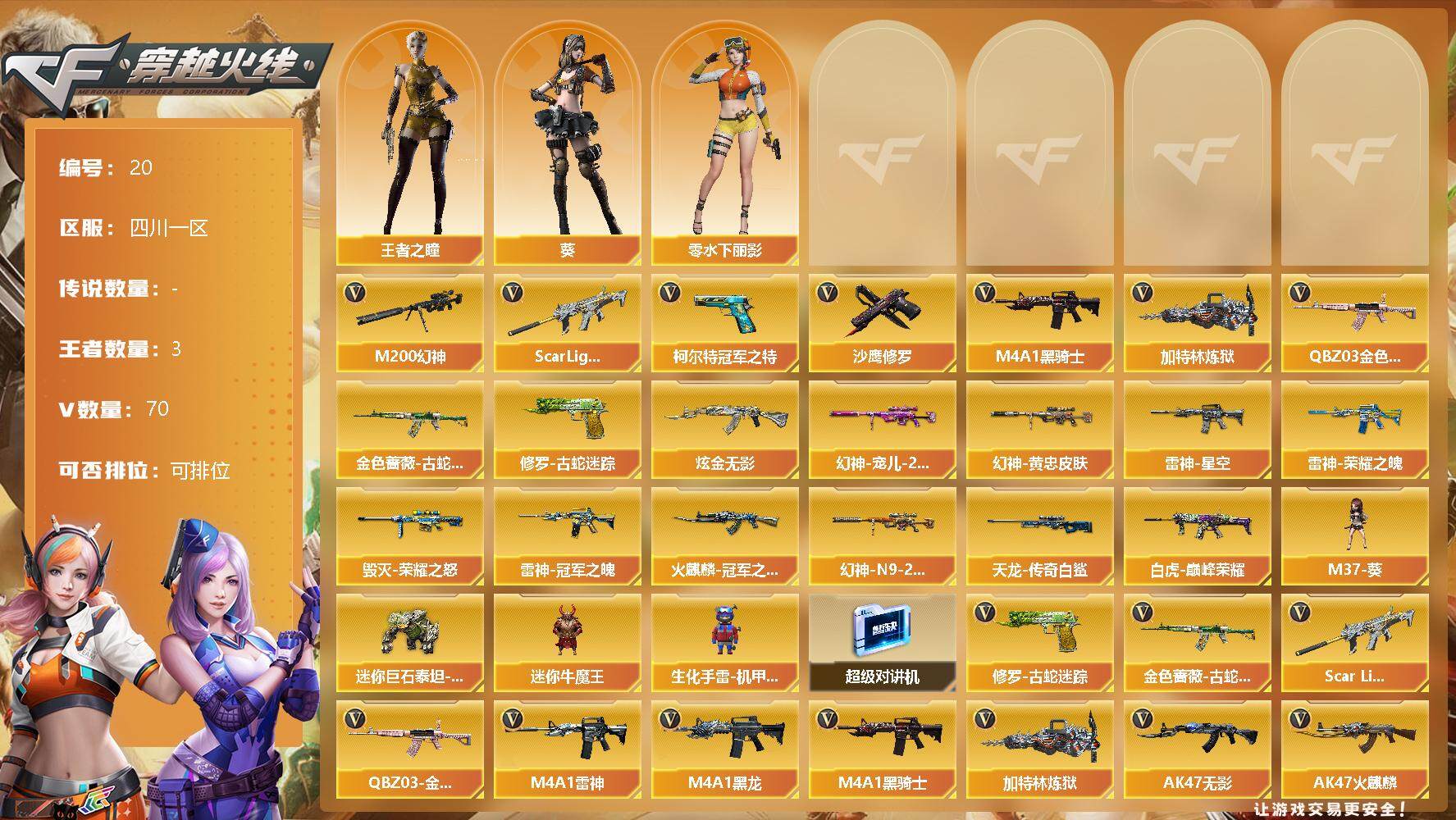 [12628004]四川一区-70V-3王者-1炫金 【热门武器】:QBZ03-金色蔷薇,Scar Light-白虎,M200-幻神,金色蔷薇-古蛇迷踪,修罗-古蛇迷踪,柯尔特-冠军之特,M4A1-黑骑士,加特林-炼狱,沙鹰-修罗*6 【王者炫金武器】:炫金无影 【稀有皮肤】:M200-幻神-黄忠皮肤,幻神-宠儿-2021MVP,M200-幻神-N9-2022MVP,白虎-巅峰荣耀 皮肤,雷神-荣耀之魄,雷神-星空,雷神-冠军之魄,火麒麟-冠军之心,毁灭-荣耀之怒,AWM-天龙-传奇白鲨 【角色】:王者之瞳,零-水下丽影,葵 【人偶武器】:M37-葵,迷你巨石泰坦-魔花研究所,迷你牛魔王,生化手雷-机甲核心 【暴走生化】:超级对讲机 【英雄级武器】:柯尔特-竞技荣光,擎天-竞技荣光,高爆手雷-竞技荣光*5,烟雾弹-竞技荣光*5,闪光弹-竞技荣光*5,M4A1-武圣,Glock18-武圣,QBZ03-金色蔷薇,Scar Light-白虎,金色蔷薇-古蛇迷踪,M4A1-雷神*4,M4A1-黑龙,M4A1-黑骑士,加特林-炼狱,AK47-无影,AK47-火麒麟*2,AK47-黑武士,AWM-天龙,Barrett-毁灭*4,Barrett-极光,AWM-裁决,M4A1-龙血,AA-12-雷霆,M200-幻神,柯尔特-冠军之特,修罗-古蛇迷踪,沙鹰-修罗*6,麒麟刺*3,擎天,龙啸*3,屠龙*5 【特殊枪械】:1白虎,1黑骑士,1炼狱