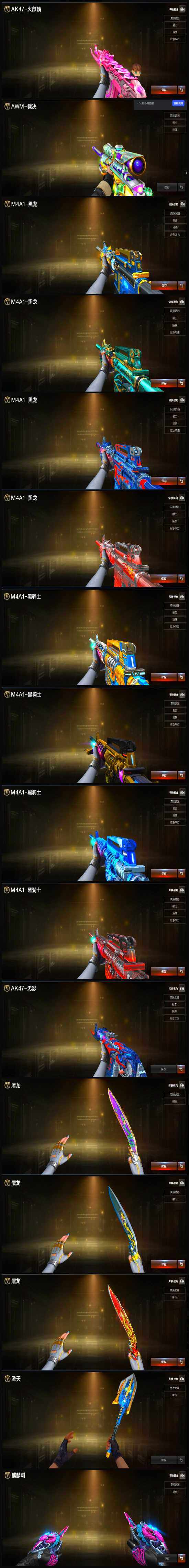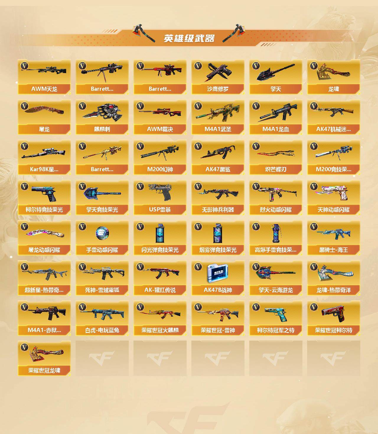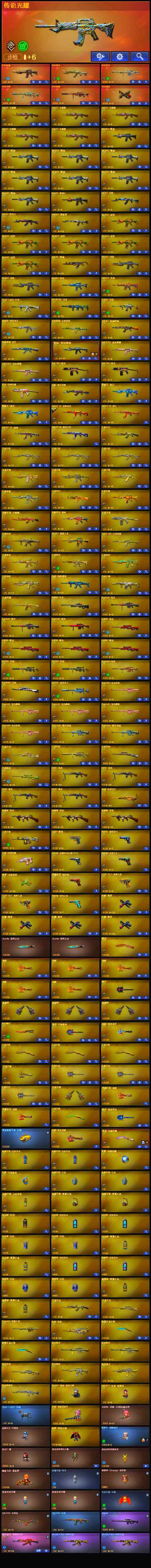 【热门武器】:传说光耀,传说暗裔,传说圣灵,传说辉光,传说幽瞳,传说灵眸,传说幽冥,G36C-幻影,QBZ03-金色蔷薇*2,M14EBR-玄武,Scar Light-白虎,HK417-朱雀,M4A1-青龙,M200-幻神*2,柯尔特-荣耀世冠白鲨2023,金色蔷薇-古蛇迷踪,修罗-古蛇迷踪,M200-竞技荣光,荣耀世冠-火麒麟,荣耀世冠-雷神,白虎-电玩蓝兔,柯尔特-冠军之特,荣耀世冠-柯尔特,Kar98K-星神,炼狱-迷你小钢,毒蜂,M4A1-黑骑士,汤姆逊-烈龙*3,RPK-盘龙*4,幻神-枪娘爱丽丝,玄武-枪娘火莲,COP-白鲨*2,USP-雷暴,沙鹰-修罗*4,Knife-冠军之刃*2,炽芒蝶刃,炽芒蝶刃-冠军炽芒皮肤,炽芒蝶刃-荣耀世冠白鲨2023 皮肤,荣耀世冠-龙啸*2,黄金猫猫手套-白鲨,金刚伞