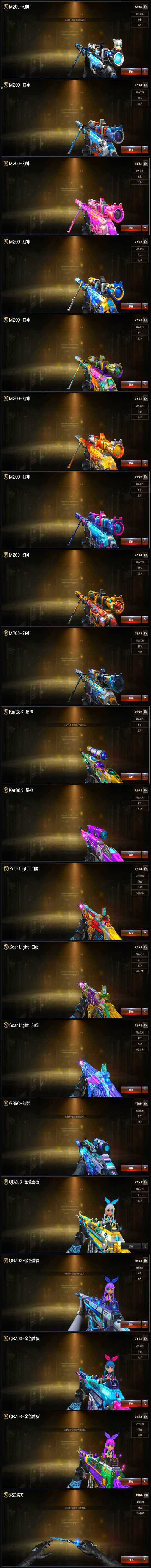【音效卡】:M200-幻神音效卡,M4A1-雷神音效卡,M4A1-黑骑士音效卡,QBZ03-金色蔷薇音效卡,Scar Light-白虎音效卡,Kar98K-星神音效卡