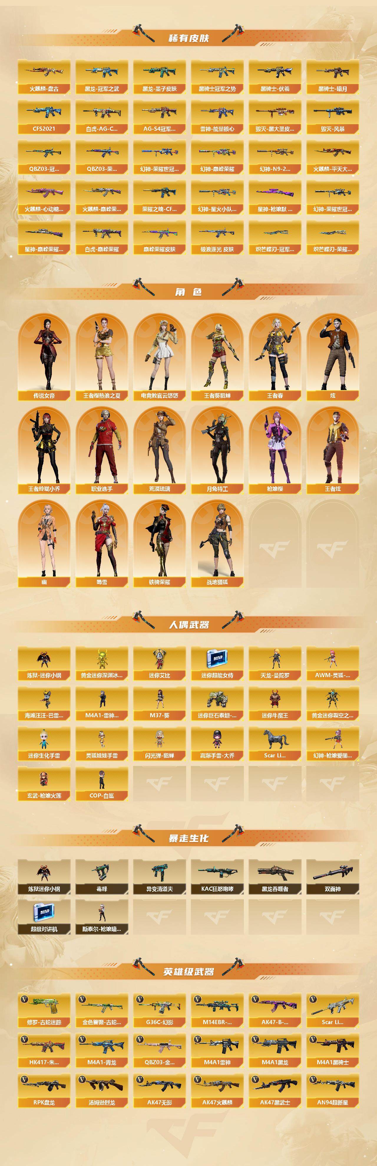 【稀有皮肤】:幻神-周瑜皮肤,幻神-冠军之幻,幻神-宠儿-2021MVP,幻神-巅峰荣耀,幻神-CFS2022,M200-幻神-荣耀世冠白鲨,M200-幻神-N9-2022MVP,幻神-星火小队签名臻藏版 皮肤,幻神-荣耀世冠白鲨2023 皮肤,星神-枪娘默 皮肤,星神-巅峰荣耀 皮肤,白虎-AG-CFPLS20冠军,白虎-巅峰荣耀 皮肤,QBZ03-冠军之薇,QBZ03-荣耀世冠白鲨,QBZ03-巅峰荣耀皮肤,金色蔷薇-破浪逐光 皮肤,雷神-能量核心*4,雷神-荣耀之魄,雷神-星空*2,雷神-耀金皮肤,雷神-传奇N9,雷神-宠儿-2019MVP,雷神-R.LGD-CFPLS18冠军,雷神-荣耀世冠AG,火麒麟-平天大圣,火麒麟-盘古,火麒麟-巅峰荣耀,火麒麟-心动糖果,黑骑士-暗月,黑骑士-冠军之势,黑骑士-CFS2021,黑骑士-伏羲,黑骑士-A