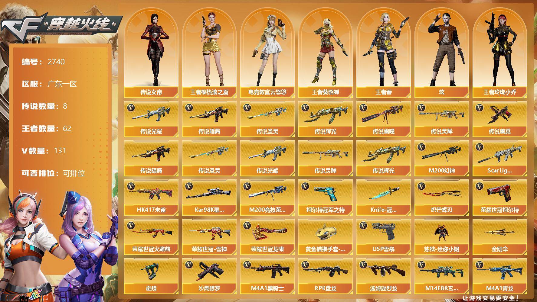 [12628213]广东一区-131V-62王者-6炫金 【传说武器】:传说光耀,传说暗裔,传说圣灵,传说辉光,传说幽瞳,传说灵眸,传说幽冥 【传说角色】:传说女帝 【热门武器】:传说光耀,传说暗裔,传说圣灵,传说辉光,传说幽瞳,传说灵眸,传说幽冥,G36C-幻影,QBZ03-金色蔷薇*2,M14EBR-玄武,Scar Light-白虎,HK417-朱雀,M4A1-青龙,M200-幻神*2,柯尔特-荣耀世冠白鲨2023,金色蔷薇-古蛇迷踪,修罗-古蛇迷踪,M200-竞技荣光,荣耀世冠-火麒麟,荣耀世冠-雷神,白虎-电玩蓝兔,柯尔特-冠军之特,荣耀世冠-柯尔特,Kar98K-星神,炼狱-迷你小钢,毒蜂,M4A1-黑骑士,汤姆逊-烈龙*3,RPK-盘龙*4,幻神-枪娘爱丽丝,玄武-枪娘火莲,COP-白鲨*2,USP-雷暴,沙鹰-修罗*4,Knife-冠军之刃*2,炽芒蝶刃,炽芒蝶刃-冠军炽芒皮肤,炽芒蝶刃-荣耀世冠白鲨2023 皮肤,荣耀世冠-龙啸*2,黄金猫猫手套-白鲨,金刚伞 【王者炫金武器】:炫金骑士,炫金天龙,炫金毁灭*2,炫金雷神,炫金超新星,炼狱-悦蓝,王者之力,王者之心,Barrett-雷霆王者,王者青龙,王者凤吟,王者之霆,王者之刺,雷霆王者之锋*2,王者玉锋 【音效卡】:M200-幻神音效卡,M4A1-雷神音效卡,M4A1-黑骑士音效卡,QBZ03-金色蔷薇音效卡,Scar Light-白虎音效卡,Kar98K-星神音效卡 【稀有皮肤】:幻神-周瑜皮肤,幻神-冠军之幻,幻神-宠儿-2021MVP,幻神-巅峰荣耀,幻神-CFS2022,M200-幻神-荣耀世冠白鲨,M200-幻神-N9-2022MVP,幻神-星火小队签名臻藏版 皮肤,幻神-荣耀世冠白鲨2023 皮肤,星神-枪娘默 皮肤,星神-巅峰荣耀 皮肤,白虎-AG-CFPLS20冠军,白虎-巅峰荣耀 皮肤,QBZ03-冠军之薇,QBZ03-荣耀世冠白鲨,QBZ03-巅峰荣耀皮肤,金色蔷薇-破浪逐光 皮肤,雷神-能量核心*4,雷神-荣耀之魄,雷神-星空*2,雷神-耀金皮肤,雷神-传奇N9,雷神-宠儿-2019MVP,雷神-R.LGD-CFPLS18冠军,雷神-荣耀世冠AG,火麒麟-平天大圣,火麒麟-盘古,火麒麟-巅峰荣耀,火麒麟-心动糖果,黑骑士-暗月,黑骑士-冠军之势,黑骑士-CFS2021,黑骑士-伏羲,黑骑士-A