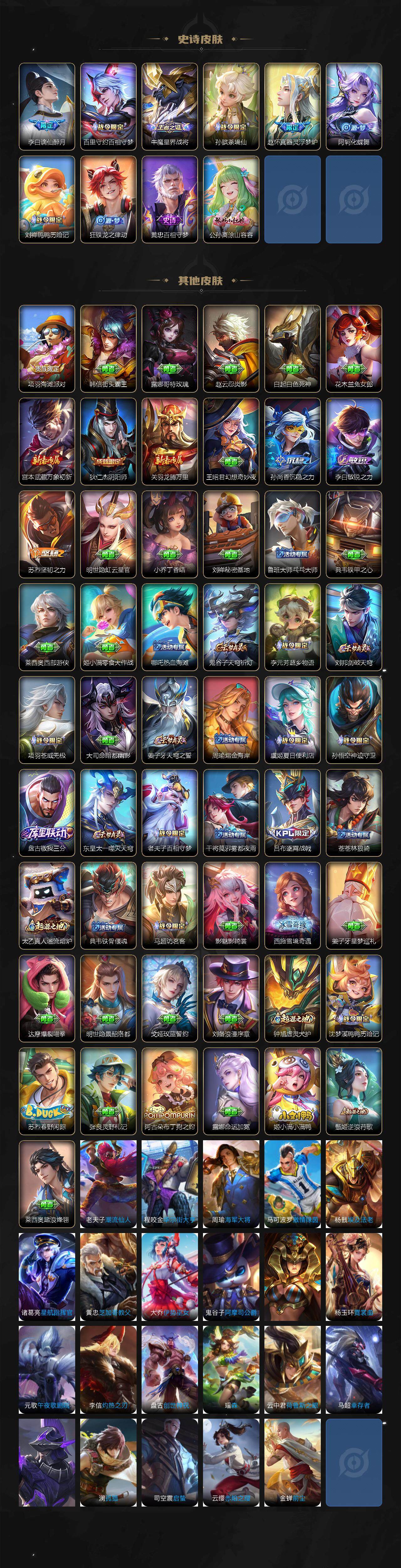 【史诗皮肤】:赵云皇家上将,貂蝉圣诞恋歌,甄姬冰雪圆舞曲,王昭君偶像歌手,狄仁杰魔术师,廉颇地狱岩魂,宫本武藏鬼剑武藏,孙尚香水果甜心,吕布末日机甲,关羽冰锋战神,孙悟空至尊宝,花木兰水晶猎龙者,刘邦德古拉伯爵,夏侯惇乘风破浪,小乔缤纷独角兽,诸葛亮黄金分割率,雅典娜冰冠公主,安琪拉心灵骇客,铠曙光守护者,李元芳逐浪之夏,白起星夜王子,狄仁杰鹰眼统帅,大乔白蛇,蒙犽狂想玩偶喵,百里玄策原初追逐者,杨戬天秀启明,弈星滕王阁序,镜玫瑰异探,伽罗琥珀纪元,鲁班七号蔬乡物语,镜青焰无极,海诺心动手记,蔡文姬夏日便利店,大司命东方月初,亚连破空之剑,马可波罗星界特工,李白谪仙醉月,百里守约百相守梦,牛魔星界战将,孙膑茶境仙,赵怀真器灵浮梦炉,阿轲化蝶舞,刘禅鸭鸭历险记,狂铁龙之律动,黄忠百相守梦,公孙离涂山容容