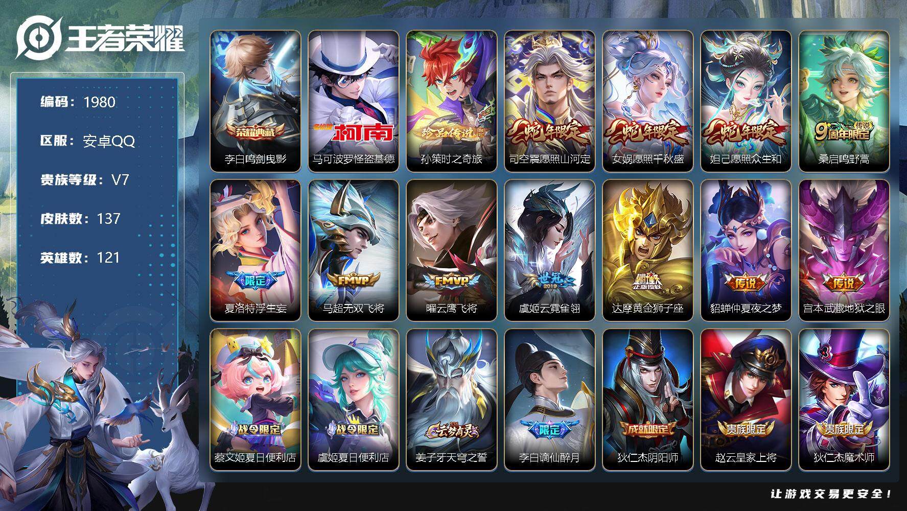 [12628872]安卓Q-V7-永恒钻石IV段位-121英雄-137皮肤-1典藏-0珍品无双-0无双-2珍品传说-11传说-46史诗 【英雄全皮】:影全皮 【荣耀典藏】:李白鸣剑曳影 【珍品传说】:马可波罗怪盗基德,孙策时之奇旅 【传说皮肤】:司空震愿照山河定,女娲愿照千秋盛,妲己愿照众生和,桑启鸣野蒿,夏洛特浮生妄,马超无双飞将,曜云鹰飞将,虞姬云霓雀翎,达摩黄金狮子座,貂蝉仲夏夜之梦,宫本武藏地狱之眼 【限定皮肤】:蔡文姬夏日便利店,虞姬夏日便利店,姜子牙天穹之誓,李白谪仙醉月,狄仁杰阴阳师,赵云皇家上将,狄仁杰魔术师,项羽海滩派对,关羽冰锋战神,孙悟空至尊宝,百里玄策原初追逐者,蒙犽狂想玩偶喵,夏洛特浮生妄,鬼谷子天穹祈灯,伽罗琥珀纪元,鲁班七号蔬乡物语,李元芳蔬乡物语,刘邦剑破天穹,镜青焰无极,项羽苍威无极,海诺心动手记,周瑜熔金海岸 【赛季限定】:百里玄策原初追逐者,鬼谷子天穹祈灯,刘邦剑破天穹,姜子牙天穹之誓 【战令限定】:蔡文姬夏日便利店,虞姬夏日便利店,蒙犽狂想玩偶喵,鲁班七号蔬乡物语,李元芳蔬乡物语,镜青焰无极,项羽苍威无极 【史诗皮肤】:赵云皇家上将,貂蝉圣诞恋歌,甄姬冰雪圆舞曲,王昭君偶像歌手,狄仁杰魔术师,廉颇地狱岩魂,宫本武藏鬼剑武藏,孙尚香水果甜心,吕布末日机甲,关羽冰锋战神,孙悟空至尊宝,花木兰水晶猎龙者,刘邦德古拉伯爵,夏侯惇乘风破浪,小乔缤纷独角兽,诸葛亮黄金分割率,雅典娜冰冠公主,安琪拉心灵骇客,铠曙光守护者,李元芳逐浪之夏,白起星夜王子,狄仁杰鹰眼统帅,大乔白蛇,蒙犽狂想玩偶喵,百里玄策原初追逐者,杨戬天秀启明,弈星滕王阁序,镜玫瑰异探,伽罗琥珀纪元,鲁班七号蔬乡物语,镜青焰无极,海诺心动手记,蔡文姬夏日便利店,大司命东方月初,亚连破空之剑,马可波罗星界特工,李白谪仙醉月,百里守约百相守梦,牛魔星界战将,孙膑茶境仙,赵怀真器灵浮梦炉,阿轲化蝶舞,刘禅鸭鸭历险记,狂铁龙之律动,黄忠百相守梦,公孙离涂山容容 【其他皮肤】:项羽海滩派对,韩信街头霸王,露娜哥特玫瑰,赵云忍炎影,白起白色死神,花木兰兔女郎,宫本武藏万象初新,狄仁杰阴阳师,关羽龙腾万里,王昭君幻想奇妙夜,孙尚香沉稳之力,李白敏锐之力,苏烈坚韧之力,明世隐虹云星官,小乔丁香结,刘禅秘密基地,鲁班大师乓乓大师,典韦铁甲之心,莱西奥西部游侠,姬小满零食大作战,哪吒热血海滩,鬼谷子天穹祈灯,李元