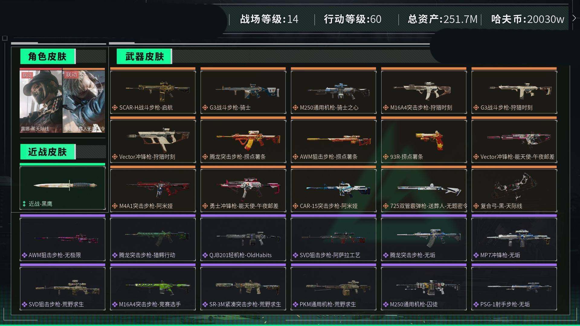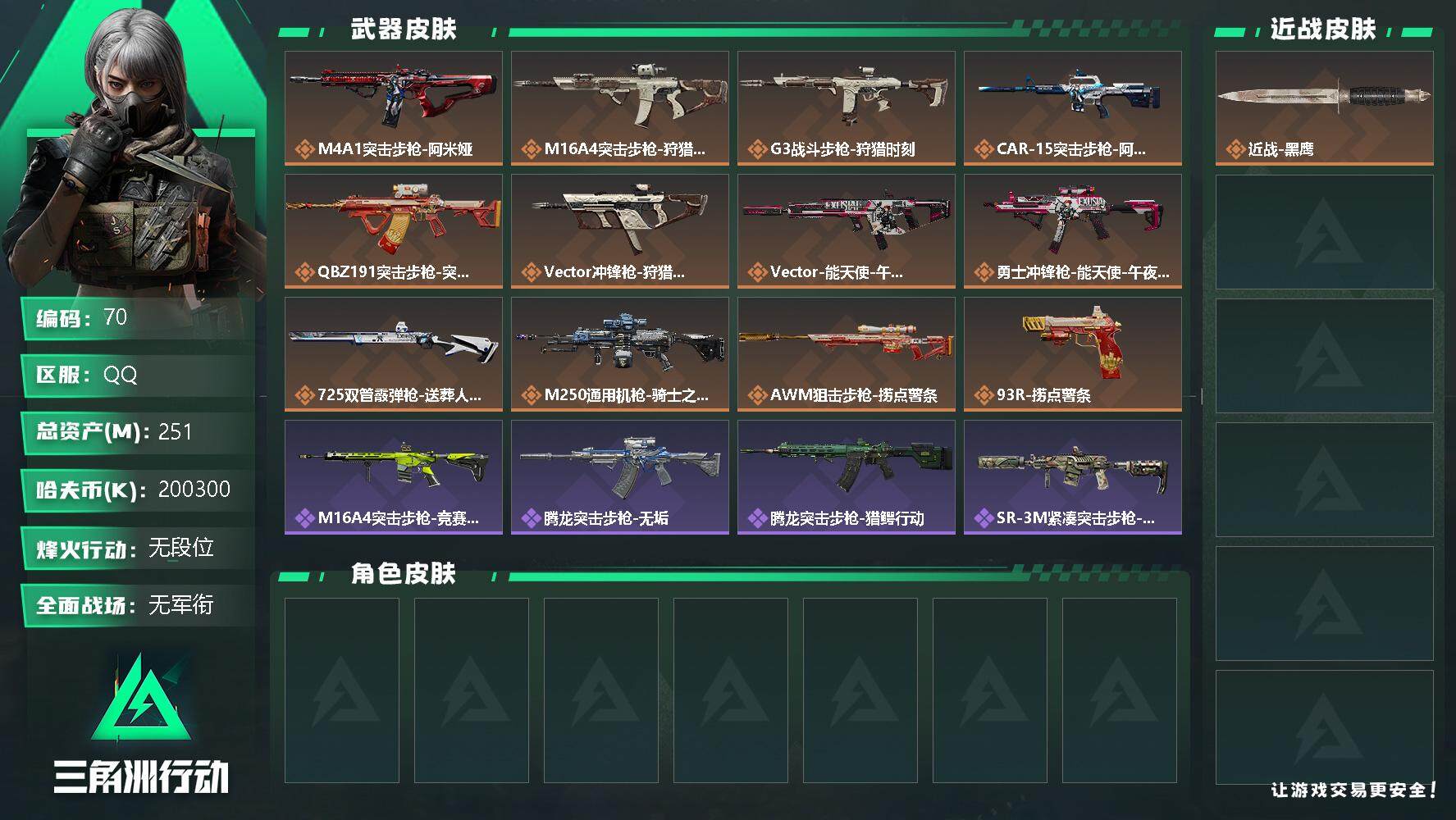 [12628946]汤14009总资产251M,哈夫币20030w,露娜-黑天际线/蜂医-送葬人无题密令,枪皮数量93,战场等级:14 列兵,行动等级:60 钻石,近战-黑鹰,安全箱等时效性道具请以游戏内数据为准;详情请看图【个人信息】战场等级:14 列兵,行动等级:60 钻石【哈夫币】20030w【总资产】251M【烽火地带专区】总资产200M以上【货币】39三角币/0曼德尔币/0三角券【安全箱】基础安全箱2(1x2)/S6高级安全箱6(2x3)【通行证】烽火地带限定版【特勤处】制药台Lv.3/工作台Lv.3/仓库Lv.5/防具台Lv.3/训练中心Lv.4/靶场Lv.4/技术中心Lv.3/指挥中心Lv.3/潜水中心Lv.0/收藏室Lv.0【角色皮肤】露娜-黑天际线/蜂医-送葬人无题密令/【已拥有捆绑包】狩猎时刻捆绑包/捞点薯条捆绑包/【近战皮肤】近战-黑鹰/【步枪皮肤】腾龙突击步枪-无垢/M16A4突击步枪-竞赛选手/SR-3M紧凑突击步枪-荒野求生/CAR-15突击步枪-阿米娅/M4A1突击步枪-阿米娅/G3战斗步枪-狩猎时刻/M16A4突击步枪-狩猎时刻/腾龙突击步枪-捞点薯条/腾龙突击步枪-猎鳄行动/G3战斗步枪-骑士/SCAR-H战斗步枪-启航/【冲锋枪皮肤】Vector冲锋枪-狩猎时刻/MP7冲锋枪-无垢/勇士冲锋枪-能天使-午夜邮差/Vector冲锋枪-能天使-午夜邮差/勇士冲锋枪-工业狂潮/【霰弹枪皮肤】725双管霰弹枪-送葬人-无题密令/【轻机枪皮肤】PKM通用机枪-荒野求生/M250通用机枪-囚徒/QJB201轻机枪-OldHabits/M250通用机枪-骑士之心/【精准射手步枪皮肤】PSG-1射手步枪-无垢/【狙击步枪皮肤】SVD狙击步枪-阿萨拉工艺/SV-98狙击步枪-林中猎手/SVD狙击步枪-荒野求生/AWM狙击步枪-捞点薯条/【手枪皮肤】93R-捞点薯条/【特殊武器】复合弓-黑-天际线/【挂饰】诡影狙击兵/诡影喷火兵/挂饰-启程/阿萨拉机枪兵/阿萨拉狙击兵/挂饰-晶石幻想/挂饰-阿米娅/挂饰-来点薯条/挂饰-能天使/挂饰-狩猎时刻/阿萨拉徽章/紧急会议/(典藏皮肤颜色请以典藏展示为准,安全箱等时效性道具请以游戏内数据为准)