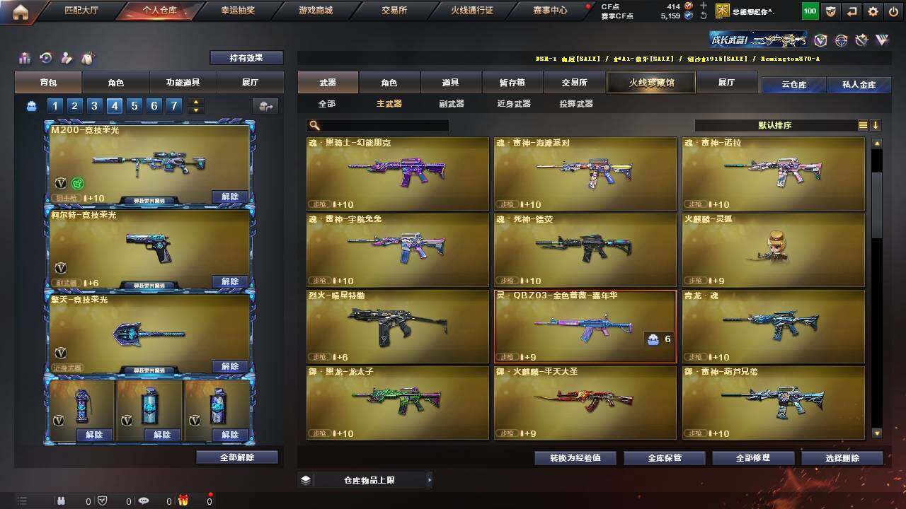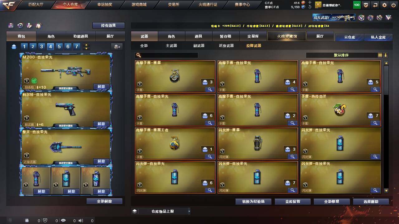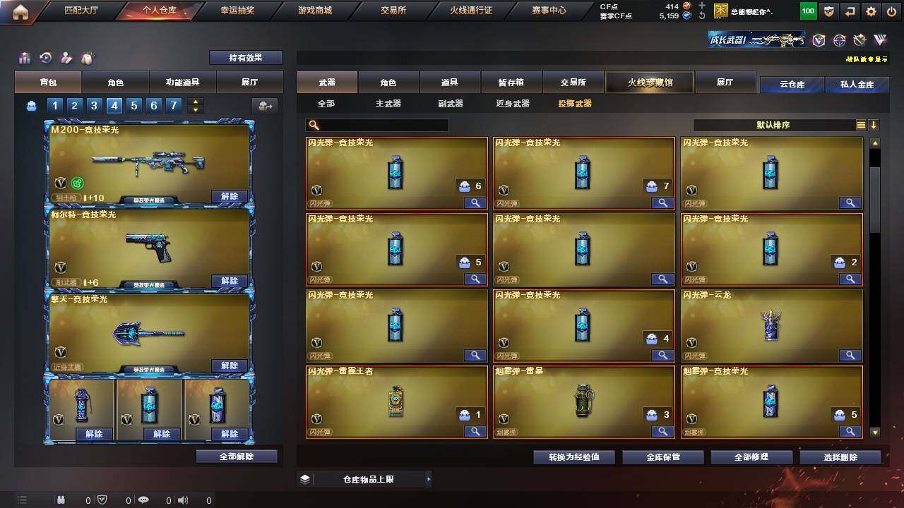 【英雄级武器】:M200-竞技荣光,柯尔特-竞技荣光,擎天-竞技荣光,高爆手雷-竞技荣光*4,烟雾弹-竞技荣光*4,闪光弹-竞技荣光*9,斩神刀-雷暴,AA-12-雷霆,黑武士-锦绣游龙,超新星-热带奇洋,沙鹰-天神*2,沙鹰-修罗,屠龙,龙啸-热带奇洋