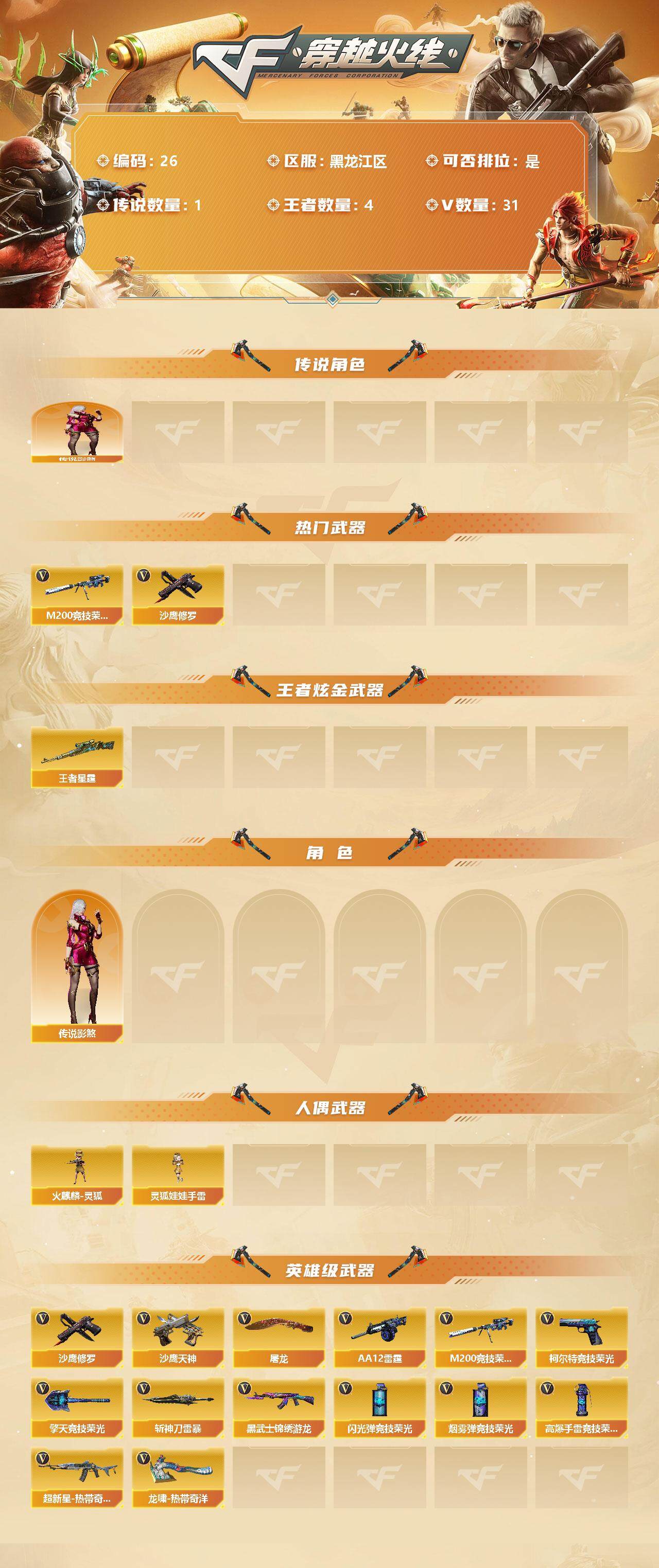 - [13237542]黑龙江区-52V-4王者-1炫金 【热门武器】:死亡之眼*2,M4A1-黑骑士,加特林-炼狱,COP-堕天神*2,沙鹰-修罗*2 【王者炫金武器】:王者之魄*2,王者之魂,炫金雷神 【皮肤】:雷神-星空,毁灭-星空,战神-紫绶金章皮肤*4,战神-流金岁月皮肤*2 【角色】:葵,樱,迷迭香,乔伊教练,空,暗夜-X,初恋灵狐,娟娟,龙儿,蜀雪,影武者-X 【人偶武器】:巴雷特-零-水下丽影*2,AWM-灵狐-15周年嘉年华,闪光弹-小乔 【暴走生化】:死亡之眼*2 【挑战大师】:激光毁灭者III-白马银枪,激光毁灭者III 【英雄级武器】:AK47-火麒麟,M4A1-雷神,M4A1-黑骑士,AK47-无影,M4A1-死神,M4A1-堕天神,AK-47-猩红传说*5,AK47-B-战神,Barrett-毁灭,AWM-裁决,Barrett-金色蔷薇,王者之怒-觉醒版,加特林-炼狱,沙鹰-修罗*2,COP-堕天神*2,屠龙*2,龙啸,麒麟刺-堕天神,麒麟刺,龙啸-堕天神,擎天-CF网剧冠军,高爆手雷-堕天神*6,闪光弹-堕天神*6,烟雾弹-堕天神*6 【特殊枪械】:1黑骑士,1炼狱