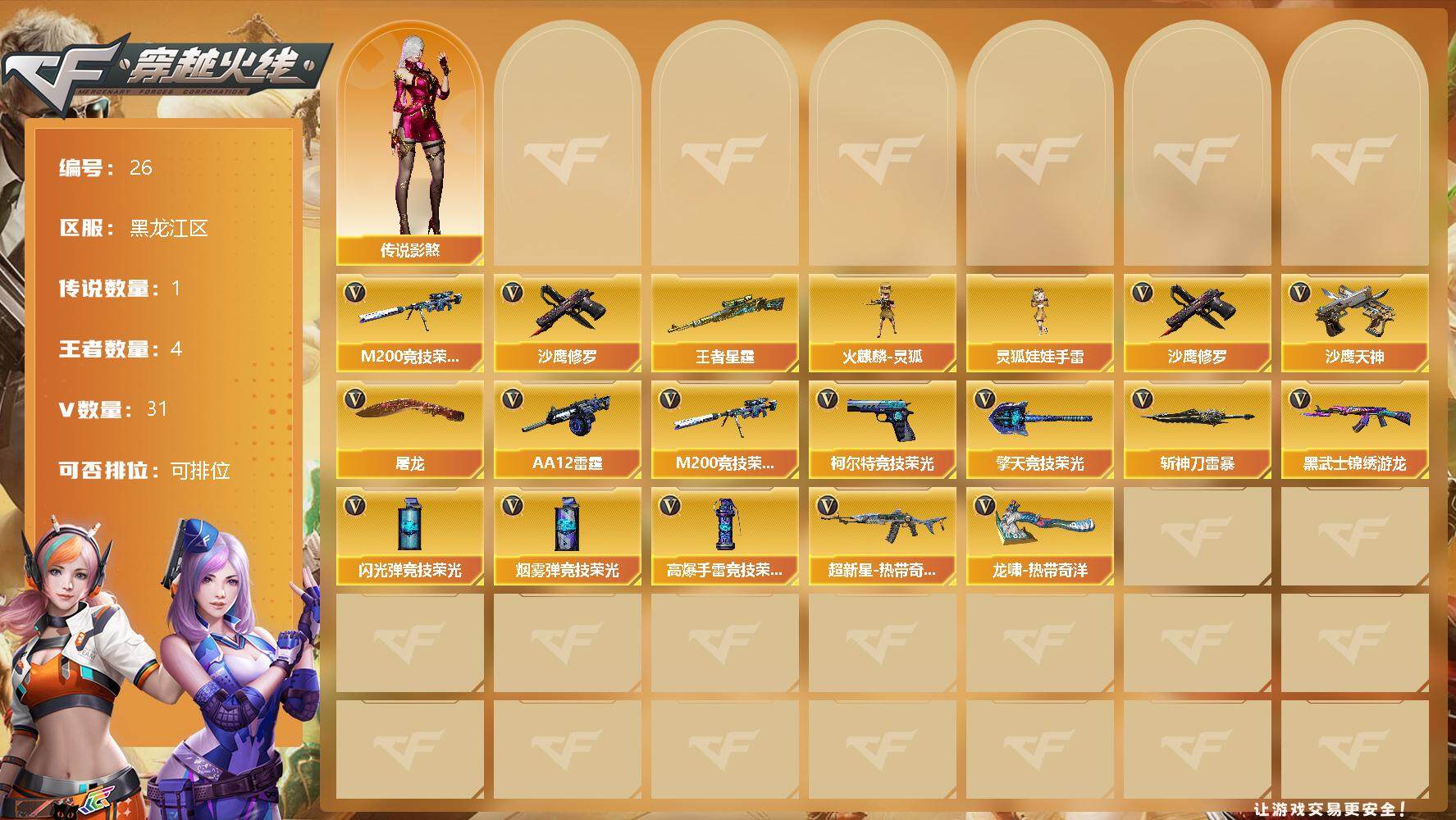 [12631217]黑龙江区-31V-4王者-0炫金 【传说角色】:传说影煞 【热门武器】:M200-竞技荣光,沙鹰-修罗 【王者炫金武器】:王者星霆 【角色】:传说影煞 【人偶武器】:火麒麟-灵狐,灵狐娃娃手雷 【英雄级武器】:M200-竞技荣光,柯尔特-竞技荣光,擎天-竞技荣光,高爆手雷-竞技荣光*4,烟雾弹-竞技荣光*4,闪光弹-竞技荣光*9,斩神刀-雷暴,AA-12-雷霆,黑武士-锦绣游龙,超新星-热带奇洋,沙鹰-天神*2,沙鹰-修罗,屠龙,龙啸-热带奇洋 【特殊枪械】: