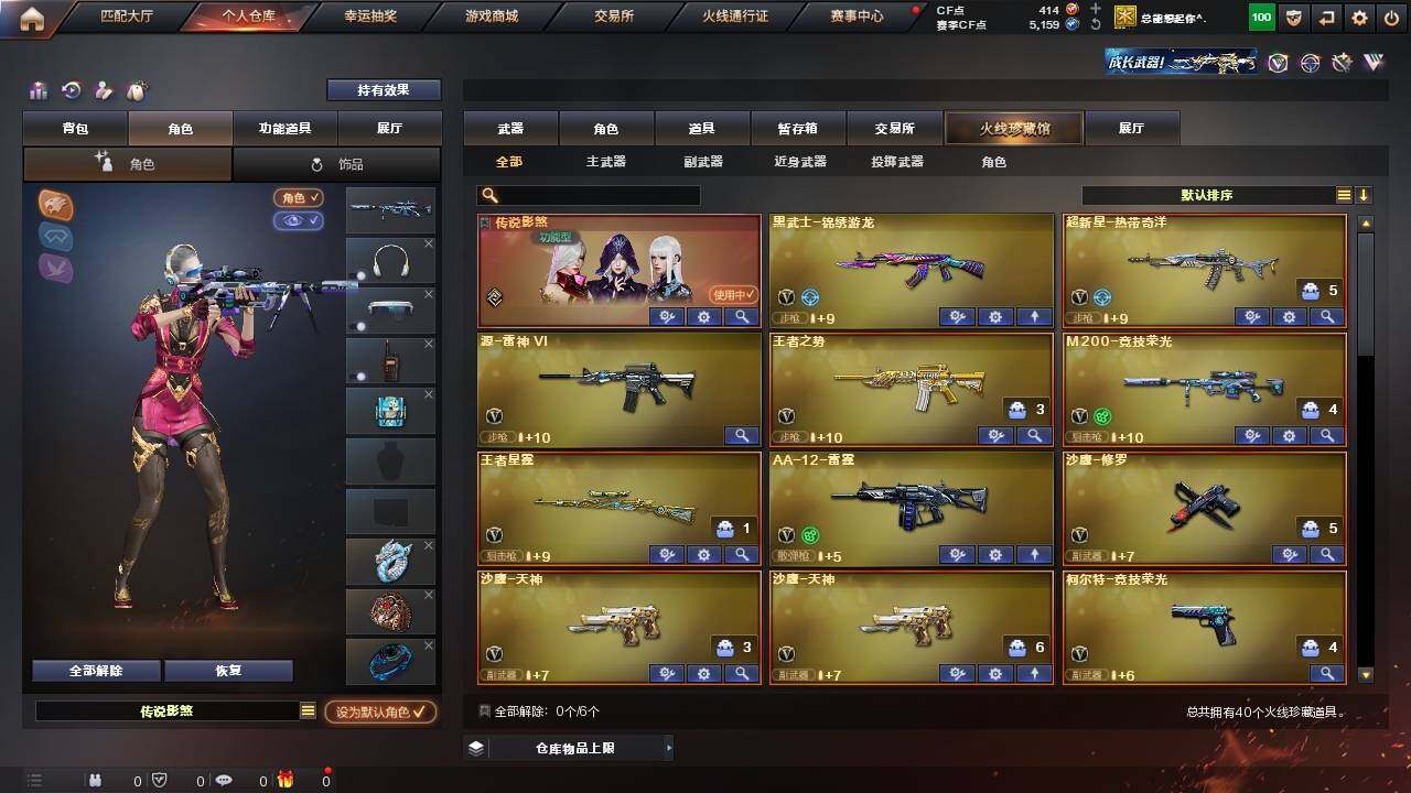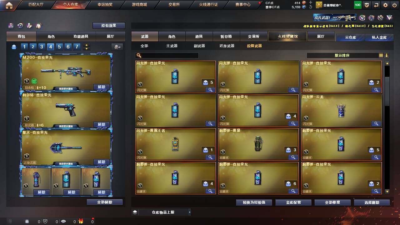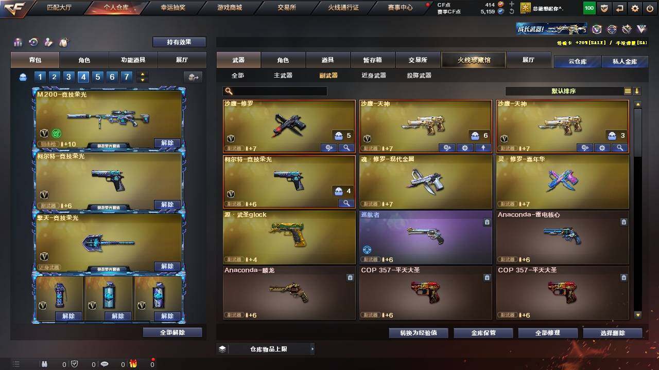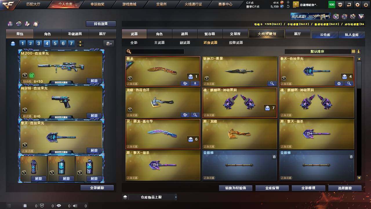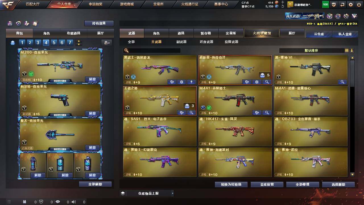 【热门武器】:传说破晓,QBZ03-金色蔷薇,Scar Light-白虎,M200-幻神,金色蔷薇-古蛇迷踪,修罗-古蛇迷踪,凤吟之魄,金色小号,牛牛-AK47,M4A1-黑骑士*2,斯泰尔-蝴蝶,MK5-炽火炎龙,USP-雷暴,沙鹰-修罗,柯尔特-赛博朋克,炽芒蝶刃*2