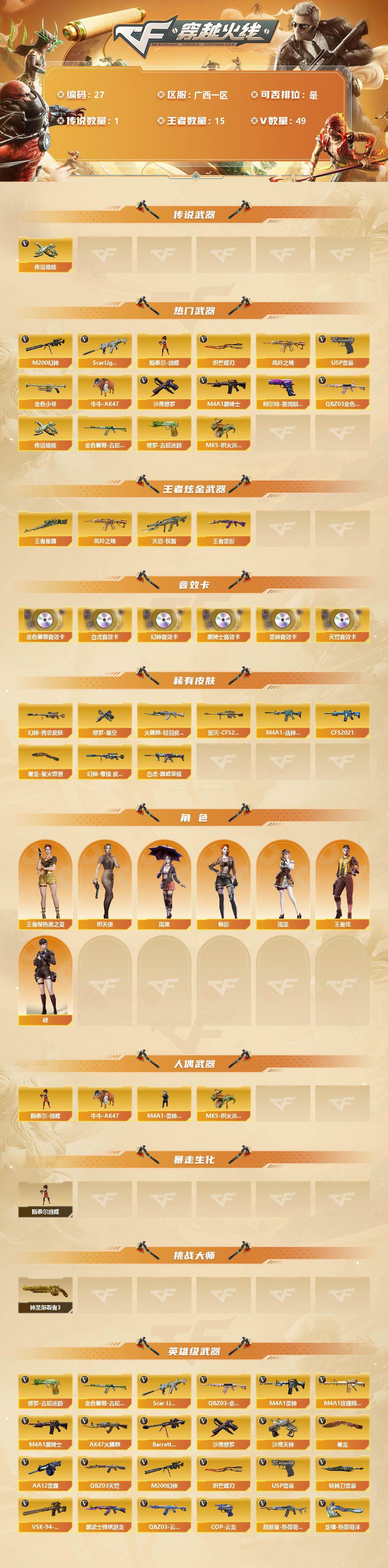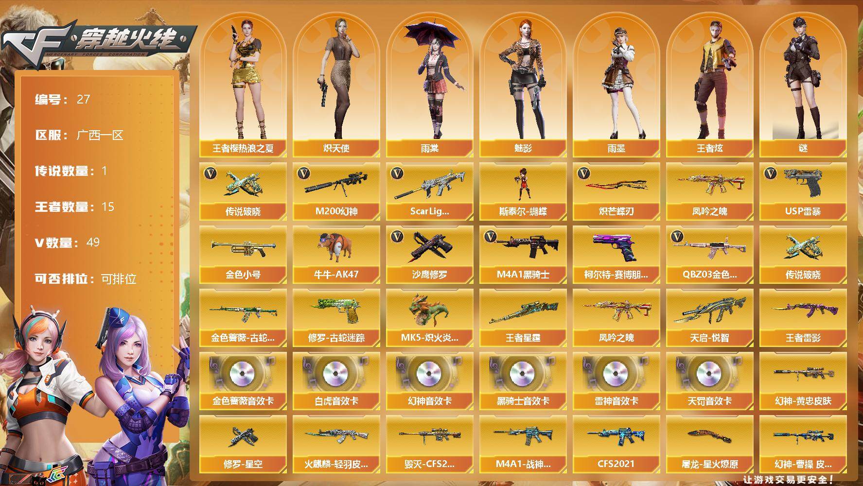 [12631589]广西一区-49V-15王者-0炫金 【传说武器】:传说破晓 【热门武器】:传说破晓,QBZ03-金色蔷薇,Scar Light-白虎,M200-幻神,金色蔷薇-古蛇迷踪,修罗-古蛇迷踪,凤吟之魄,金色小号,牛牛-AK47,M4A1-黑骑士*2,斯泰尔-蝴蝶,MK5-炽火炎龙,USP-雷暴,沙鹰-修罗,柯尔特-赛博朋克,炽芒蝶刃*2 【王者炫金武器】:天启-悦智,王者星霆,凤吟之魄,王者雷影 【音效卡】:M200-幻神音效卡,M4A1-雷神音效卡,M4A1-黑骑士音效卡,QBZ03-金色蔷薇音效卡,Scar Light-白虎音效卡,QBZ03-天罚音效卡 【稀有皮肤】:M200-幻神-黄忠皮肤,幻神-曹操 皮肤,白虎-巅峰荣耀 皮肤,M4A1-战神赵云,火麒麟-轻羽皮肤,黑骑士-CFS2021,毁灭-CFS2020,修罗-星空,屠龙-星火燎原*2 【角色】:王者樱-热浪之夏,王者炫,魅影,雨棠,雨墨,谜,炽天使 【人偶武器】:MK5-炽火炎龙,斯泰尔-蝴蝶,M4A1-雷神-精英刀锋,牛牛-AK47 【暴走生化】:斯泰尔-蝴蝶 【挑战大师】:神圣爆裂者III 【英雄级武器】:QBZ03-云龙,COP 357-云龙*2,USP-雷暴,斩神刀-雷暴,QBZ03-金色蔷薇,Scar Light-白虎,金色蔷薇-古蛇迷踪,M4A1-雷神*2,M4A1-玫瑰精灵*2,M4A1-黑骑士*2,AK47-火麒麟,Barrett-毁灭,AA-12-雷霆,QBZ03-天罚,M200-幻神,VSK-94-金蚀,黑武士-锦绣游龙,超新星-热带奇洋,修罗-古蛇迷踪,沙鹰-天神,沙鹰-修罗,炽芒蝶刃*2,屠龙*2,龙啸-热带奇洋 【特殊枪械】:蝴蝶斯泰尔+0烈龙,1白虎,2黑骑士,1蝴蝶斯泰尔