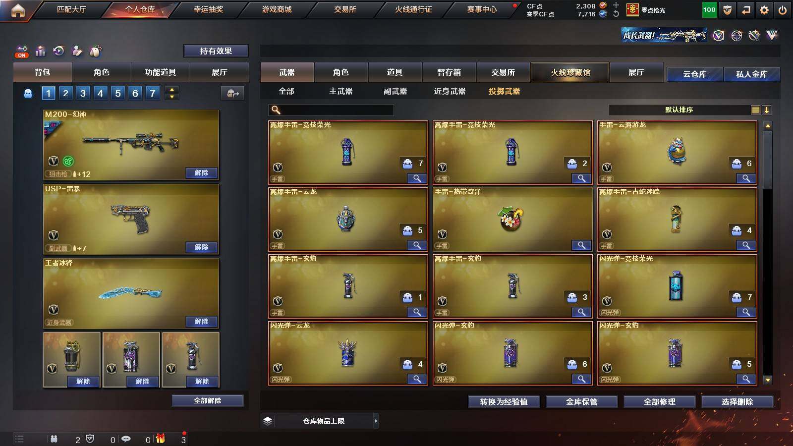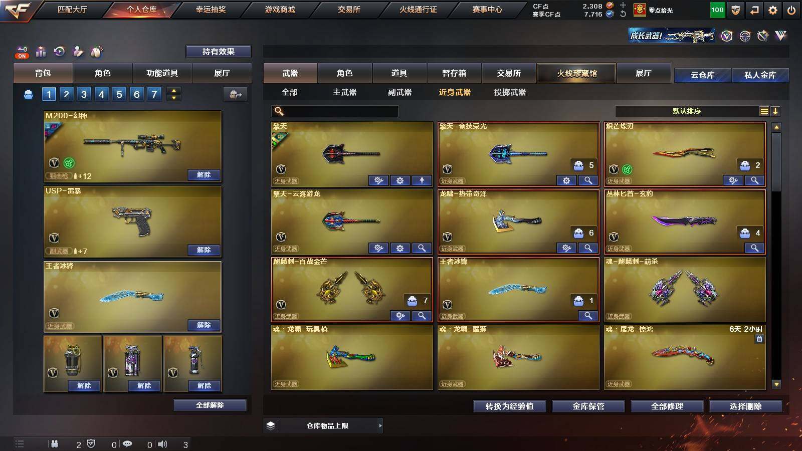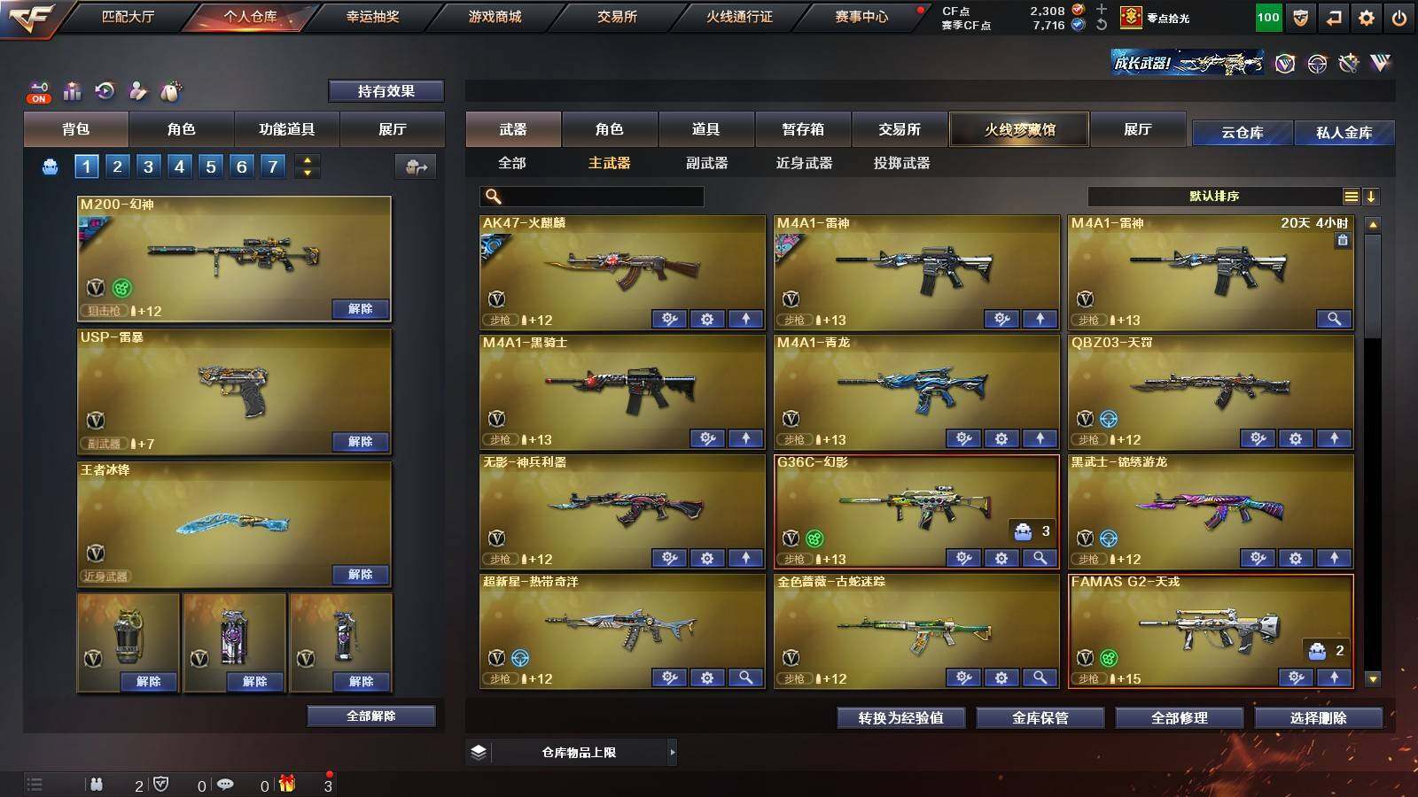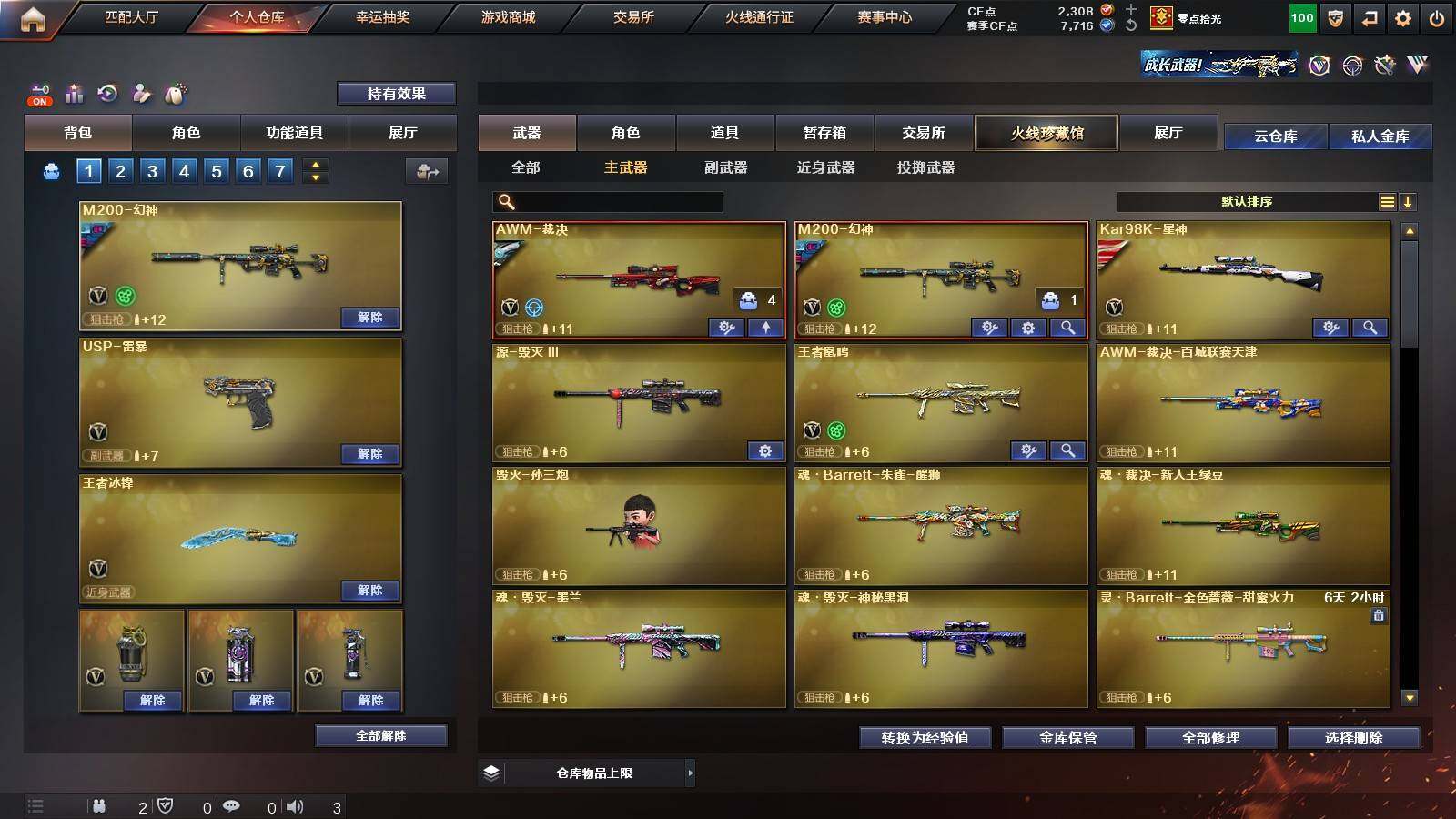 【英雄级武器】:柯尔特-竞技荣光,擎天-竞技荣光,高爆手雷-竞技荣光*2,烟雾弹-竞技荣光,闪光弹-竞技荣光,USP-雷暴,FAMAS G2-天戎,G36C-幻影,QBZ03-金色蔷薇,M4A1-青龙,金色蔷薇-古蛇迷踪,无影-神兵利器,M4A1-雷神,M4A1-黑骑士,AK47-火麒麟,AWM-裁决,QBZ03-天罚,Kar98K-星神,M200-幻神,黑武士-锦绣游龙,超新星-热带奇洋,死神-雪域霜狐,M4A1-赤狱骑士,修罗-古蛇迷踪,沙鹰-天神,沙鹰-修罗,炽芒蝶刃,擎天,擎天-云海游龙,龙啸-热带奇洋