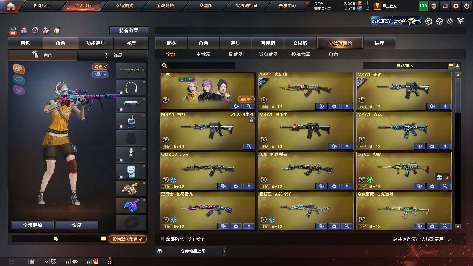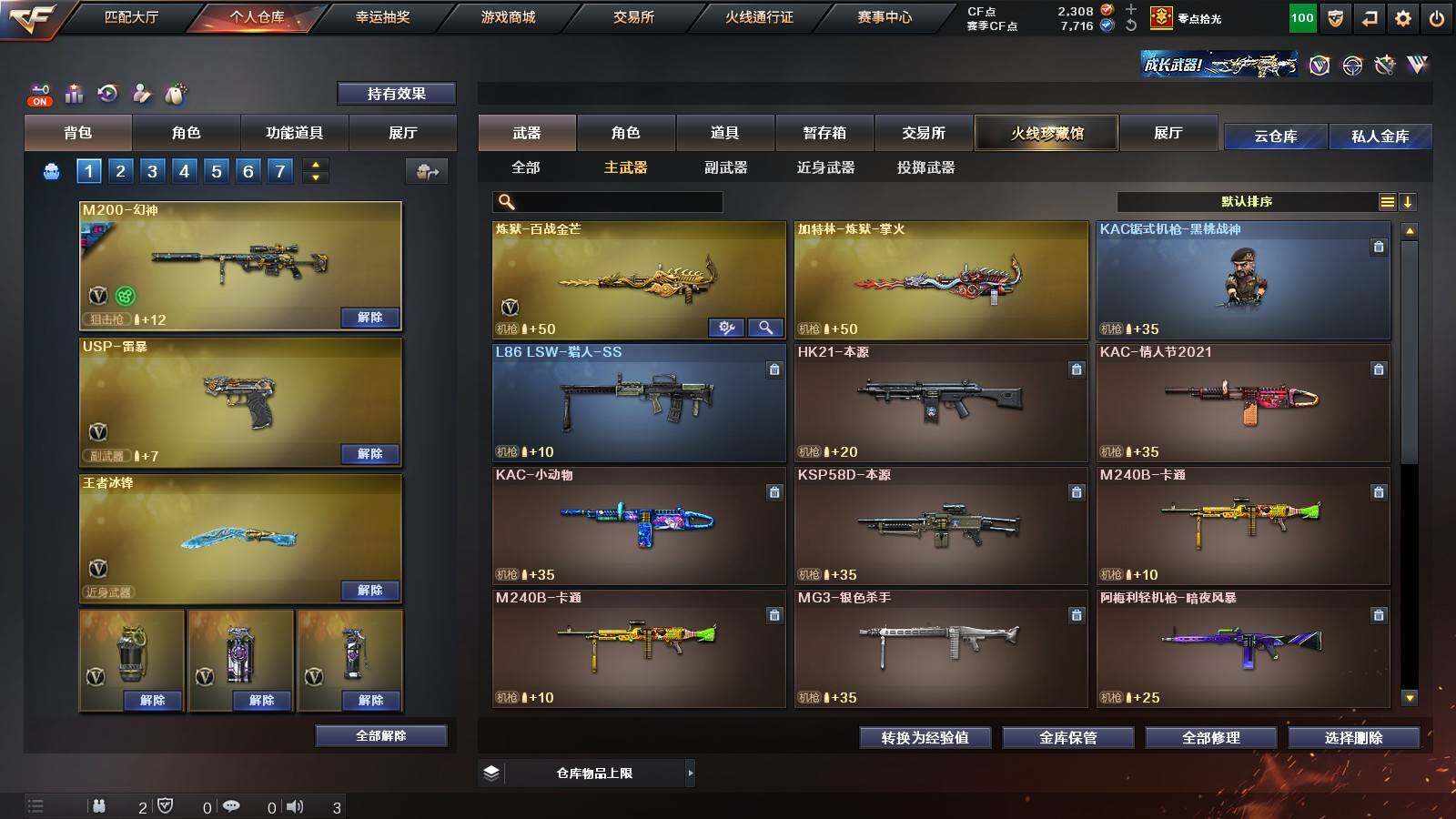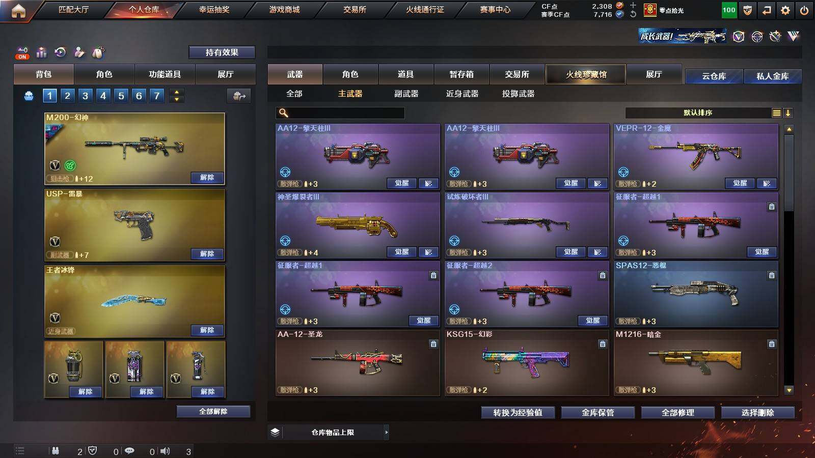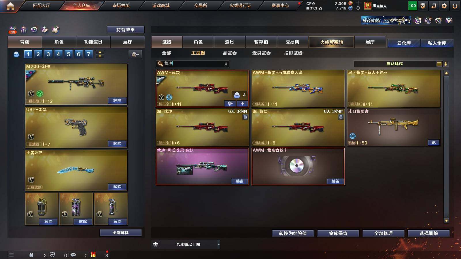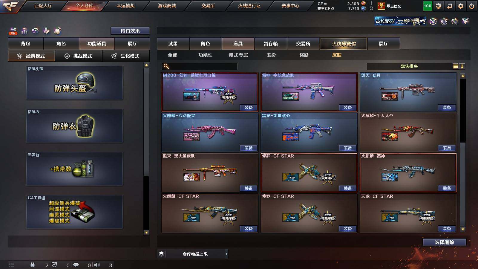 【英雄级武器】:柯尔特-竞技荣光,擎天-竞技荣光,高爆手雷-竞技荣光*2,烟雾弹-竞技荣光,闪光弹-竞技荣光,USP-雷暴,FAMAS G2-天戎,G36C-幻影,QBZ03-金色蔷薇,M4A1-青龙,金色蔷薇-古蛇迷踪,无影-神兵利器,M4A1-雷神,M4A1-黑骑士,AK47-火麒麟,AWM-裁决,QBZ03-天罚,Kar98K-星神,M200-幻神,黑武士-锦绣游龙,超新星-热带奇洋,死神-雪域霜狐,M4A1-赤狱骑士,修罗-古蛇迷踪,沙鹰-天神,沙鹰-修罗,炽芒蝶刃,擎天,擎天-云海游龙,龙啸-热带奇洋