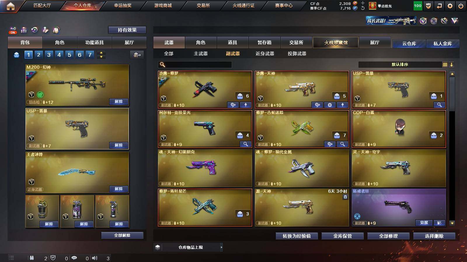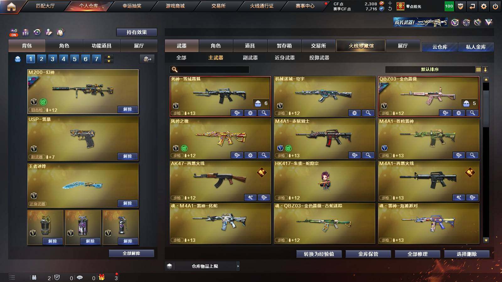 【热门武器】:G36C-幻影,QBZ03-金色蔷薇,M4A1-青龙,M200-幻神,金色蔷薇-古蛇迷踪,修罗-古蛇迷踪,凤吟之魄,Kar98K-星神,金色小号,C.A.T,牛牛-AK47,M4A1-黑骑士,MK5-炽火炎龙,毁灭-孙三炮,COP-白鲨,USP-雷暴,沙鹰-修罗,炽芒蝶刃