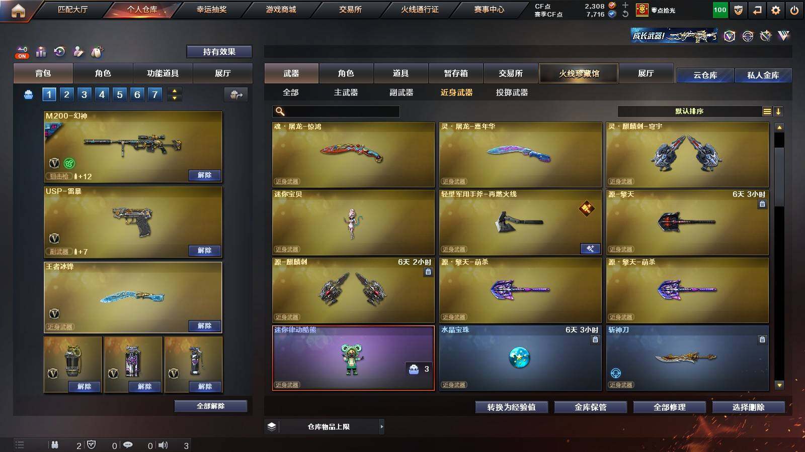 【人偶武器】:MK5-炽火炎龙,COP-白鲨,毁灭-孙三炮,C.A.T,牛牛-AK47,迷你裂空之翼,迷你牛魔王,迷你波特博士*7,迷你牛牛,迷你火种*6,灵狐娃娃手雷