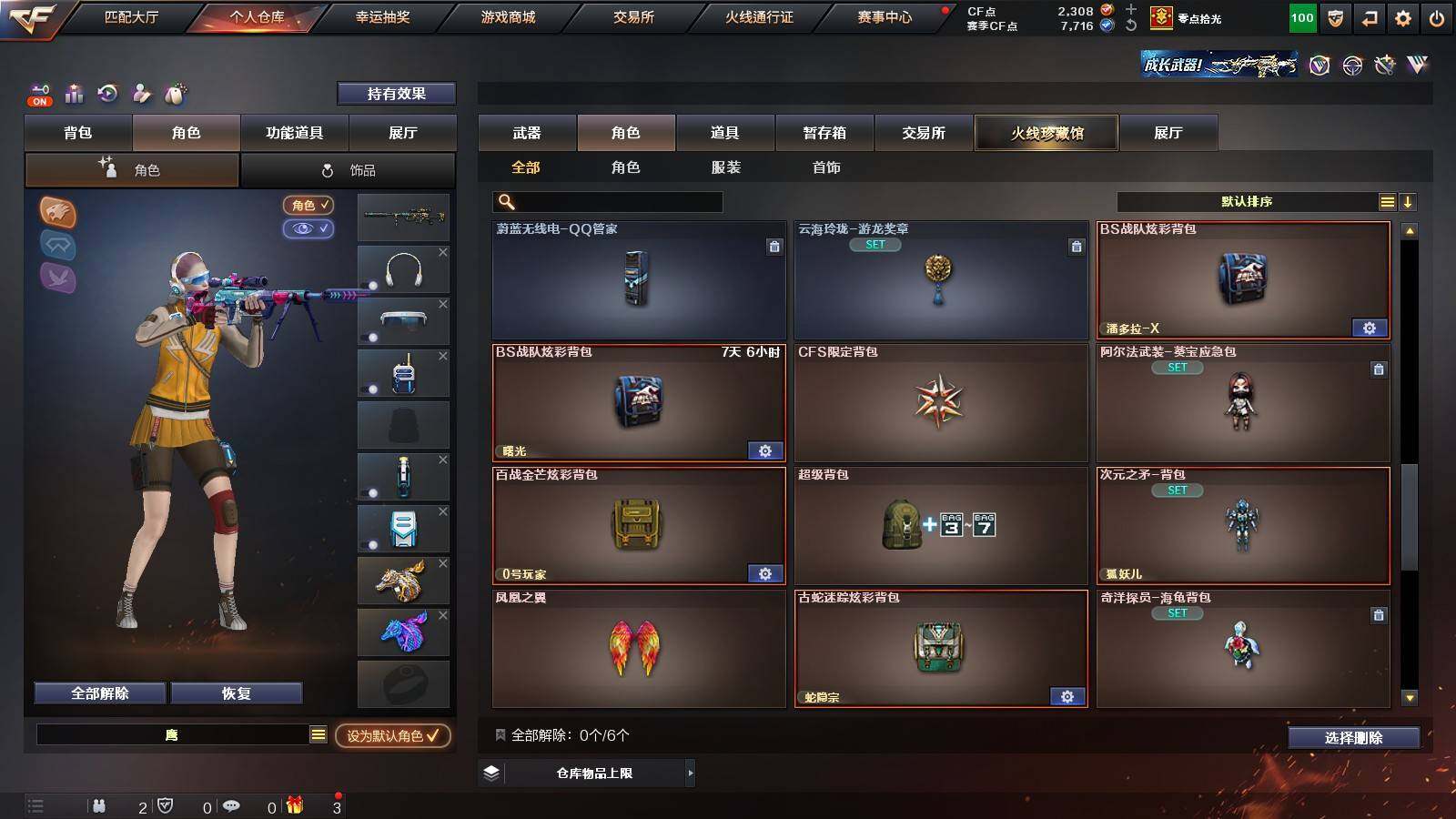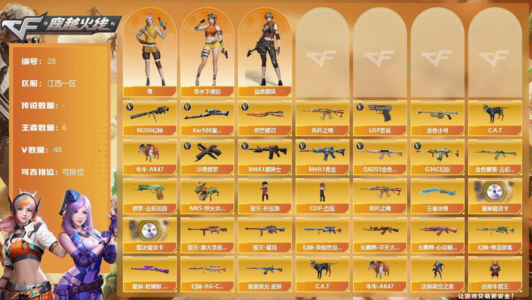 [12631766]江西一区-48V-6王者-0炫金 【热门武器】:G36C-幻影,QBZ03-金色蔷薇,M4A1-青龙,M200-幻神,金色蔷薇-古蛇迷踪,修罗-古蛇迷踪,凤吟之魄,Kar98K-星神,金色小号,C.A.T,牛牛-AK47,M4A1-黑骑士,MK5-炽火炎龙,毁灭-孙三炮,COP-白鲨,USP-雷暴,沙鹰-修罗,炽芒蝶刃 【王者炫金武器】:王者凰鸣-觉醒版,凤吟之魄,王者冰锋 【音效卡】:AWM-裁决音效卡,Kar98K-星神音效卡 【稀有皮肤】:M200-幻神-荣耀世冠白鲨,幻神-电流骇客 皮肤,幻神-AG-CFPL S24冠军 皮肤,星神-枪娘默 皮肤,金色蔷薇-破浪逐光 皮肤,火麒麟-平天大圣,火麒麟-心动糖果,毁灭-暗月,毁灭-黑大圣皮肤 【角色】:零-水下丽影,鹰,战地猎狐 【人偶武器】:MK5-炽火炎龙,COP-白鲨,毁灭-孙三炮,C.A.T,牛牛-AK47,迷你裂空之翼,迷你牛魔王,迷你波特博士*7,迷你牛牛,迷你火种*6,灵狐娃娃手雷 【挑战大师】:神圣爆裂者III,机甲撕裂者III,惩戒者III,试炼破坏者III,VEPR-12-金魔,激光毁灭者III-白马银枪 【英雄级武器】:柯尔特-竞技荣光,擎天-竞技荣光,高爆手雷-竞技荣光*2,烟雾弹-竞技荣光,闪光弹-竞技荣光,USP-雷暴,FAMAS G2-天戎,G36C-幻影,QBZ03-金色蔷薇,M4A1-青龙,金色蔷薇-古蛇迷踪,无影-神兵利器,M4A1-雷神,M4A1-黑骑士,AK47-火麒麟,AWM-裁决,QBZ03-天罚,Kar98K-星神,M200-幻神,黑武士-锦绣游龙,超新星-热带奇洋,死神-雪域霜狐,M4A1-赤狱骑士,修罗-古蛇迷踪,沙鹰-天神,沙鹰-修罗,炽芒蝶刃,擎天,擎天-云海游龙,龙啸-热带奇洋 【特殊枪械】:1黑骑士