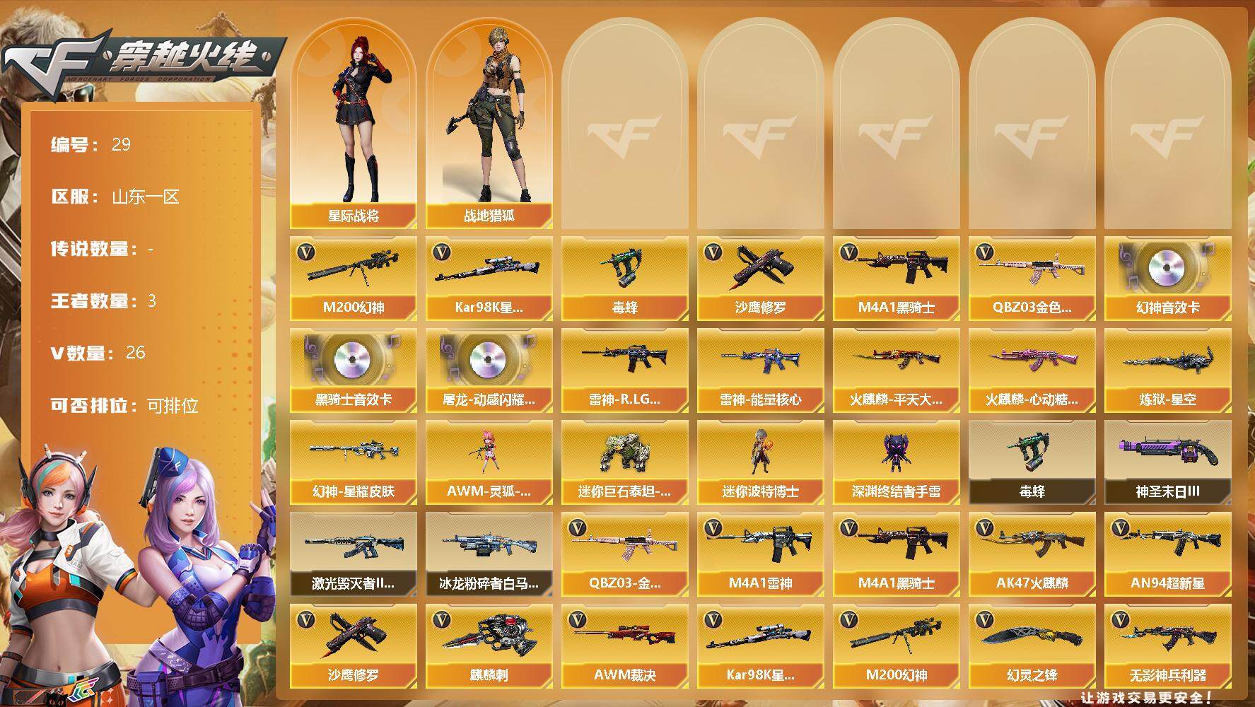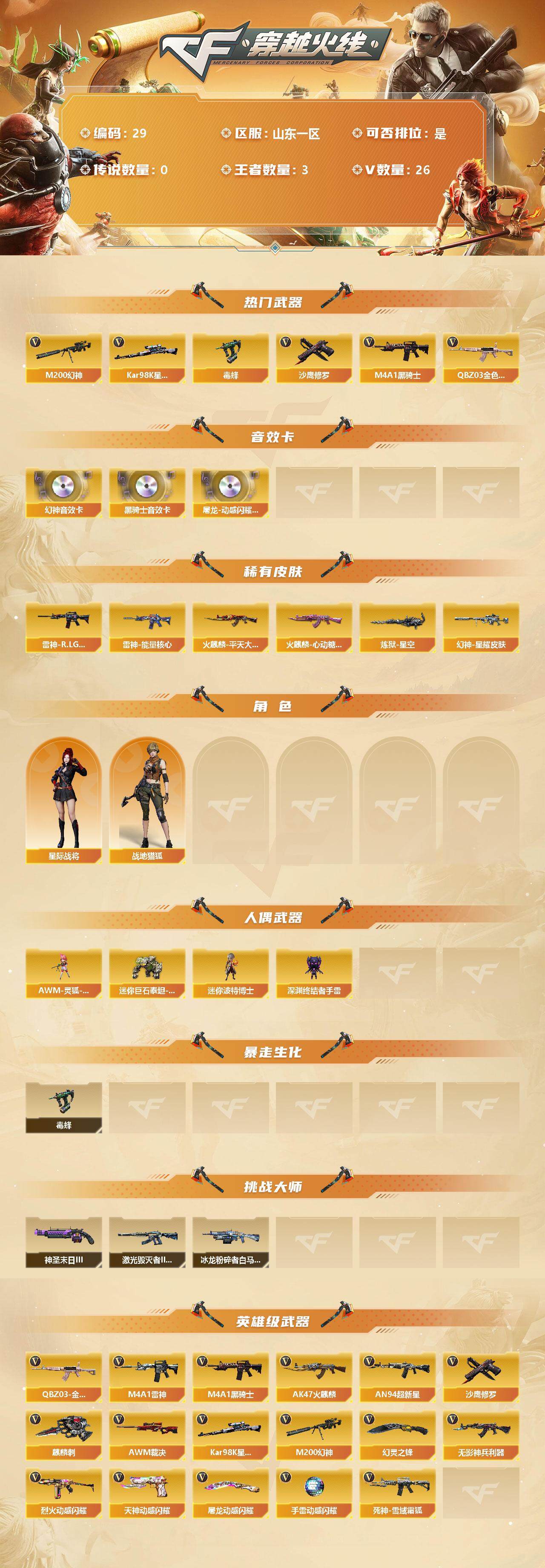 [12632073]山东一区-26V-3王者-0炫金 【热门武器】:QBZ03-金色蔷薇,M200-幻神,Kar98K-星神,毒蜂,M4A1-黑骑士,沙鹰-修罗 【音效卡】:屠龙-动感闪耀 音效卡,M200-幻神音效卡,M4A1-黑骑士音效卡 【稀有皮肤】:幻神-星耀 皮肤,雷神-能量核心,雷神-R.LGD-CFPLS18冠军,火麒麟-平天大圣,火麒麟-心动糖果,炼狱-星空 【角色】:星际战将,战地猎狐 【人偶武器】:AWM-灵狐-15周年嘉年华,迷你巨石泰坦-魔花研究所,迷你波特博士,深渊终结者手雷*2 【暴走生化】:毒蜂 【挑战大师】:神圣爆裂者-末日III,激光毁灭者III-白马银枪*2,冰龙粉碎者-白马银枪 【英雄级武器】:幻灵之锋,烈火-动感闪耀,天神-动感闪耀,屠龙-动感闪耀,手雷-动感闪耀,QBZ03-金色蔷薇,无影-神兵利器,M4A1-雷神,M4A1-黑骑士,AK47-火麒麟*2,AN94-超新星,AWM-裁决,Kar98K-星神,M200-幻神,死神-雪域霜狐,沙鹰-修罗,麒麟刺 【特殊枪械】:1黑骑士