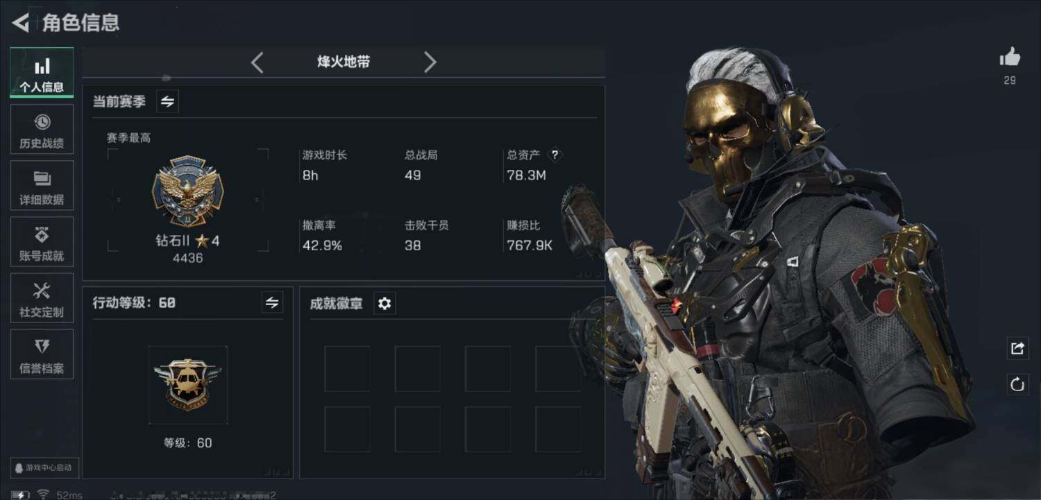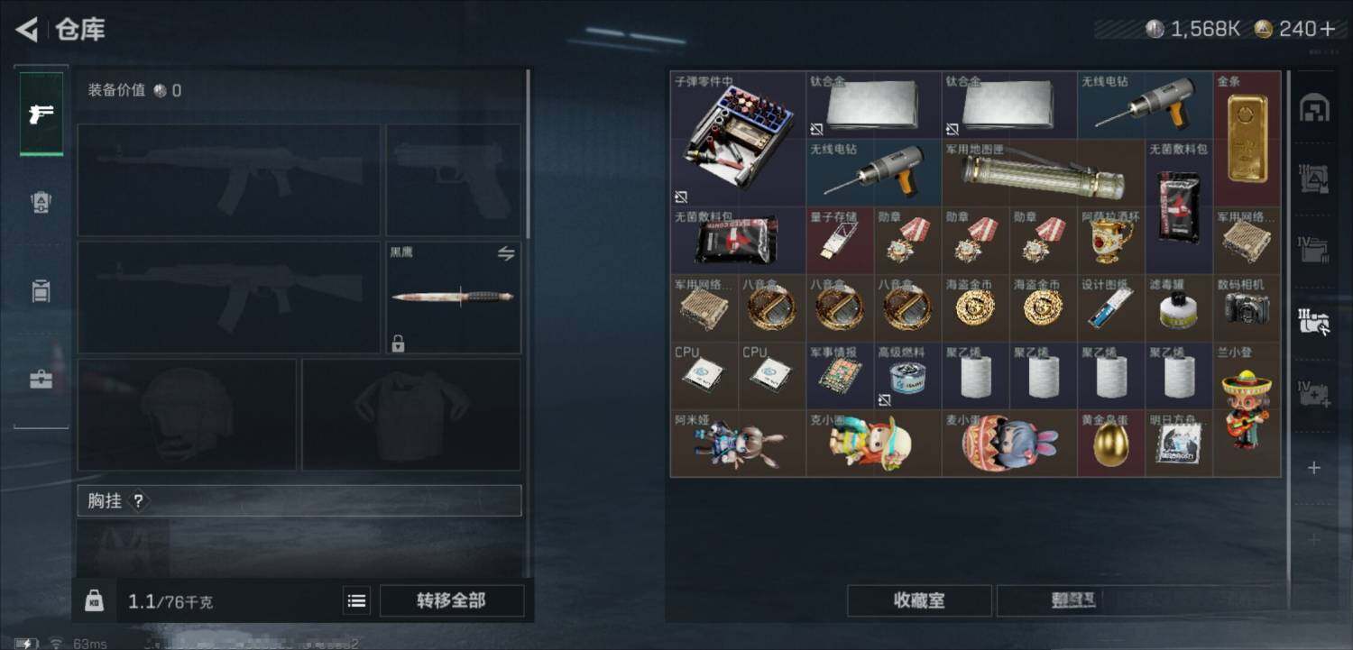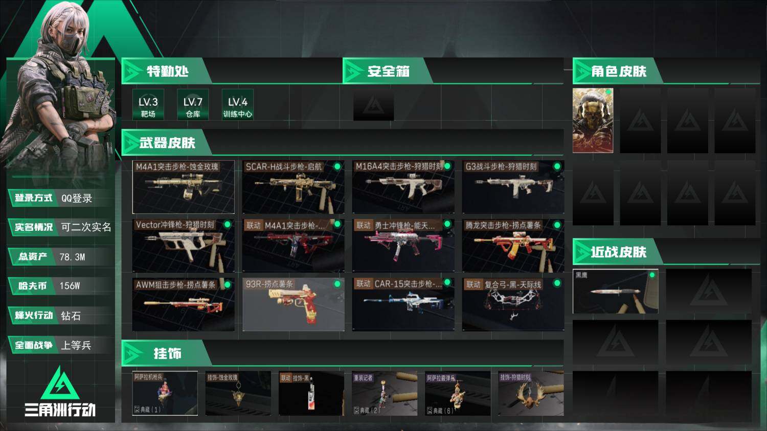 [12633407]v26931总资产:78.3M,哈夫币:156W,武器皮肤90,烽火60级:钻石,战场20级:上等兵,通行证29级:通行证免费版 【安全箱】基础安全箱;【特勤处等级】仓库LV.7,指挥中心LV.3,训练中心LV.4,靶场LV.3,潜水中心LV.0,收藏室LV.1;【干员皮肤1】:红狼蚀金玫瑰;【已有捆绑包3】:蚀金玫瑰捆绑包,捞点薯条捆绑包,狩猎时刻捆绑包;【近战皮肤】:近战武器-黑鹰;【步枪皮肤】:M4A1突击步枪-蚀金玫瑰,SCAR-H战斗步枪-启航,M16A4突击步枪-狩猎时刻,G3战斗步枪-狩猎时刻,M4A1突击步枪-阿米娅,腾龙突击步枪-捞点薯条,CAR-15突击步枪-阿米娅,AUG突击步枪-蛇,M16A4突击步枪-竞赛选手,PTR-32突击步枪-英雄,QBZ95-1突击步枪-曙光,AKM突击步枪-林中猎手,QBZ95-1突击步枪-公平竞技,SCAR-H战斗步枪-荣耀列队,PTR-32突击步枪-天网,G3战斗步枪-幻影结构,SCAR-H战斗步枪-童趣,M16A4突击步枪-高雅黑,SCAR-H战斗步枪-数码,K437突击步枪-轻奢武装,QBZ95-1突击步枪-高雅黑,AUG突击步枪-浅蓝涂装,PTR-32突击步枪-黄蜂,M16A4突击步枪-山林猎人,QBZ95-1突击步枪-海浪,K416突击步枪-高雅黑,M4A1突击步枪-海色,SG552突击步枪-浅蓝涂装,AK-12突击步枪-落花,QBZ95-1突击步枪-海色,M4A1突击步枪-高雅黑,腾龙突击步枪-三角洲力量,M4A1突击步枪-粉色涂装,K416突击步枪-几何解构,M7战斗步枪-红色彗星,SG552突击步枪-海浪;【冲锋枪皮肤】:Vector冲锋枪-狩猎时刻,勇士冲锋枪-能天使-午夜邮差,SR-3M紧凑突击步枪-战,勇士冲锋枪-工业狂潮,P90冲锋枪-紧急戒备;【射手步枪皮肤】:SVD狙击步枪-暗夜猎手;【狙击步枪皮肤】:AWM狙击步枪-捞点薯条,SV-98狙击步枪-囚徒,SV-98狙击步枪-林中猎手,M700狙击步枪-竞技风;【霰弹枪皮肤】:M1014霰弹枪-林中猎手;【轻机枪皮肤】:QJB201轻机枪-Old Habits,M250通用机枪-囚徒;【手枪皮肤】:93R-捞点薯条;【挂饰8】:阿萨拉机枪兵,挂饰-蚀金玫瑰,挂饰-黑,重装记者,阿萨拉霰弹兵,挂饰-狩猎时刻,挂饰-阿米娅,挂饰-来点薯条;