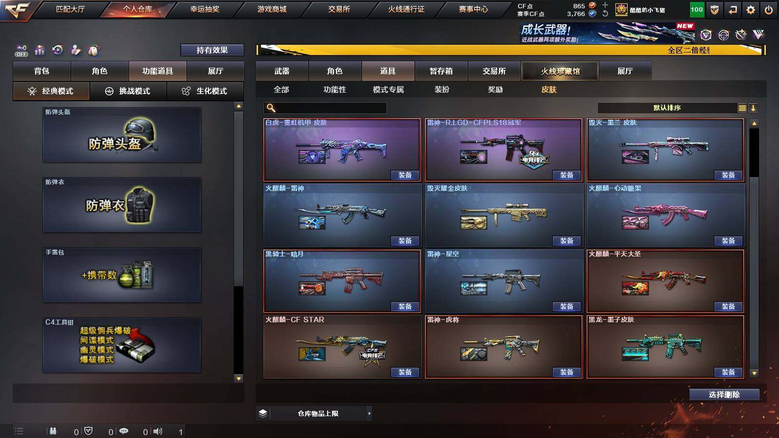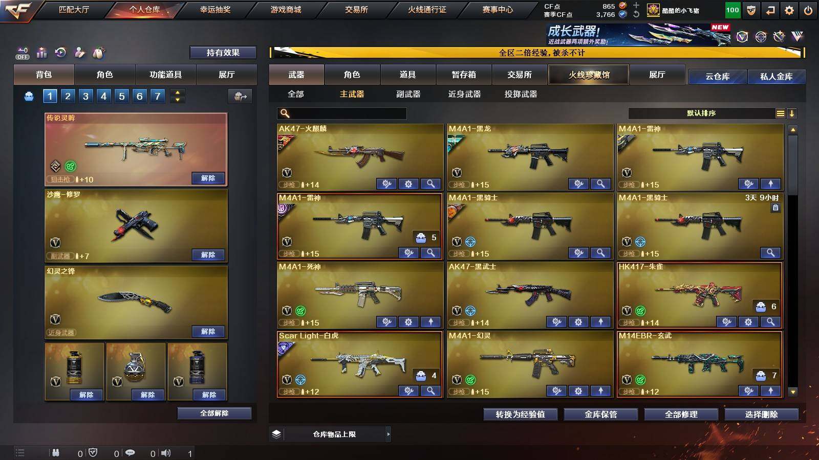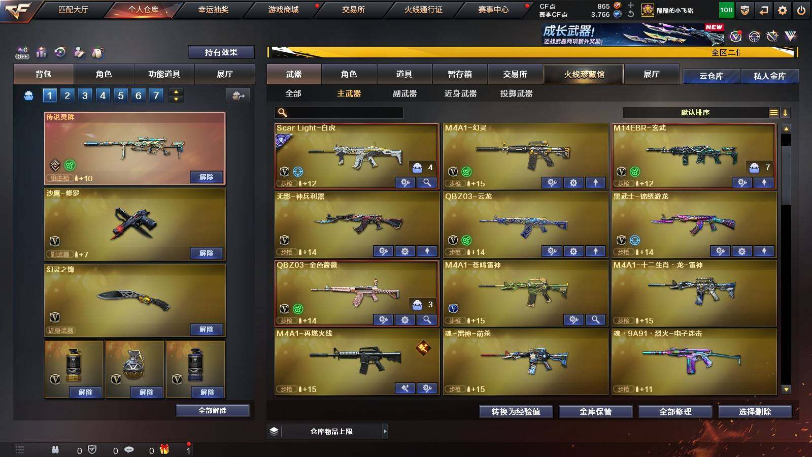 【热门武器】:传说灵眸,QBZ03-金色蔷薇,M14EBR-玄武,Scar Light-白虎,HK417-朱雀,M200-幻神,M200-竞技荣光,M4A1-黑骑士,沙鹰-修罗*3