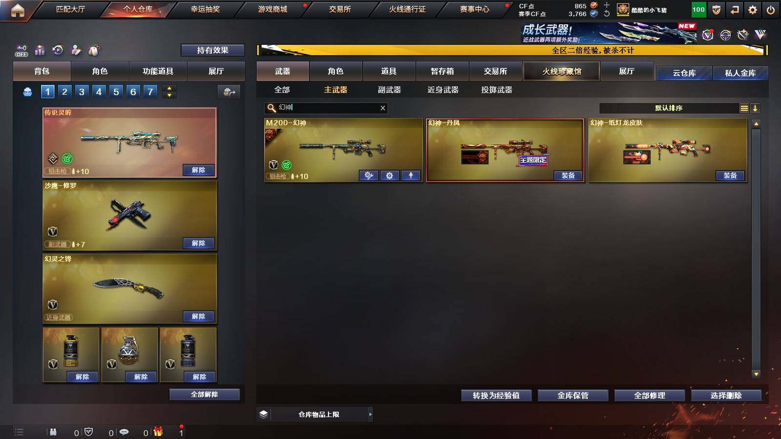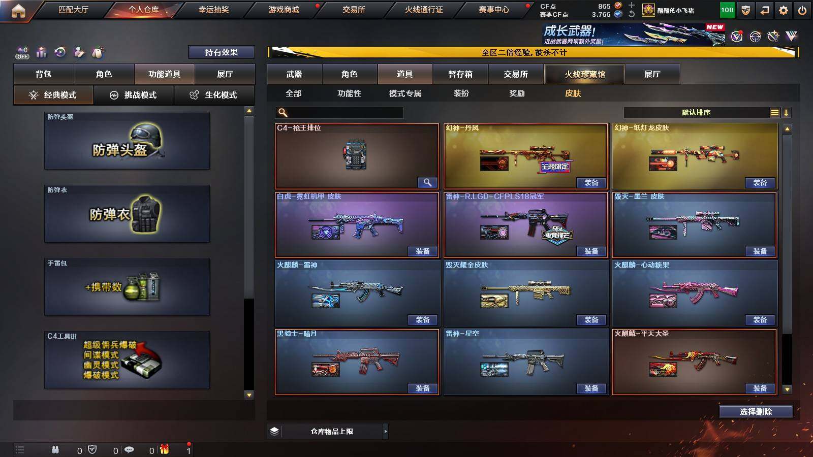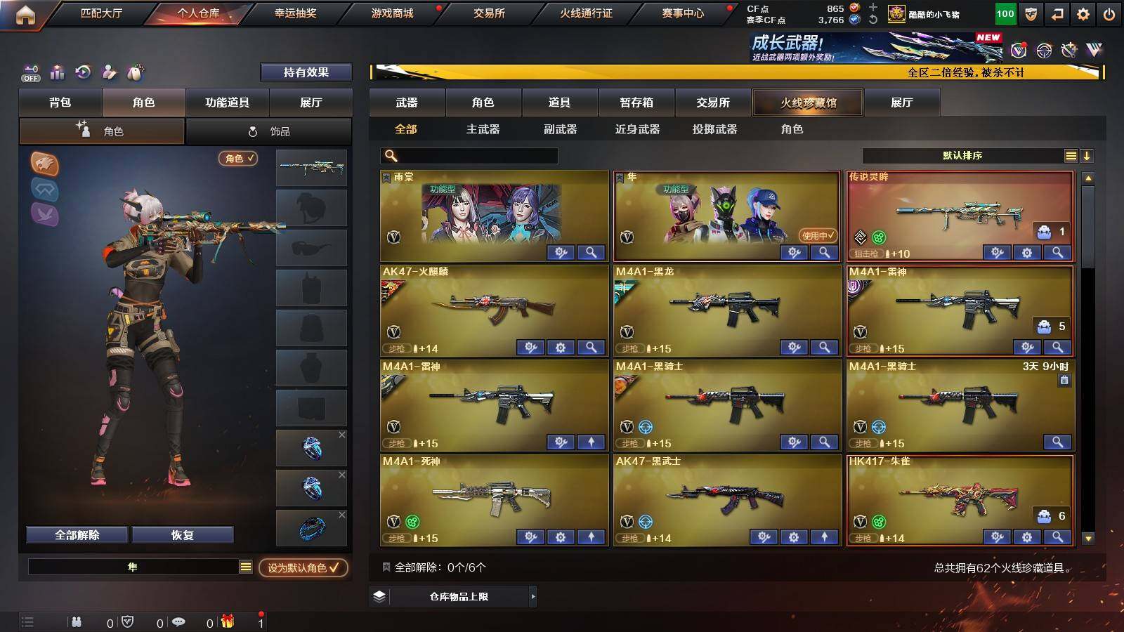 【热门武器】:传说灵眸,QBZ03-金色蔷薇,M14EBR-玄武,Scar Light-白虎,HK417-朱雀,M200-幻神,M200-竞技荣光,M4A1-黑骑士,沙鹰-修罗*3