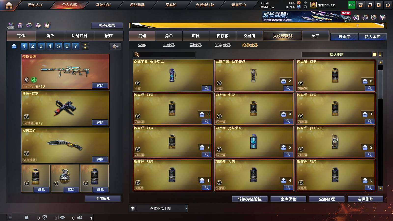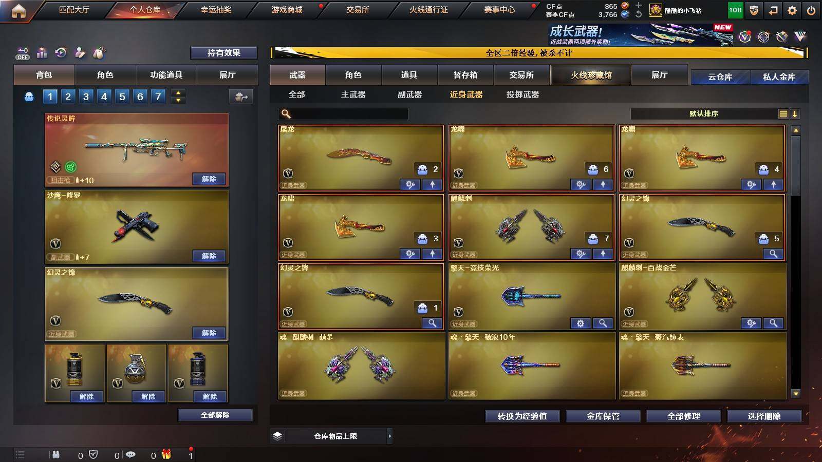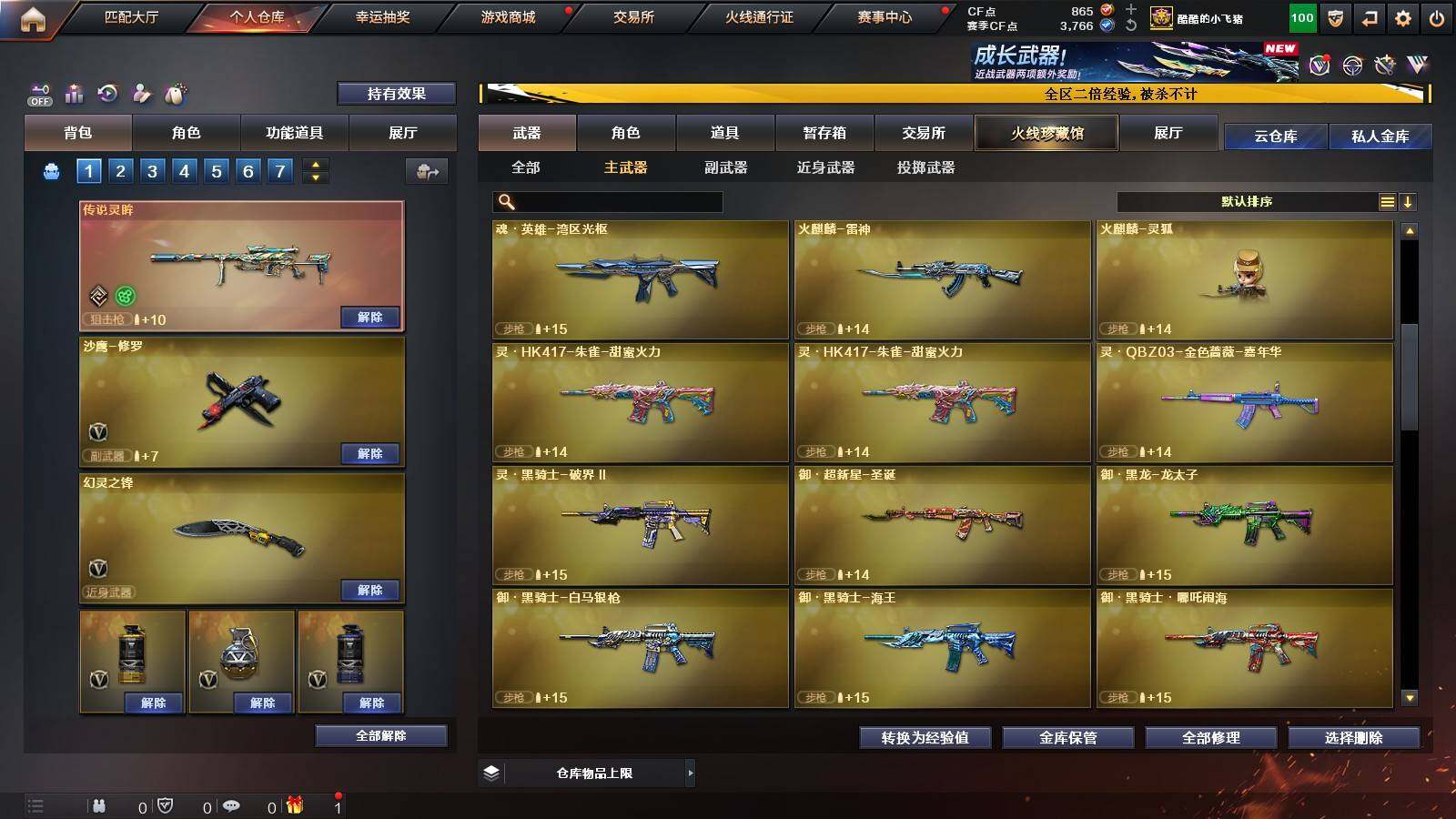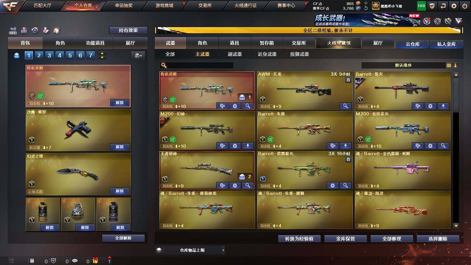【英雄级武器】:QBZ03-云龙,M200-竞技荣光,擎天-竞技荣光,高爆手雷-竞技荣光,烟雾弹-竞技荣光,闪光弹-竞技荣光,M4A1-幻灵,幻灵之锋*2,QBZ03-金色蔷薇,M14EBR-玄武,Scar Light-白虎,HK417-朱雀,无影-神兵利器,M4A1-雷神*2,M4A1-黑龙,M4A1-黑骑士,M4A1-死神,AK47-火麒麟,AK47-黑武士,Barrett-毁灭,AA-12-雷霆,Barrett-朱雀,M200-幻神,黑武士-锦绣游龙,沙鹰-修罗*3,麒麟刺,龙啸*3,屠龙