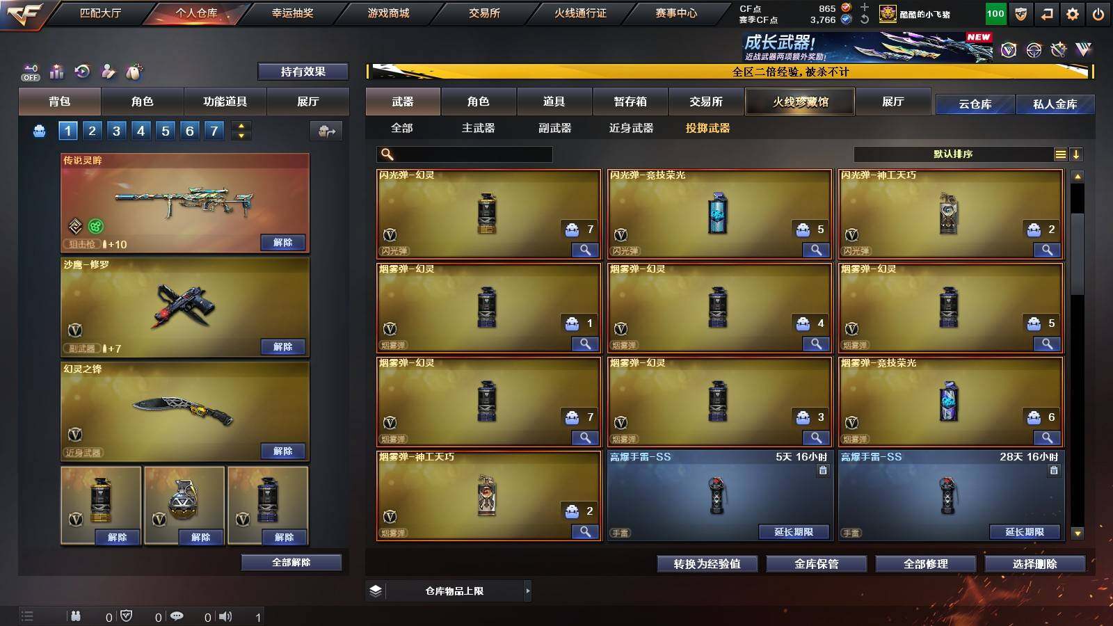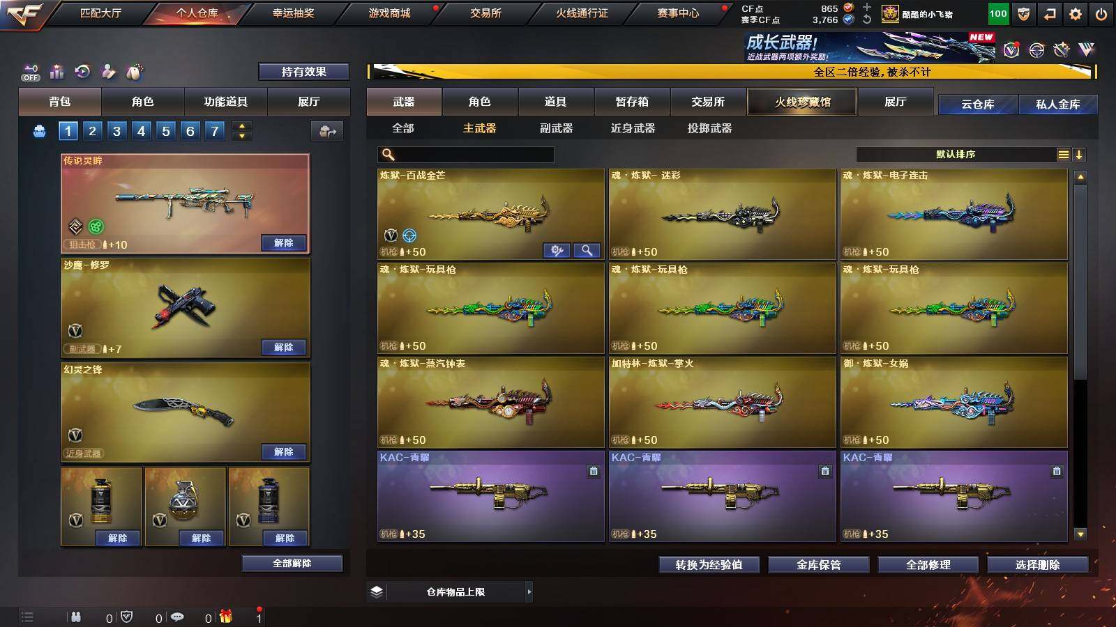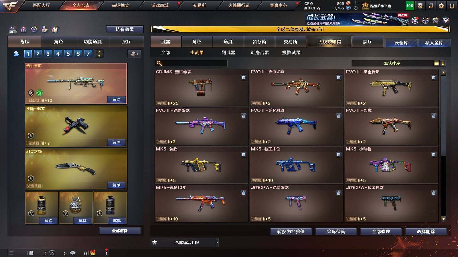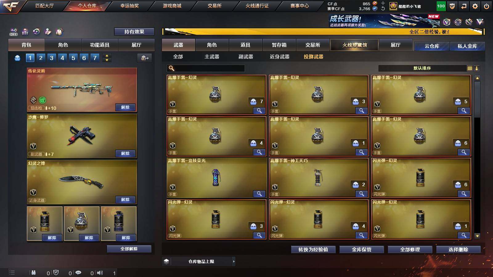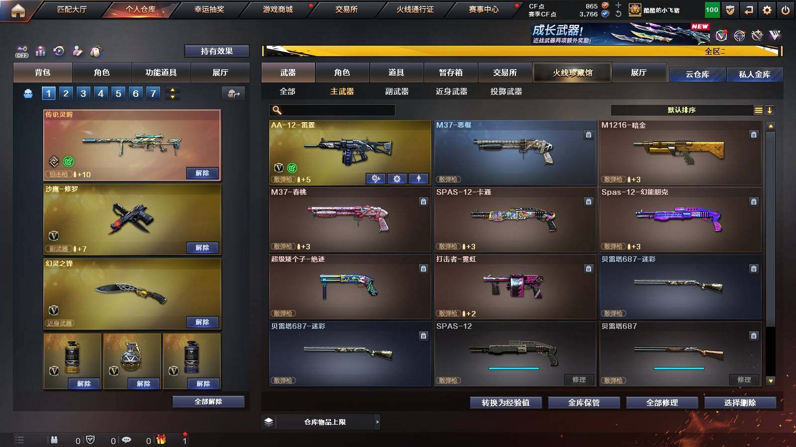 【英雄级武器】:QBZ03-云龙,M200-竞技荣光,擎天-竞技荣光,高爆手雷-竞技荣光,烟雾弹-竞技荣光,闪光弹-竞技荣光,M4A1-幻灵,幻灵之锋*2,QBZ03-金色蔷薇,M14EBR-玄武,Scar Light-白虎,HK417-朱雀,无影-神兵利器,M4A1-雷神*2,M4A1-黑龙,M4A1-黑骑士,M4A1-死神,AK47-火麒麟,AK47-黑武士,Barrett-毁灭,AA-12-雷霆,Barrett-朱雀,M200-幻神,黑武士-锦绣游龙,沙鹰-修罗*3,麒麟刺,龙啸*3,屠龙