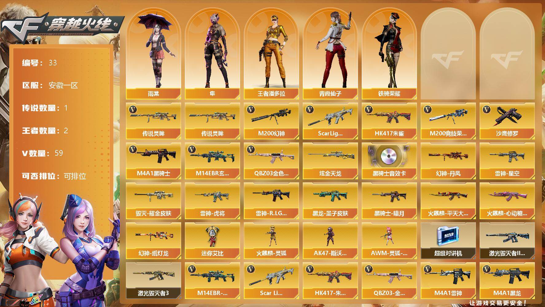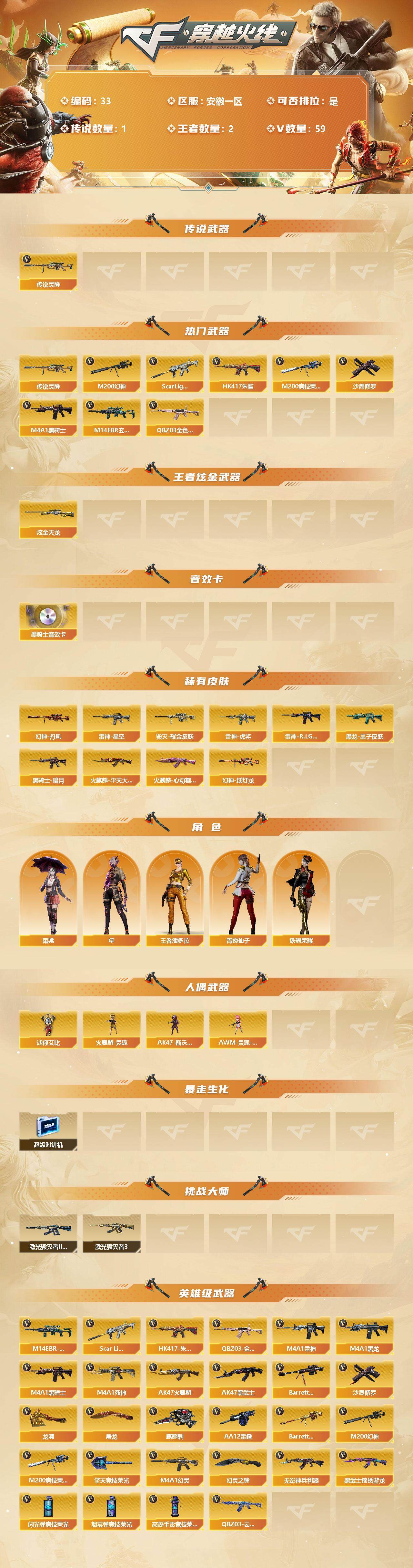 [12633487]安徽一区-59V-2王者-1炫金 【传说武器】:传说灵眸 【热门武器】:传说灵眸,QBZ03-金色蔷薇,M14EBR-玄武,Scar Light-白虎,HK417-朱雀,M200-幻神,M200-竞技荣光,M4A1-黑骑士,沙鹰-修罗*3 【王者炫金武器】:炫金天龙 【音效卡】:M4A1-黑骑士音效卡 【稀有皮肤】:幻神-丹凤,幻神-纸灯龙皮肤,雷神-星空,雷神-虎将,雷神-R.LGD-CFPLS18冠军,火麒麟-平天大圣,火麒麟-心动糖果,黑骑士-暗月,黑龙-墨子皮肤,毁灭耀金皮肤 【角色】:王者潘多拉,雨棠,隼,铁骑荣耀,青霞仙子 【人偶武器】:火麒麟-灵狐,AK47-斯沃特,AWM-灵狐-15周年嘉年华,迷你艾比 【暴走生化】:超级对讲机 【挑战大师】:激光毁灭者III*2,激光毁灭者III-白马银枪 【英雄级武器】:QBZ03-云龙,M200-竞技荣光,擎天-竞技荣光,高爆手雷-竞技荣光,烟雾弹-竞技荣光,闪光弹-竞技荣光,M4A1-幻灵,幻灵之锋*2,QBZ03-金色蔷薇,M14EBR-玄武,Scar Light-白虎,HK417-朱雀,无影-神兵利器,M4A1-雷神*2,M4A1-黑龙,M4A1-黑骑士,M4A1-死神,AK47-火麒麟,AK47-黑武士,Barrett-毁灭,AA-12-雷霆,Barrett-朱雀,M200-幻神,黑武士-锦绣游龙,沙鹰-修罗*3,麒麟刺,龙啸*3,屠龙 【特殊枪械】:1白虎,1黑骑士