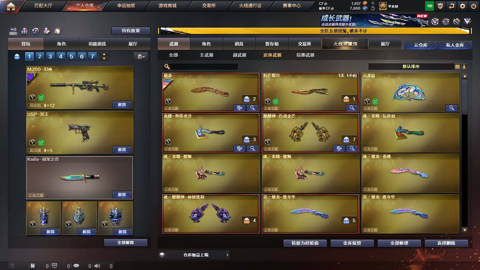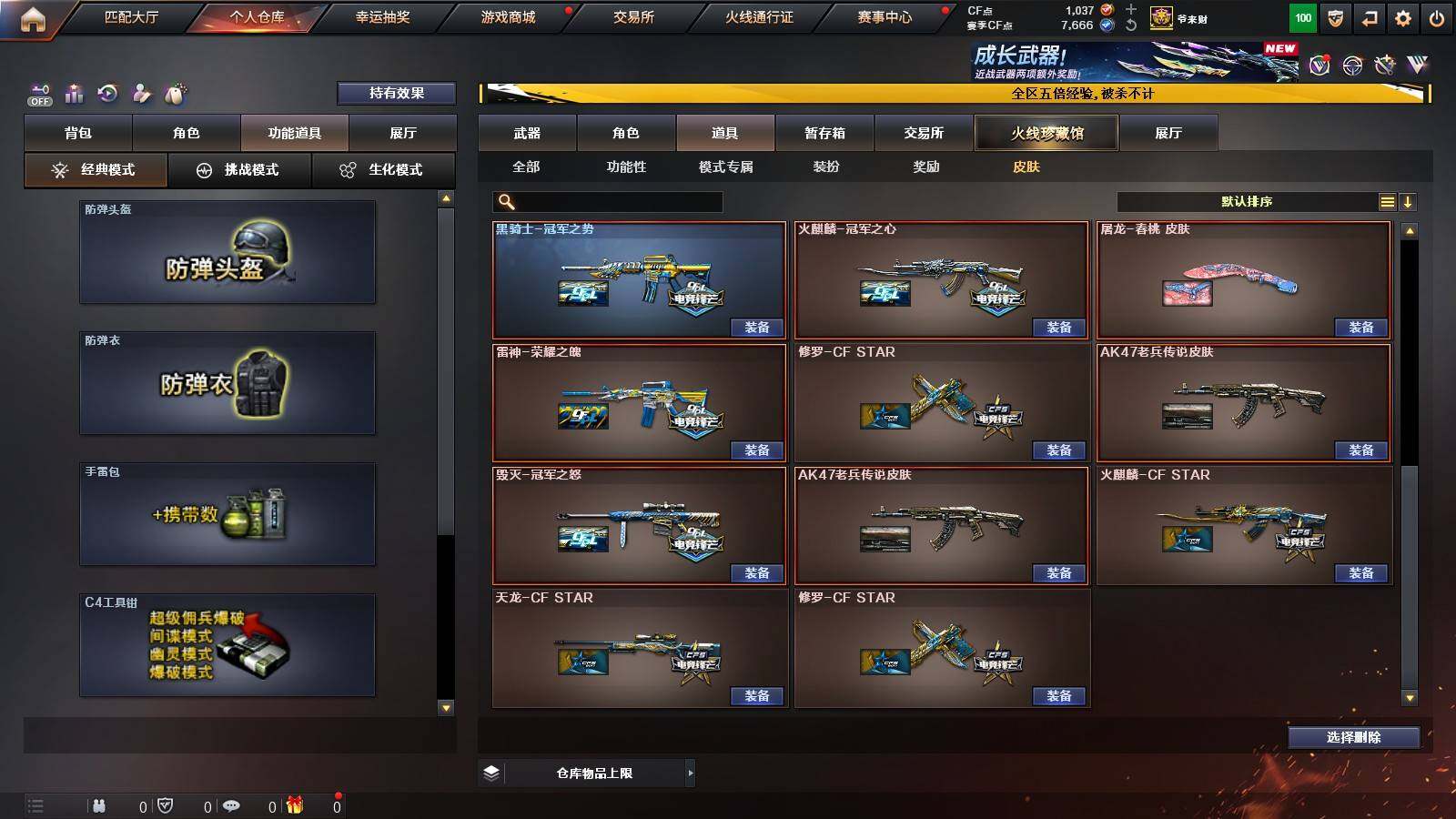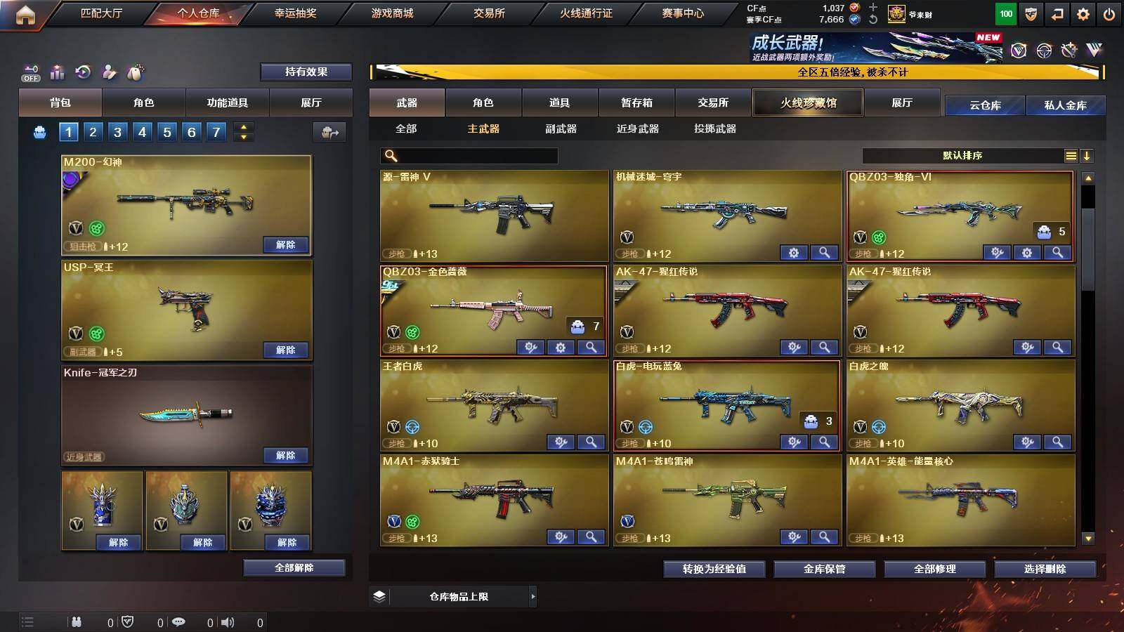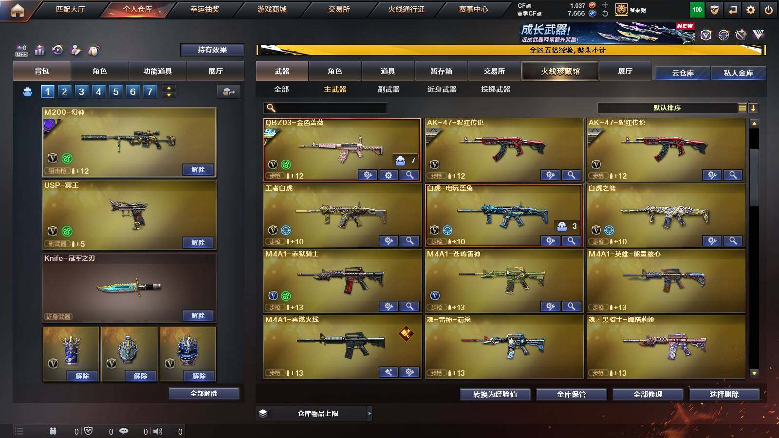 【热门武器】:QBZ03-金色蔷薇,M200-幻神,白虎-电玩蓝兔,Cat-刀锋,M4A1-黑骑士,汤姆逊-烈龙*6,斯泰尔-蝴蝶,MK5-炽火炎龙,沙鹰-修罗*4,Knife-冠军之刃