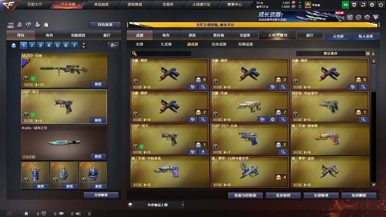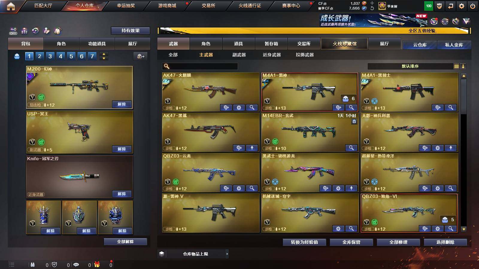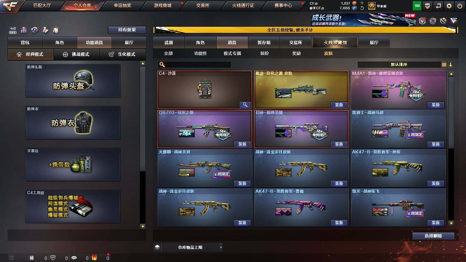 【热门武器】:QBZ03-金色蔷薇,M200-幻神,白虎-电玩蓝兔,Cat-刀锋,M4A1-黑骑士,汤姆逊-烈龙*6,斯泰尔-蝴蝶,MK5-炽火炎龙,沙鹰-修罗*4,Knife-冠军之刃