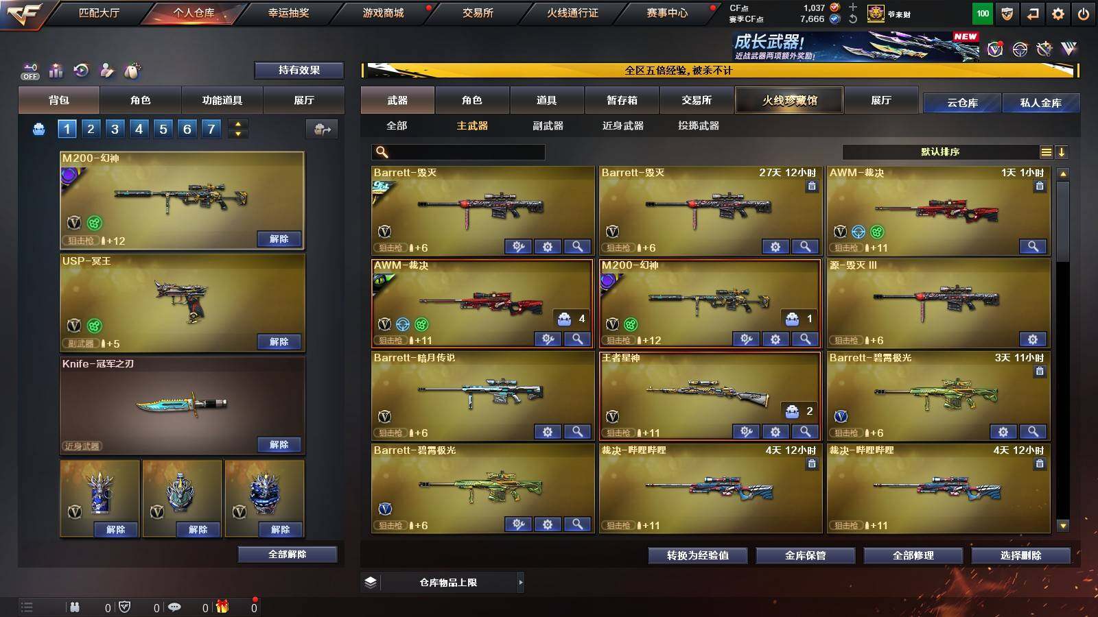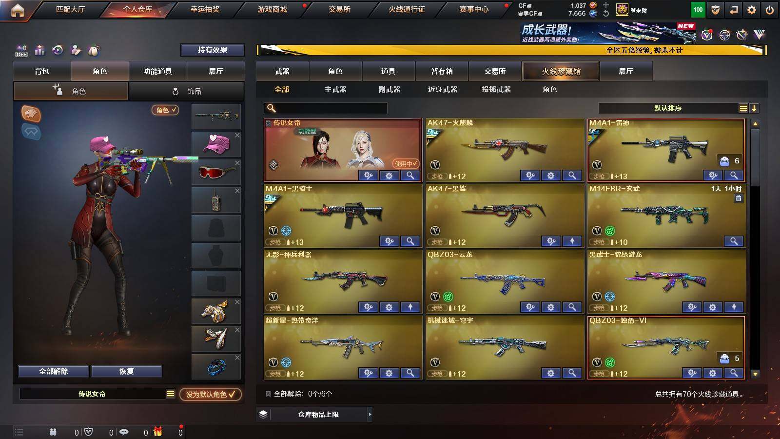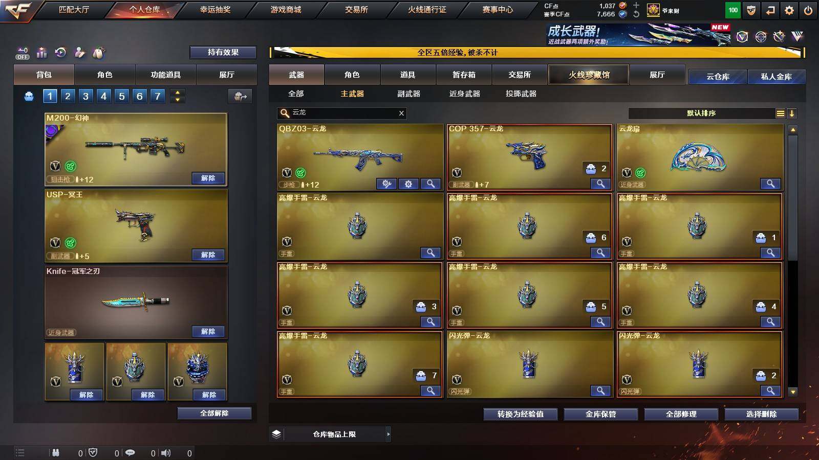 【英雄级武器】:QBZ03-云龙,COP 357-云龙,柯尔特-电竞装甲,QBZ03-金色蔷薇,白虎-电玩蓝兔,无影-神兵利器,M4A1-雷神,M4A1-黑骑士,汤姆逊-烈龙*6,AK47-火麒麟,Barrett-毁灭,AWM-裁决,M200-幻神,AK47-黑鲨,黑武士-锦绣游龙,超新星-热带奇洋,AK-47-猩红传说*2,M4A1-赤狱骑士,USP-冥王,沙鹰-天神,沙鹰-修罗*4,屠龙,龙啸-热带奇洋