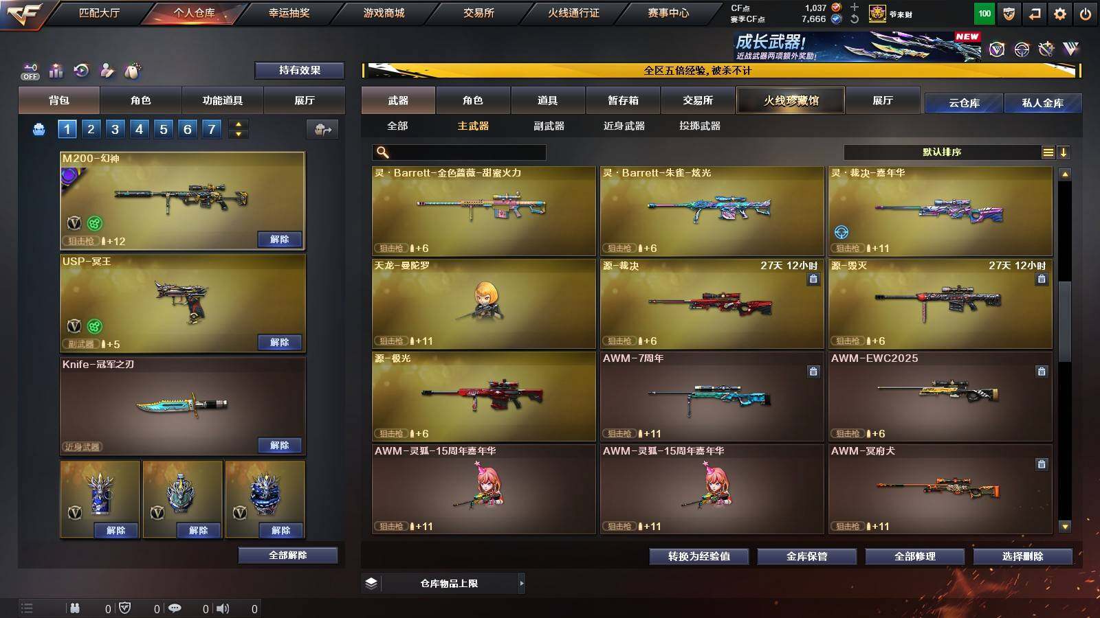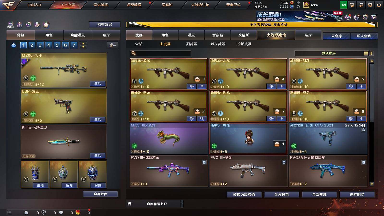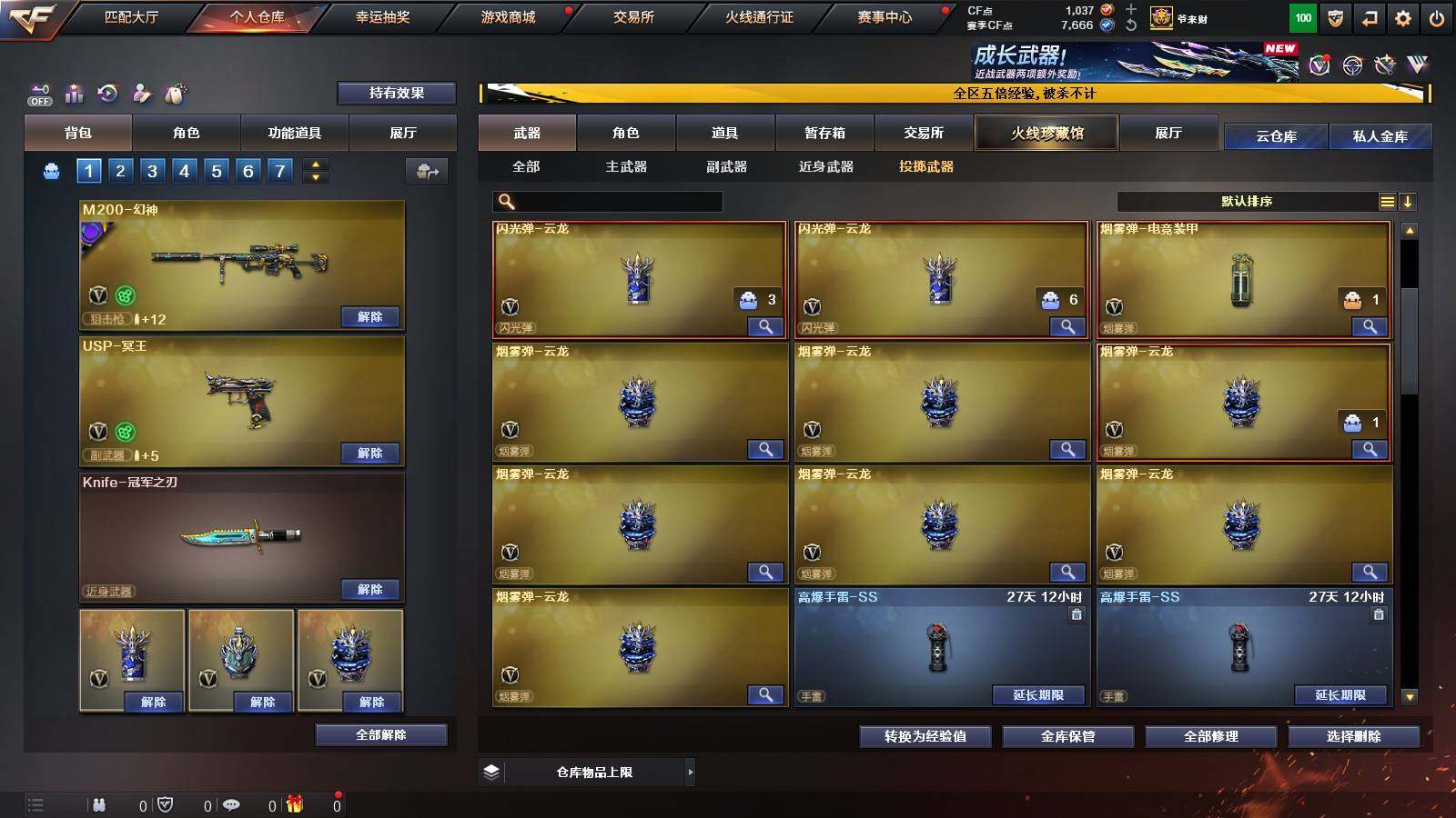 【英雄级武器】:QBZ03-云龙,COP 357-云龙,柯尔特-电竞装甲,QBZ03-金色蔷薇,白虎-电玩蓝兔,无影-神兵利器,M4A1-雷神,M4A1-黑骑士,汤姆逊-烈龙*6,AK47-火麒麟,Barrett-毁灭,AWM-裁决,M200-幻神,AK47-黑鲨,黑武士-锦绣游龙,超新星-热带奇洋,AK-47-猩红传说*2,M4A1-赤狱骑士,USP-冥王,沙鹰-天神,沙鹰-修罗*4,屠龙,龙啸-热带奇洋