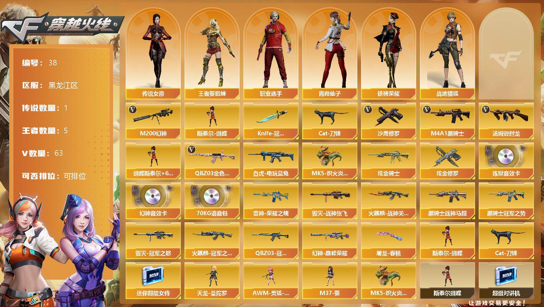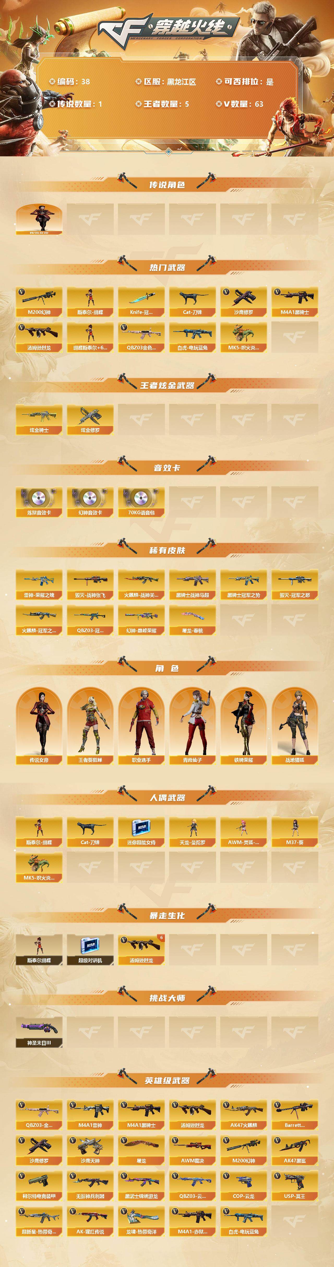[12639677]黑龙江区-63V-5王者-2炫金 【传说角色】:传说女帝 【热门武器】:QBZ03-金色蔷薇,M200-幻神,白虎-电玩蓝兔,Cat-刀锋,M4A1-黑骑士,汤姆逊-烈龙*6,斯泰尔-蝴蝶,MK5-炽火炎龙,沙鹰-修罗*4,Knife-冠军之刃 【王者炫金武器】:炫金骑士,炫金修罗 【音效卡】:M200-幻神音效卡,加特林-炼狱音效卡,70KG语音包 【稀有皮肤】:幻神-巅峰荣耀,QBZ03-冠军之薇,雷神-荣耀之魄,火麒麟-冠军之心,火麒麟-战神关羽,黑骑士-冠军之势,黑骑士-战神马超,毁灭-冠军之怒,毁灭-战神张飞,屠龙-春桃 皮肤 【角色】:传说女帝,王者-葵-貂蝉,战地猎狐,铁骑荣耀,职业选手,青霞仙子 【人偶武器】:MK5-炽火炎龙,斯泰尔-蝴蝶,天龙-曼陀罗,AWM-灵狐-15周年嘉年华*2,M37-葵,Cat-刀锋,迷你超能女侍 【暴走生化】:斯泰尔-蝴蝶,超级对讲机 【挑战大师】:神圣爆裂者-末日III 【英雄级武器】:QBZ03-云龙,COP 357-云龙,柯尔特-电竞装甲,QBZ03-金色蔷薇,白虎-电玩蓝兔,无影-神兵利器,M4A1-雷神,M4A1-黑骑士,汤姆逊-烈龙*6,AK47-火麒麟,Barrett-毁灭,AWM-裁决,M200-幻神,AK47-黑鲨,黑武士-锦绣游龙,超新星-热带奇洋,AK-47-猩红传说*2,M4A1-赤狱骑士,USP-冥王,沙鹰-天神,沙鹰-修罗*4,屠龙,龙啸-热带奇洋 【特殊枪械】:蝴蝶斯泰尔+6烈龙,1黑骑士,6烈龙,1蝴蝶斯泰尔