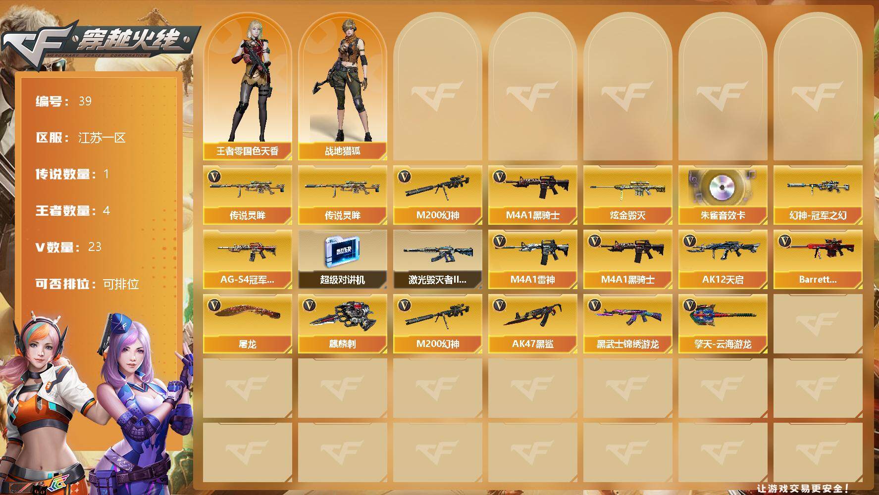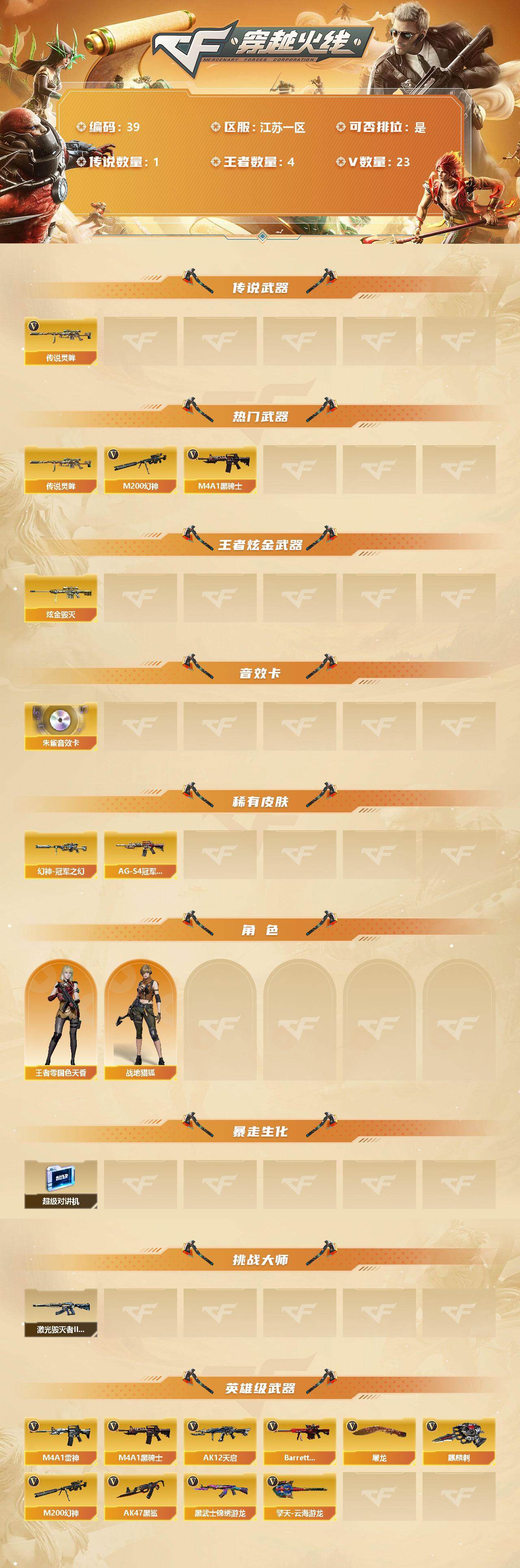 [12639733]江苏一区-23V-4王者-1炫金 【传说武器】:传说灵眸 【热门武器】:传说灵眸,M200-幻神,M4A1-黑骑士 【王者炫金武器】:炫金毁灭 【音效卡】:HK417-朱雀音效卡 【稀有皮肤】:幻神-冠军之幻,黑骑士-AG-S4冠军典藏 【角色】:王者-零-国色天香,战地猎狐 【暴走生化】:超级对讲机 【挑战大师】:激光毁灭者III-白马银枪 【英雄级武器】:M4A1-雷神,M4A1-黑骑士,AK12-天启,Barrett-极光,M200-幻神,AK47-黑鲨,黑武士-锦绣游龙,麒麟刺,屠龙,擎天-云海游龙 【特殊枪械】:1黑骑士