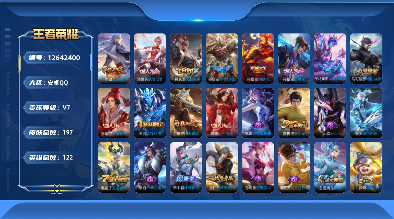 [12642400]安卓Q-V0-荣耀黄金II段位-122英雄-197皮肤-0典藏-0珍品无双-0无双-0珍品传说-5传说-43史诗
