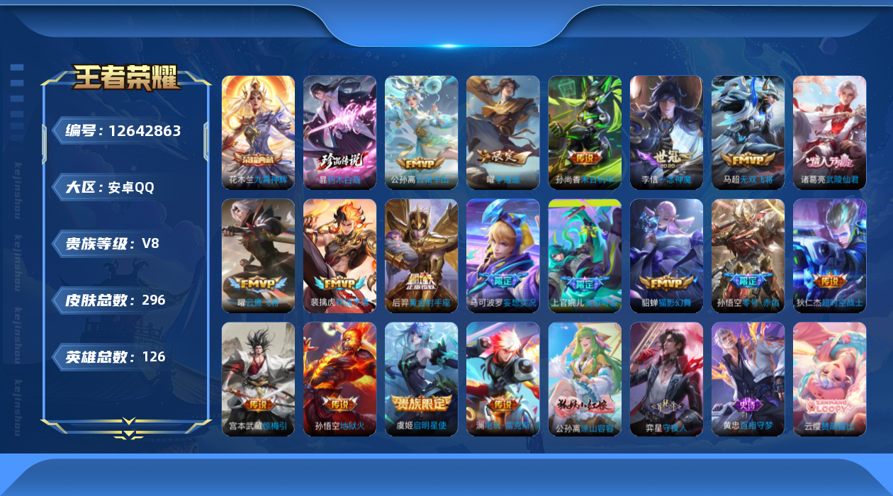 [12642863]安卓Q-V8-至尊星耀III段位-126英雄-296皮肤-1典藏-0珍品无双-0无双-1珍品传说-18传说-87史诗