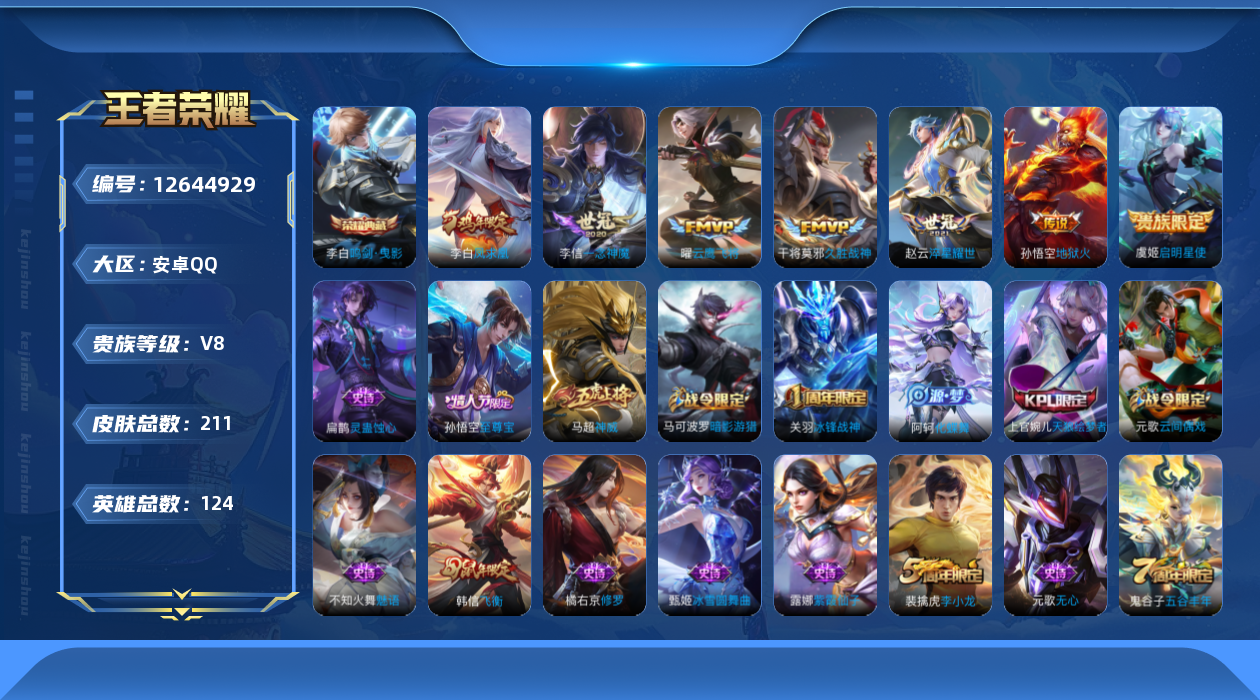 [12644929]安卓Q-V8-永恒钻石II段位-124英雄-211皮肤-1典藏-0珍品无双-0无双-0珍品传说-7传说-56史诗