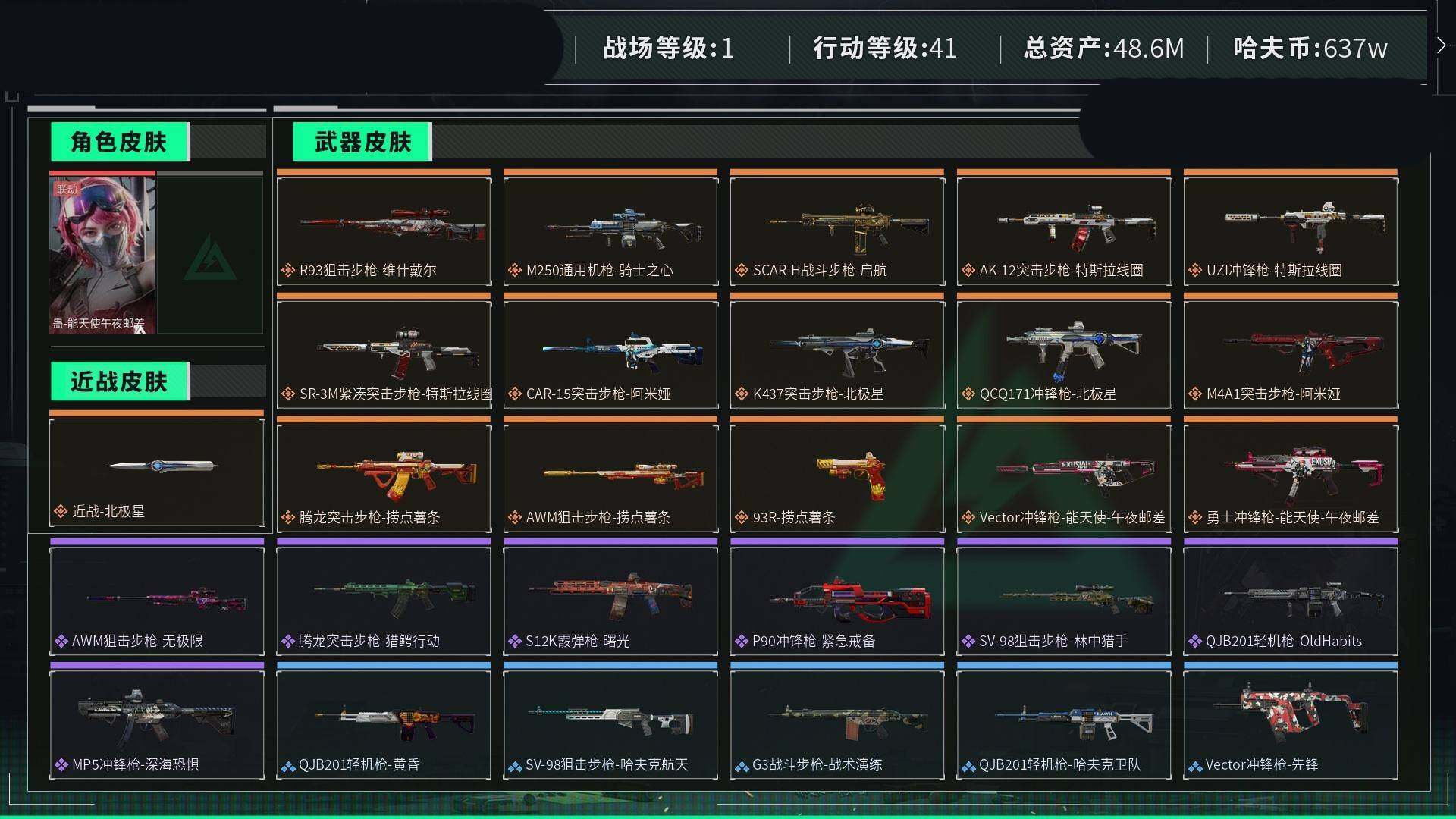 [12646108]汤39180总资产48M,哈夫币637w,近战-北极星,蛊-能天使午夜邮差,枪皮数量70,战场等级:1 无军衔,行动等级:41 青铜,安全箱等时效性道具请以游戏内数据为准;详情请看图【个人信息】战场等级:1 无军衔,行动等级:41 青铜【哈夫币】637w【总资产】48M【货币】10三角币/0曼德尔币/118三角券【安全箱】基础安全箱2(1x2)/S6高级安全箱6(2x3)【通行证】烽火地带限定版【特勤处】制药台Lv.3/工作台Lv.3/仓库Lv.5/防具台Lv.3/训练中心Lv.4/靶场Lv.3/技术中心Lv.3/指挥中心Lv.3/潜水中心Lv.1/收藏室Lv.0【角色皮肤】蛊-能天使午夜邮差/【已拥有捆绑包】北极星捆绑包/捞点薯条捆绑包/特斯拉线圈捆绑包/【近战皮肤】近战-黑鹰/近战-北极星/【步枪皮肤】K437突击步枪-北极星/CAR-15突击步枪-阿米娅/M4A1突击步枪-阿米娅/腾龙突击步枪-捞点薯条/AK-12突击步枪-特斯拉线圈/SR-3M紧凑突击步枪-特斯拉线圈/腾龙突击步枪-猎鳄行动/SCAR-H战斗步枪-启航/SR-3M紧凑突击步枪-战术竞备/【冲锋枪皮肤】UZI冲锋枪-特斯拉线圈/MP5冲锋枪-深海恐惧/QCQ171冲锋枪-北极星/勇士冲锋枪-能天使-午夜邮差/Vector冲锋枪-能天使-午夜邮差/P90冲锋枪-紧急戒备/【霰弹枪皮肤】S12K霰弹枪-曙光/【轻机枪皮肤】QJB201轻机枪-OldHabits/M250通用机枪-骑士之心/【狙击步枪皮肤】R93狙击步枪-维什戴尔/SV-98狙击步枪-林中猎手/AWM狙击步枪-捞点薯条/【手枪皮肤】93R-捞点薯条/【挂饰】诡影狙击兵/挂饰-维什戴尔/挂饰-启程/阿萨拉机枪兵/阿萨拉喷火兵/阿萨拉盾兵/挂饰-北极星/阿萨拉霰弹兵/阿萨拉狙击兵/挂饰-阿米娅/挂饰-来点薯条/挂饰-能天使/挂饰-特斯拉线圈/阿萨拉徽章/紧急会议/【载具】M1A4坦克-烈焰/(典藏皮肤颜色请以典藏展示为准,安全箱等时效性道具请以游戏内数据为准)