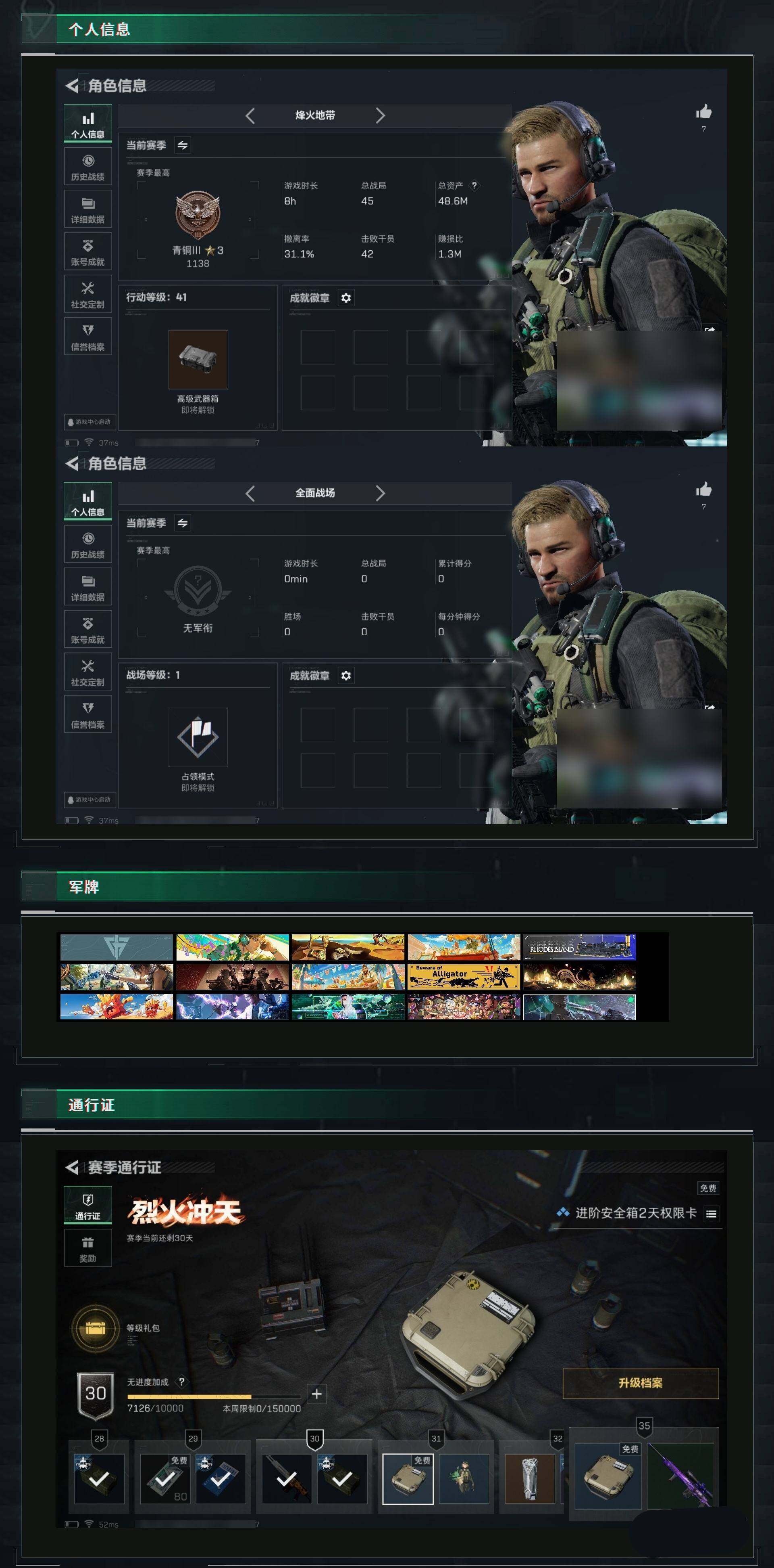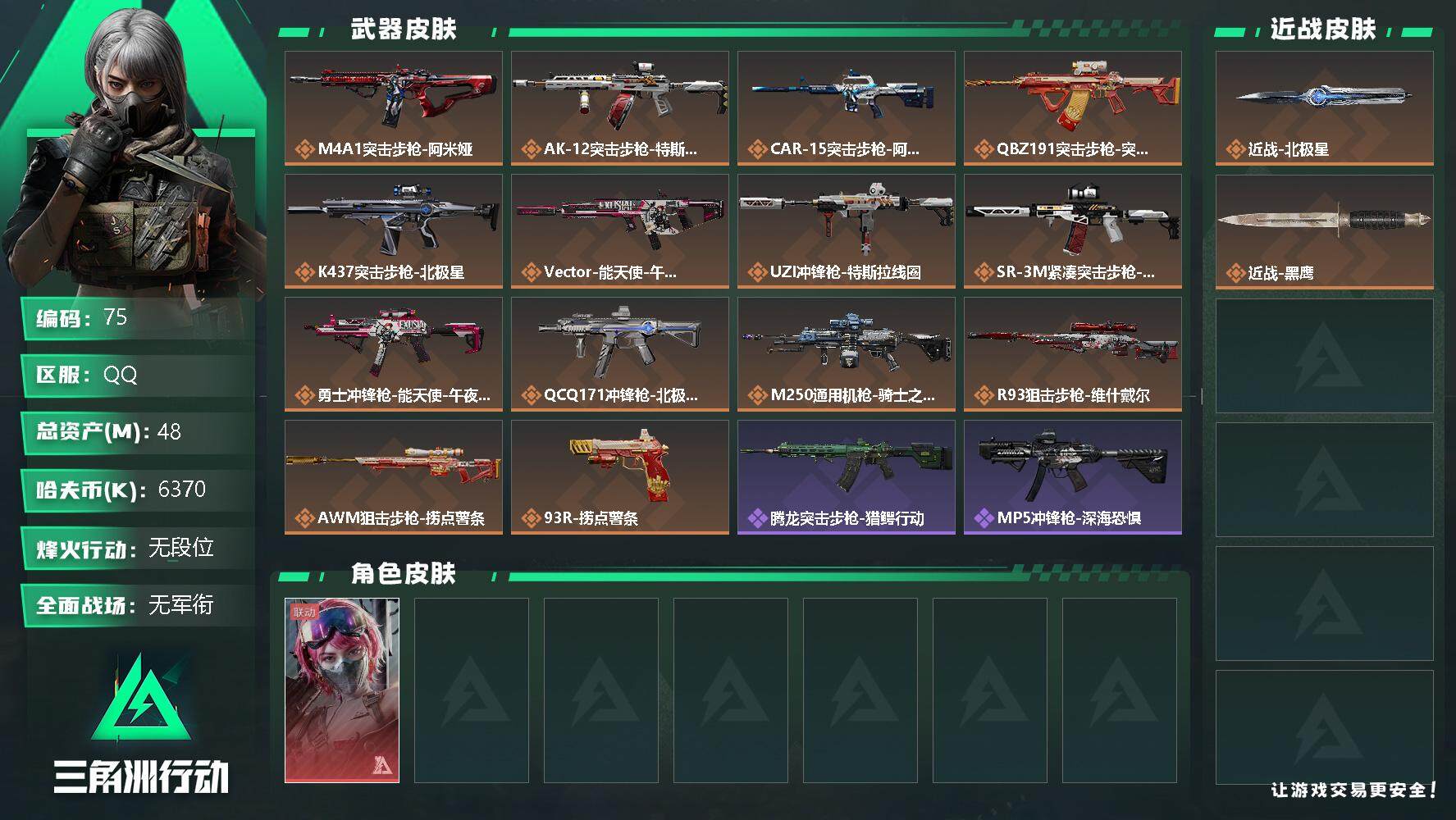 - [11681460]总资产:264.7 1干员外观 2近战传说 11传说枪械 顶级安全箱(9.17到期) 可二次 可修改实名 烽火地带段位:钻石 全面战场段位:上等兵 哈夫币:40.169 传说武器皮肤:近战-黑海,近战-北极星,SMG45冲锋枪-骑士,QJB201轻机枪-黑海,MP5冲锋枪-黑海,复合弓-黑-天际线,CAR-15突击步枪-阿米娅,725双管霰弹枪-送葬人-无题密令,QCQ171冲锋枪-北极星,K437突击步枪-北极星,G18-飞虎 史诗武器皮肤:M700狙击步枪-守夜人,Ash-12战斗步枪-守夜人,SR-3M紧凑突击步枪-荒野求生,SG552突击步枪-深海恐惧,SVD狙击步枪-暗夜猎手,M16A4突击步枪-竞赛选手,SVD狙击步枪-荒野求生,M14射手步枪-禁卫,M1014霰弹枪-林中猎手,SV-98狙击步枪-林中猎手,PSG-1射手步枪-无垢,AS Val突击步枪-典狱官,腾龙突击步枪-无垢,MP7冲锋枪-无垢,QCQ171冲锋枪-禁卫,QBZ95-1突击步枪-曙光,M700狙击步枪-竞技风 干员外观:红狼-蚀金玫瑰