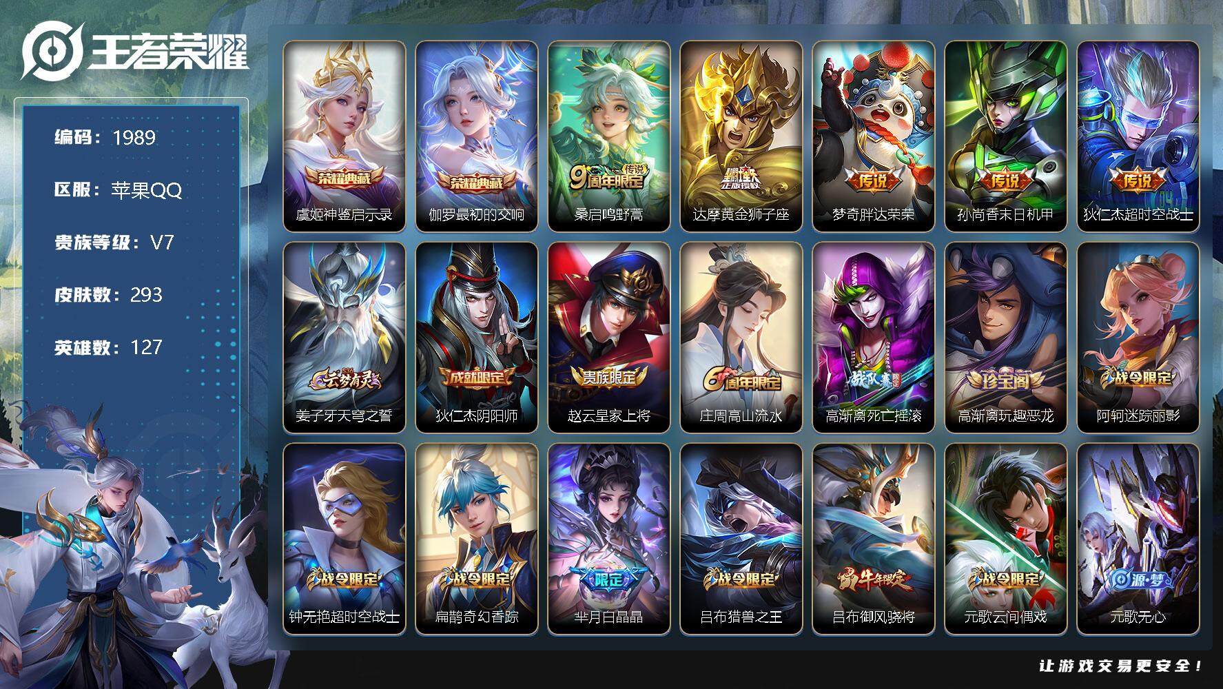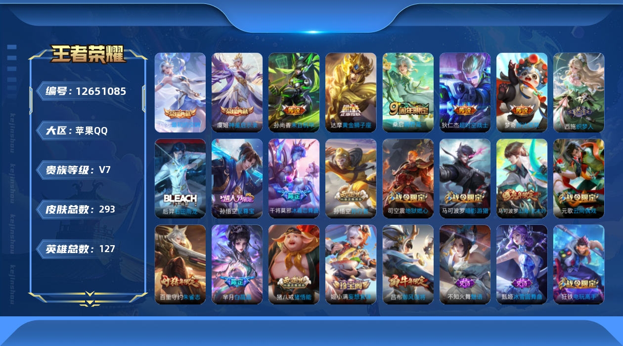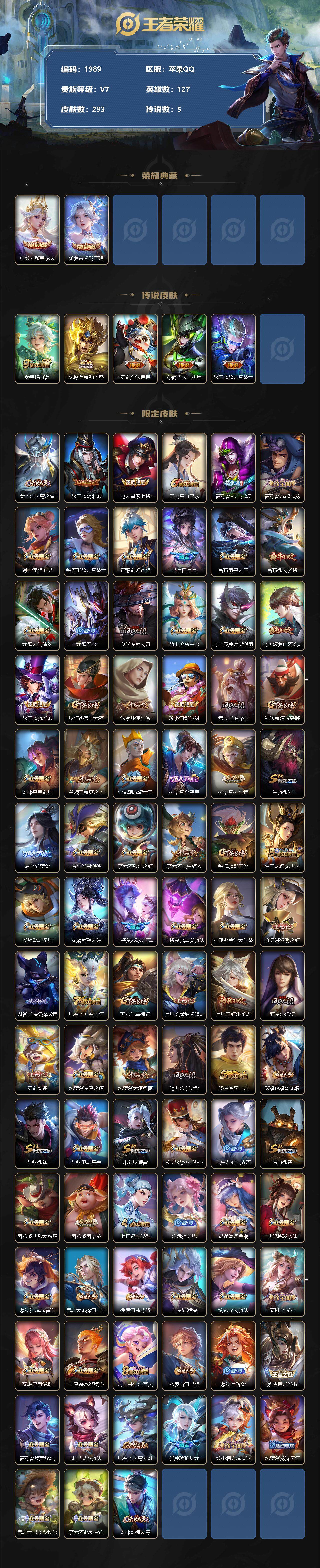 [12651085]苹果Q-V7-至尊星耀III段位-127英雄-293皮肤-2典藏-0珍品无双-0无双-0珍品传说-5传说-86史诗