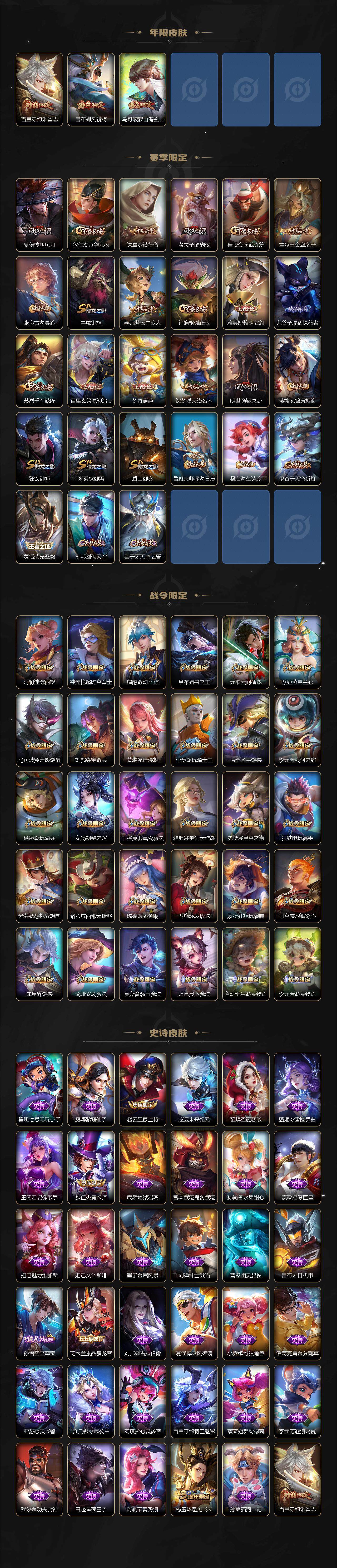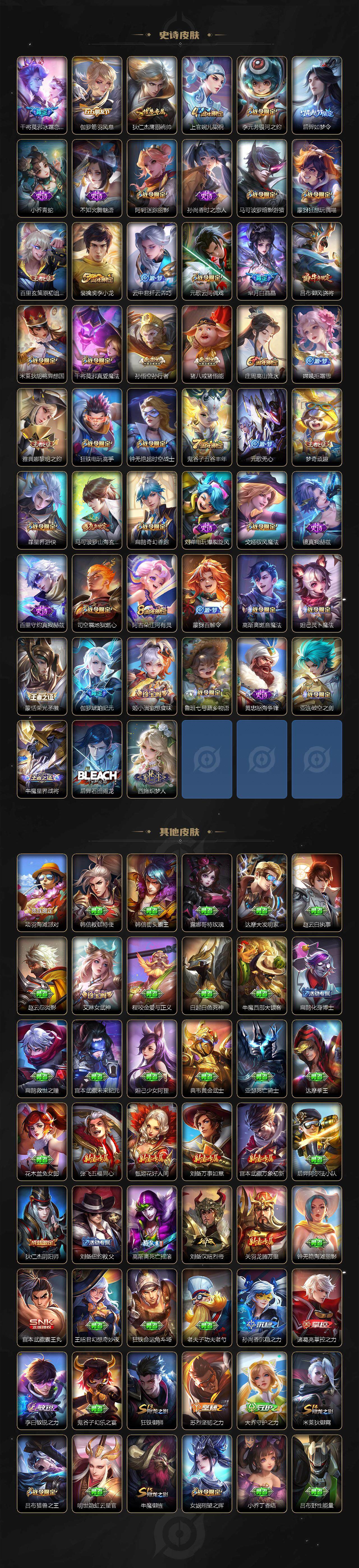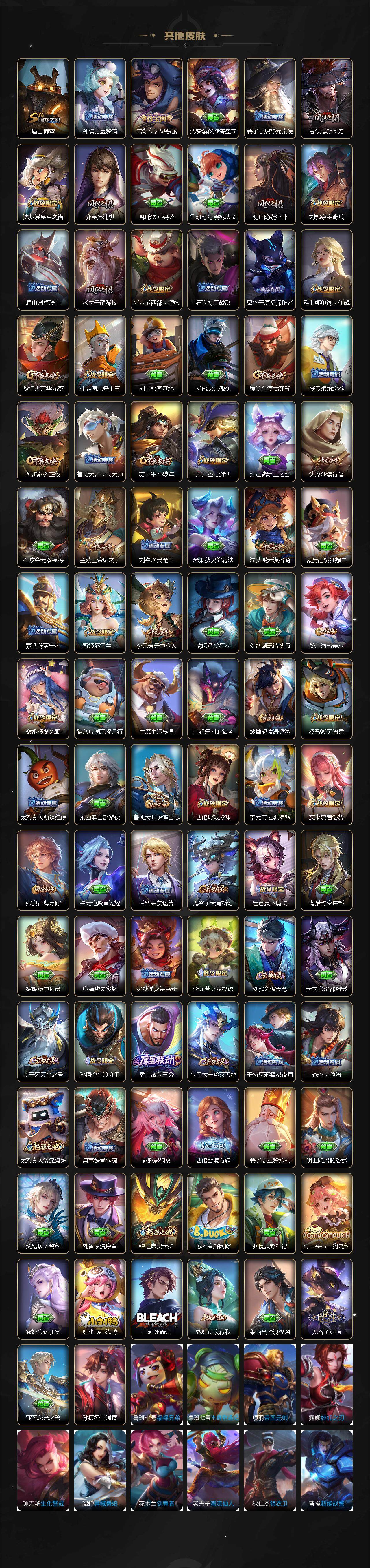 【限定皮肤】:姜子牙天穹之誓,狄仁杰阴阳师,赵云皇家上将,庄周高山流水,高渐离死亡摇滚,高渐离玩趣恶龙,阿轲迷踪丽影,钟无艳超时空战士,扁鹊奇幻香踪,芈月白晶晶,吕布猎兽之王,吕布御风骁将,元歌云间偶戏,元歌无心,夏侯惇朔风刀,甄姬落雪兰心,马可波罗暗影游猎,马可波罗山海玄木吟,狄仁杰魔术师,狄仁杰万华元夜,达摩沙漠行僧,项羽海滩派对,老夫子醍醐杖,程咬金演武夺筹,刘邦夺宝奇兵,兰陵王金庭之子,亚瑟潮玩骑士王,孙悟空至尊宝,孙悟空孙行者,牛魔御旌,后羿如梦令,后羿圣弓游侠,李元芳银河之约,李元芳云中旅人,钟馗驱傩正仪,杨玉环遇见飞天,杨戬潮玩骑兵,女娲朔望之晖,干将莫邪冰霜恋舞曲,干将莫邪真爱魔法,雅典娜单词大作战,雅典娜黎明之约,鬼谷子原初探秘者,鬼谷子五谷丰年,苏烈千军破阵,百里玄策原初追逐者,百里守约朱雀志,弈星混沌棋,梦奇顽趣,沈梦溪星空之诺,沈梦溪大漠名商,明世隐疑决卦,裴擒虎李小龙,裴擒虎擒涛扼浪,狂铁御狮,狂铁电玩高手,米莱狄御霄,米莱狄胡桃异想国,云中君纤云弄巧,盾山御銮,猪八戒西部大镖客,猪八戒猪悟能,上官婉儿梁祝,嫦娥拒霜思,嫦娥暖冬兔眠,西施玲珑珍味,蒙犽狂想玩偶喵,鲁班大师探海日志,桑启海盐诗旅,暃星界游侠,戈娅驭风魔法,艾琳女武神,艾琳流音漫舞,司空震地狱燃心,阿古朵江河有灵,张良古海寻踪,蒙犽百解令,蒙恬荣光圣徽,高渐离燃音魔法,妲己灵卜魔法,鬼谷子天穹祈灯,伽罗琥珀纪元,姬小满妄想食味,沈梦溪龙舞盛年,鲁班七号蔬乡物语,李元芳蔬乡物语,刘邦剑破天穹