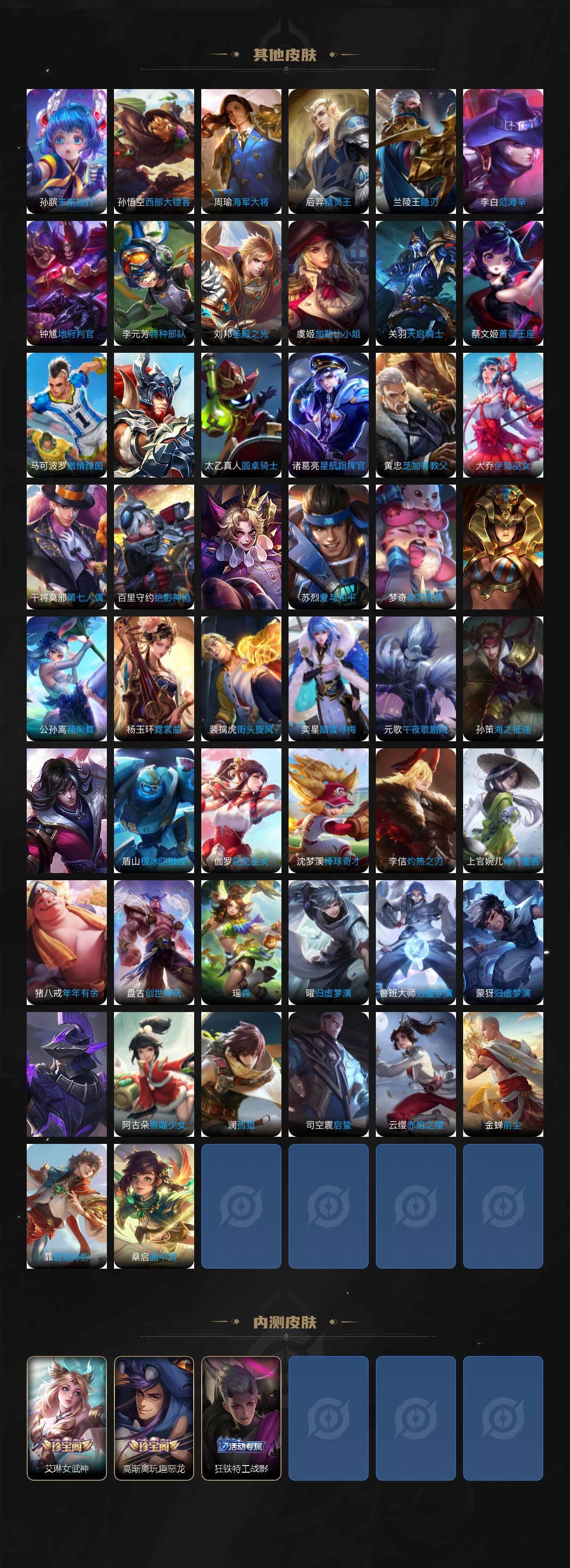 狂铁御狮,米莱狄御霄,牛魔御旌,盾山御銮,夏侯惇朔风刀,明世隐疑决卦,老夫子醍醐杖,鬼谷子原初探秘者,狄仁杰万华元夜,程咬金演武夺筹,钟馗驱傩正仪,苏烈千军破阵,吕布猎兽之王,女娲朔望之晖,沈梦溪星空之诺,李元芳银河之约,刘邦夺宝奇兵,马可波罗暗影游猎,蒙犽狂想玩偶喵,元歌云间偶戏,弈星混沌棋,达摩沙漠行僧,兰陵王金庭之子,沈梦溪大漠名商,李元芳云中旅人,桑启海盐诗旅,裴擒虎擒涛扼浪,鲁班大师探海日志,张良古海寻踪