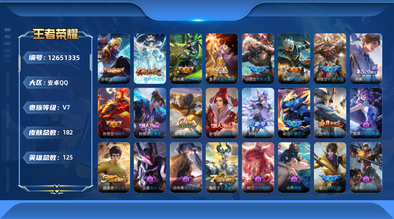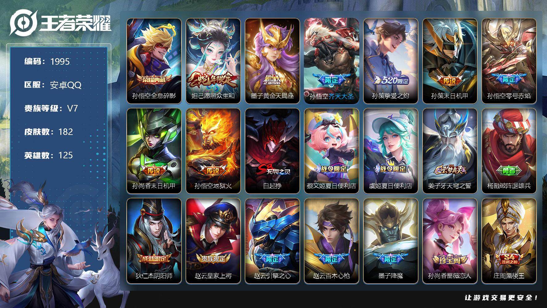 [12651335]安卓Q-V2-至尊星耀III段位-125英雄-182皮肤-1典藏-0珍品无双-0无双-0珍品传说-8传说-50史诗 【英雄全皮】:孙悟空全皮 【荣耀典藏】:孙悟空全息碎影 【传说皮肤】:妲己愿照众生和,墨子黄金天蝎座,孙悟空齐天大圣,孙策挚爱之约,孙策末日机甲,孙悟空零号赤焰,孙尚香末日机甲,孙悟空地狱火 【限定皮肤】:白起狰,蔡文姬夏日便利店,虞姬夏日便利店,姜子牙天穹之誓,杨戬破阵退雄兵,狄仁杰阴阳师,赵云皇家上将,赵云引擎之心,赵云百木心枪,墨子降魔,孙尚香蔷薇恋人,庄周蜃楼王,庄周高山流水,孙膑妖精王,吕布御风骁将,元歌无心,夏侯惇朔风刀,夏侯惇匿光决锋者,曹操烛龙,典韦穷奇,狄仁杰魔术师,狄仁杰万华元夜,达摩沙漠行僧,项羽海滩派对,老夫子醍醐杖,程咬金演武夺筹,孙悟空美猴王,孙悟空至尊宝,孙悟空大圣娶亲,孙悟空零号赤焰,孙悟空孙行者,孙悟空齐天大圣,牛魔御旌,李元芳云中旅人,钟馗驱傩正仪,杨玉环遇见飞天,雅典娜黎明之约,鬼谷子原初探秘者,鬼谷子五谷丰年,苏烈千军破阵,百里玄策原初追逐者,弈星混沌棋,沈梦溪大漠名商,明世隐疑决卦,裴擒虎李小龙,裴擒虎擒涛扼浪,狂铁御狮,米莱狄御霄,孙策挚爱之约,鲁班大师探海日志,桑启海盐诗旅,阿古朵江河有灵,张良古海寻踪,蒙犽百解令,鬼谷子天穹祈灯,刘邦剑破天穹,程咬金群星魔术团,关羽决胜骁骑,周瑜熔金海岸 【年限皮肤】:孙悟空美猴王,吕布御风骁将 【赛季限定】:庄周蜃楼王,孙膑妖精王,白起狰,夏侯惇朔风刀,曹操烛龙,典韦穷奇,狄仁杰万华元夜,达摩沙漠行僧,老夫子醍醐杖,程咬金演武夺筹,张良古海寻踪,牛魔御旌,李元芳云中旅人,钟馗驱傩正仪,雅典娜黎明之约,鬼谷子原初探秘者,苏烈千军破阵,百里玄策原初追逐者,弈星混沌棋,沈梦溪大漠名商,明世隐疑决卦,裴擒虎擒涛扼浪,狂铁御狮,米莱狄御霄,鲁班大师探海日志,桑启海盐诗旅,鬼谷子天穹祈灯,刘邦剑破天穹,姜子牙天穹之誓 【战令限定】:蔡文姬夏日便利店,虞姬夏日便利店 【史诗皮肤】:项羽苍穹之光,赵云皇家上将,赵云未来纪元,甄姬冰雪圆舞曲,王昭君偶像歌手,狄仁杰魔术师,廉颇地狱岩魂,宫本武藏鬼剑武藏,孙尚香蔷薇恋人,孙尚香水果甜心,妲己魅力维加斯,妲己女仆咖啡,墨子龙骑士,墨子金属风暴,吕布圣诞狂欢,刘禅绅士熊喵,吕布末日机甲,孙悟空至尊宝,赵云引擎之心,夏侯惇乘风破浪,百里守约特工