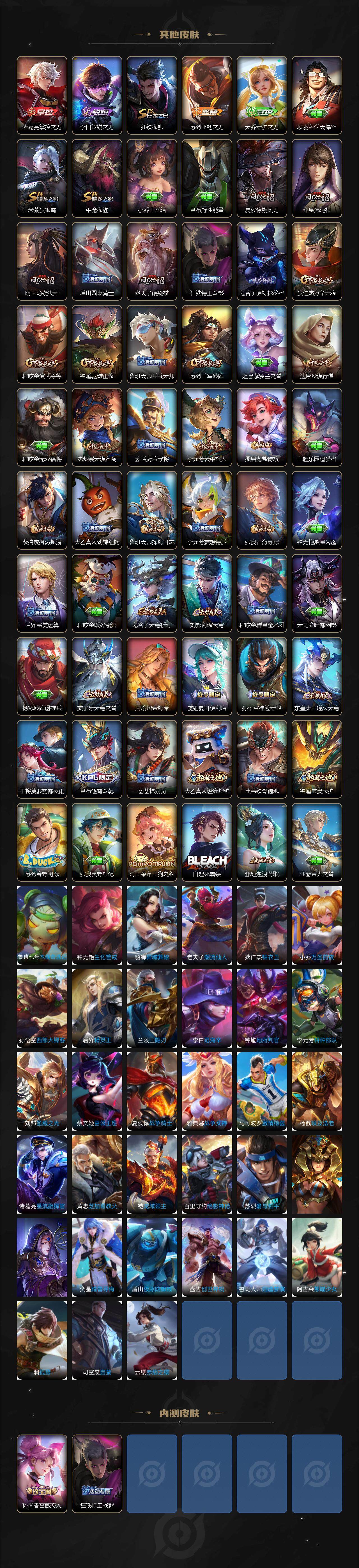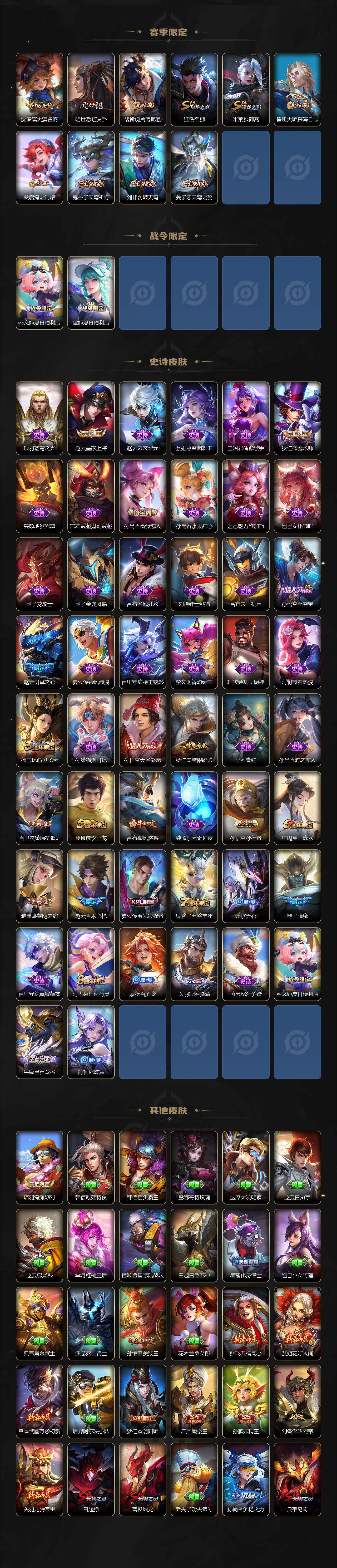 【限定皮肤】:白起狰,蔡文姬夏日便利店,虞姬夏日便利店,姜子牙天穹之誓,杨戬破阵退雄兵,狄仁杰阴阳师,赵云皇家上将,赵云引擎之心,赵云百木心枪,墨子降魔,孙尚香蔷薇恋人,庄周蜃楼王,庄周高山流水,孙膑妖精王,吕布御风骁将,元歌无心,夏侯惇朔风刀,夏侯惇匿光决锋者,曹操烛龙,典韦穷奇,狄仁杰魔术师,狄仁杰万华元夜,达摩沙漠行僧,项羽海滩派对,老夫子醍醐杖,程咬金演武夺筹,孙悟空美猴王,孙悟空至尊宝,孙悟空大圣娶亲,孙悟空零号赤焰,孙悟空孙行者,孙悟空齐天大圣,牛魔御旌,李元芳云中旅人,钟馗驱傩正仪,杨玉环遇见飞天,雅典娜黎明之约,鬼谷子原初探秘者,鬼谷子五谷丰年,苏烈千军破阵,百里玄策原初追逐者,弈星混沌棋,沈梦溪大漠名商,明世隐疑决卦,裴擒虎李小龙,裴擒虎擒涛扼浪,狂铁御狮,米莱狄御霄,孙策挚爱之约,鲁班大师探海日志,桑启海盐诗旅,阿古朵江河有灵,张良古海寻踪,蒙犽百解令,鬼谷子天穹祈灯,刘邦剑破天穹,程咬金群星魔术团,关羽决胜骁骑,周瑜熔金海岸