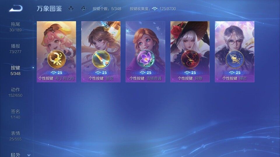 伽罗箭羽风息,李元芳逐浪之夏,不知火舞魅语,公孙离无限星赏官,大乔猫狗日记,孙策猫狗日记,阿轲节奏热浪,露娜紫霞仙子,王昭君偶像歌手,孙尚香时之恋人,阿轲暗夜猫娘,雅典娜冰冠公主,吕布末日机甲,橘右京修罗,墨子龙骑士,嬴政摇滚巨星,刘禅绅士熊喵,刘禅天才门将,白起星夜王子,安琪拉心灵骇客,程咬金功夫厨神,刘邦德古拉伯爵,兰陵王暗隐猎兽者,曹操幽灵船长,宫本武藏鬼剑武藏,亚瑟心灵战警,廉颇地狱岩魂,西施诗语江南,小乔缤纷独角兽,夏侯惇乘风破浪,花木兰水晶猎龙者,铠曙光守护者,墨子金属风暴,百里玄策原初追逐者,吕布圣诞狂欢,貂蝉圣诞恋歌,百里守约特工魅影,嫦娥拒霜思,雅典娜黎明之约,李白千年之狐,夏洛特永昼,弈星滕王阁序,镜玫瑰异探,杨玉环银翎春语,刘备百相守梦,关羽百相守梦,刘禅电玩·爆裂旋风,海月浮梦罗烟,赵怀真鹤归松栖