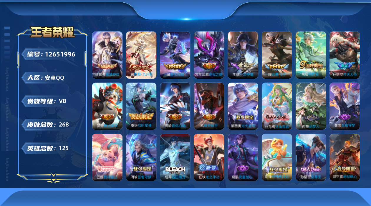 [12651996]安卓Q-V8-最强王者段位-125英雄-268皮肤-1典藏-0珍品无双-0无双-0珍品传说-11传说-77史诗