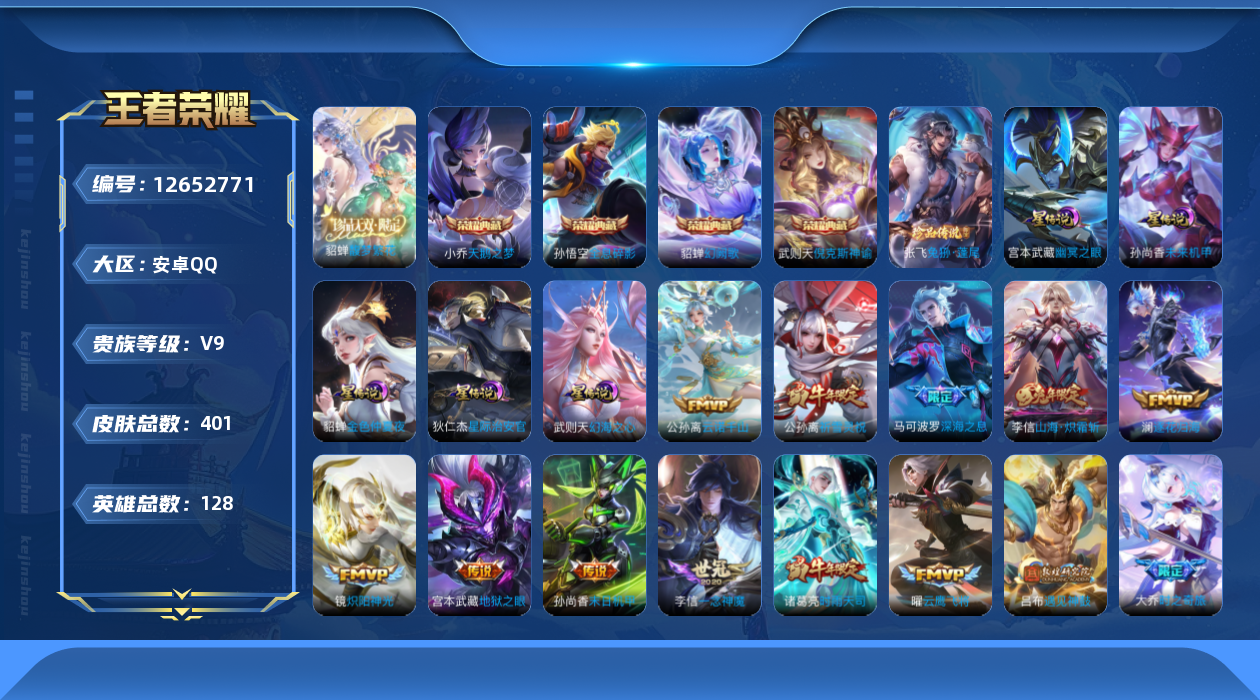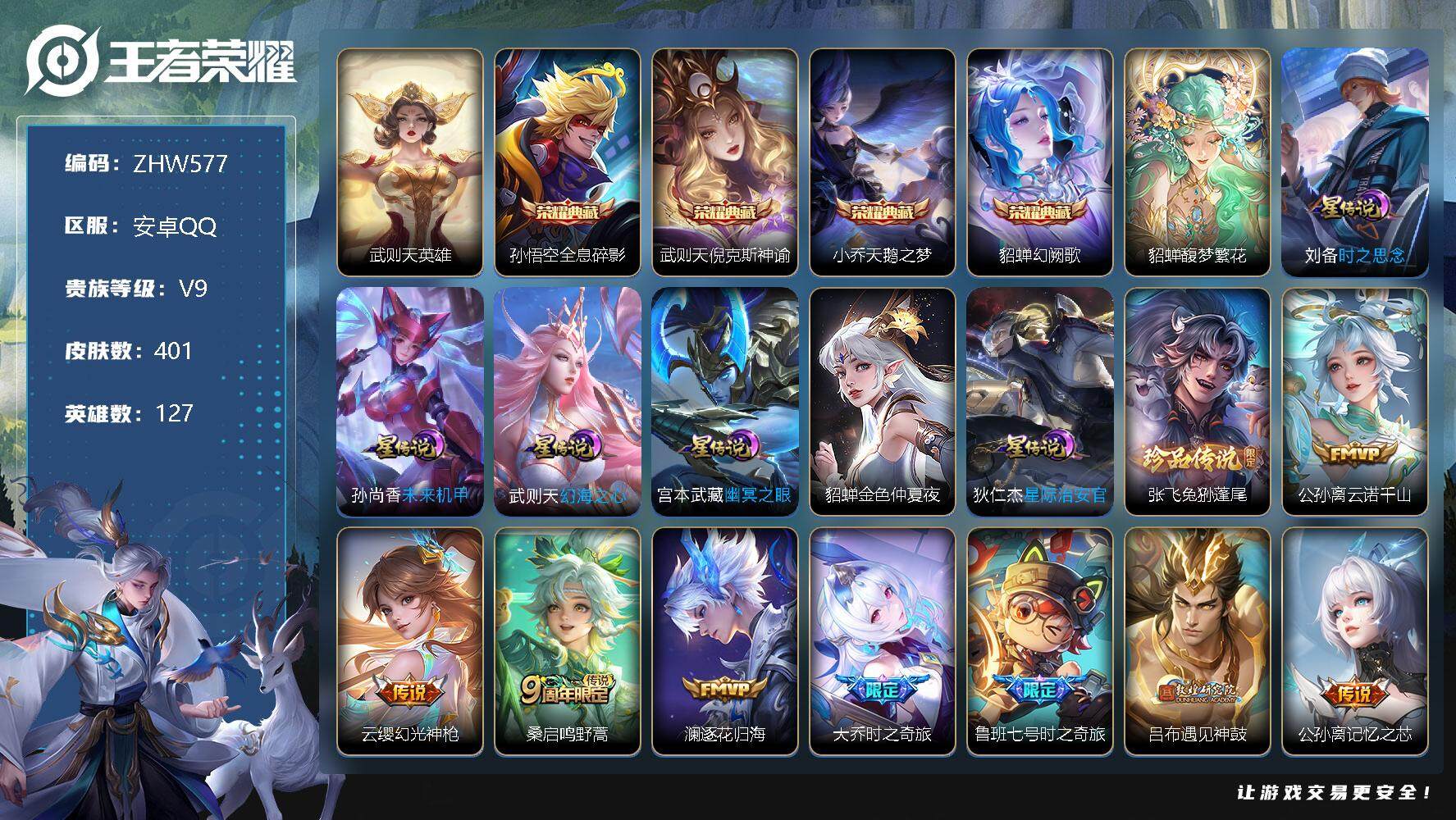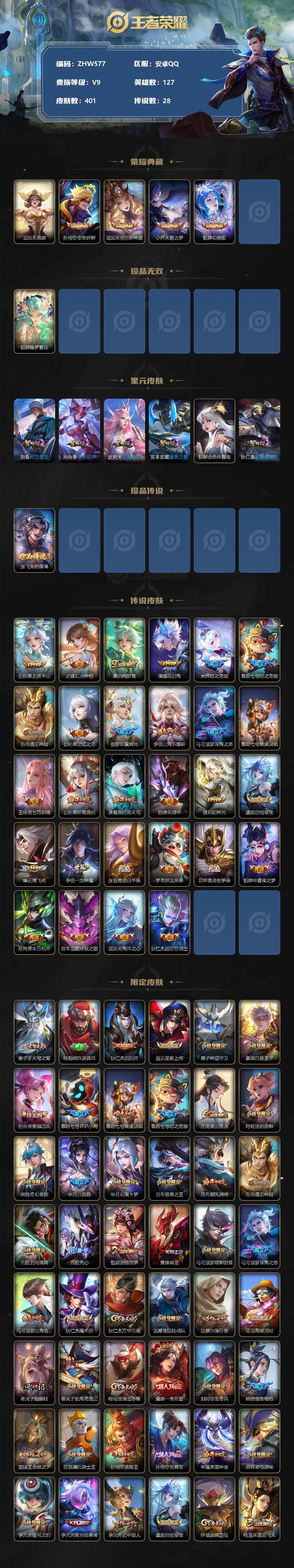 [12652771]【特价急出/详情看图】安卓Q-V9-至尊星耀V段位-127英雄-401皮肤-4典藏-1珍品无双-1珍品传说-28传说-118史诗