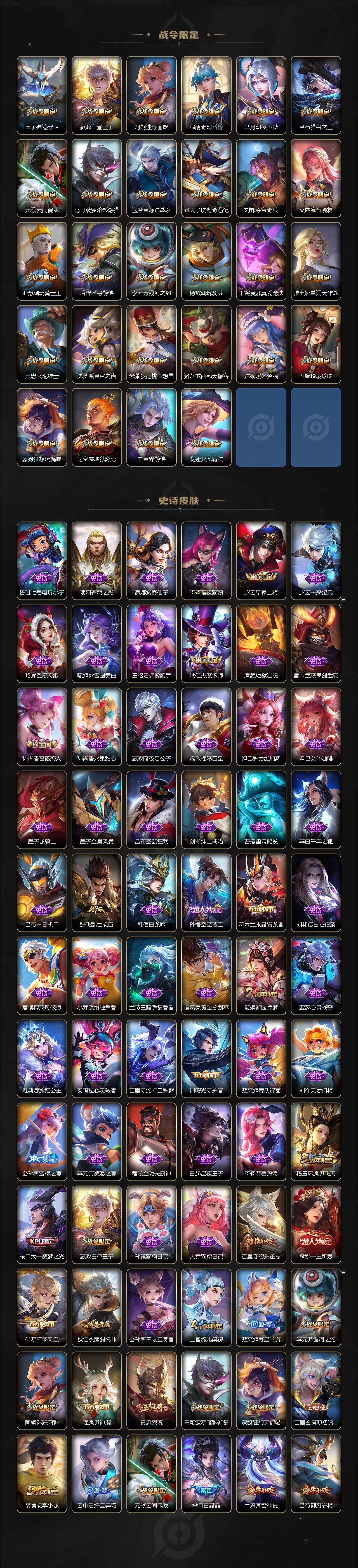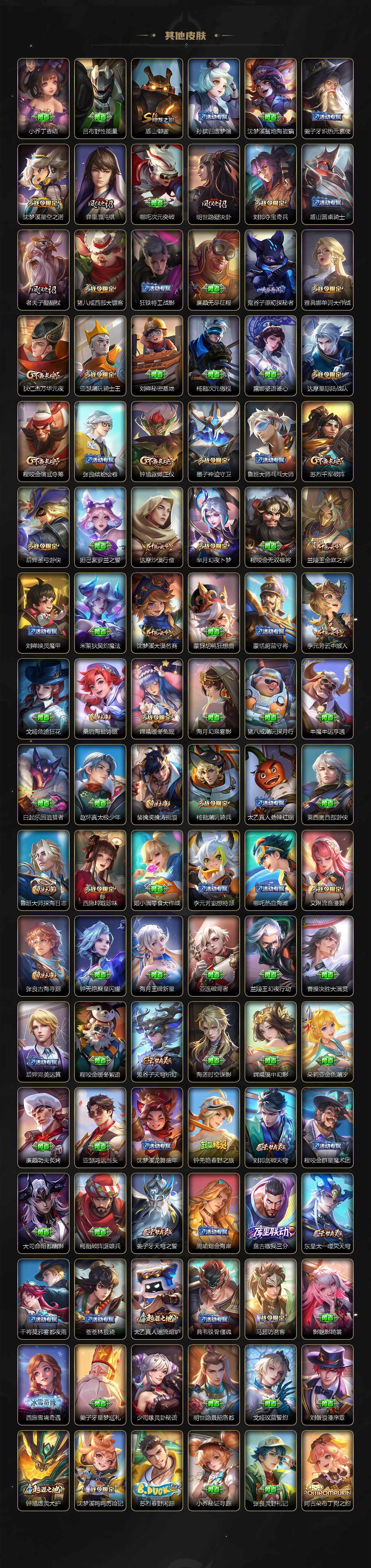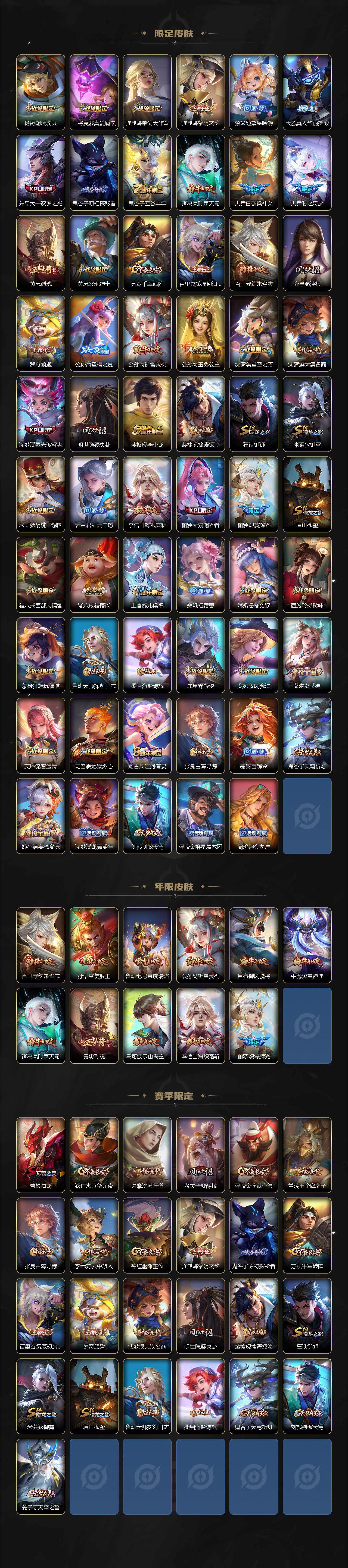 【限定皮肤】:姜子牙天穹之誓,杨戬破阵退雄兵,狄仁杰阴阳师,赵云皇家上将,墨子神迹守卫,嬴政白昼王子,孙尚香蔷薇恋人,鲁班七号乒乒小将,鲁班七号寅虎瑞焰,鲁班七号时之奇旅,庄周高山流水,阿轲迷踪丽影,扁鹊奇幻香踪,芈月白晶晶,芈月幻夜卜梦,吕布猎兽之王,吕布御风骁将,吕布遇见神鼓,元歌云间偶戏,元歌无心,甄姬游园惊梦,曹操烛龙,马可波罗暗影游猎,马可波罗深海之息,马可波罗山海玄木吟,狄仁杰魔术师,狄仁杰万华元夜,达摩星际陆战队,达摩沙漠行僧,项羽海滩派对,老夫子醍醐杖,老夫子航海奇遇记,程咬金演武夺筹,露娜一生所爱,刘邦夺宝奇兵,韩信傲雪梅枪,兰陵王金庭之子,亚瑟潮玩骑士王,孙悟空美猴王,孙悟空至尊宝,牛魔奔雷神使,后羿圣弓游侠,李元芳银河之约,李元芳匿光侦查者,李元芳云中旅人,虞姬启明星使,钟馗驱傩正仪,杨玉环遇见飞天,杨戬潮玩骑兵,干将莫邪真爱魔法,雅典娜单词大作战,雅典娜黎明之约,蔡文姬繁星吟游,太乙真人华丽摇滚,东皇太一逐梦之光,鬼谷子原初探秘者,鬼谷子五谷丰年,诸葛亮时雨天司,大乔白鹤梁神女,大乔时之奇旅,黄忠烈魂,黄忠火炮绅士,苏烈千军破阵,百里玄策原初追逐者,百里守约朱雀志,弈星混沌棋,梦奇顽趣,公孙离蜜橘之夏,公孙离祈雪灵祝,公孙离玉兔公主,沈梦溪星空之诺,沈梦溪大漠名商,沈梦溪匿光破解者,明世隐疑决卦,裴擒虎李小龙,裴擒虎擒涛扼浪,狂铁御狮,米莱狄御霄