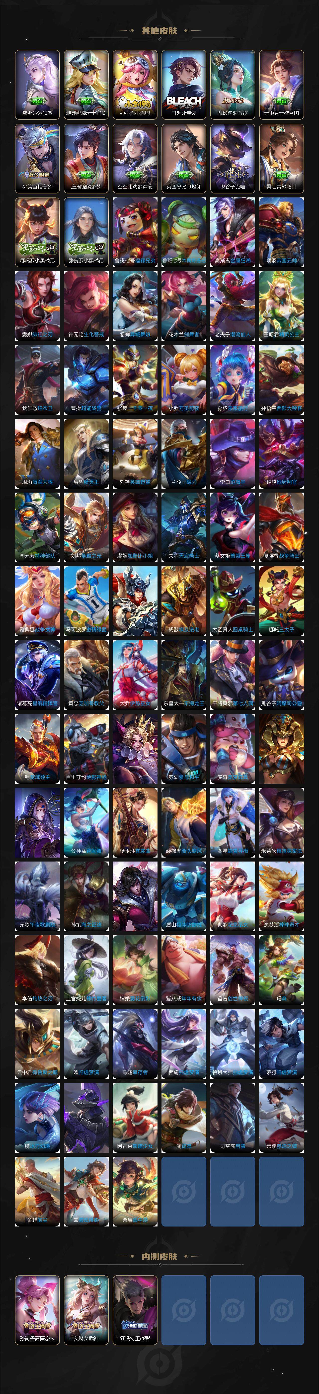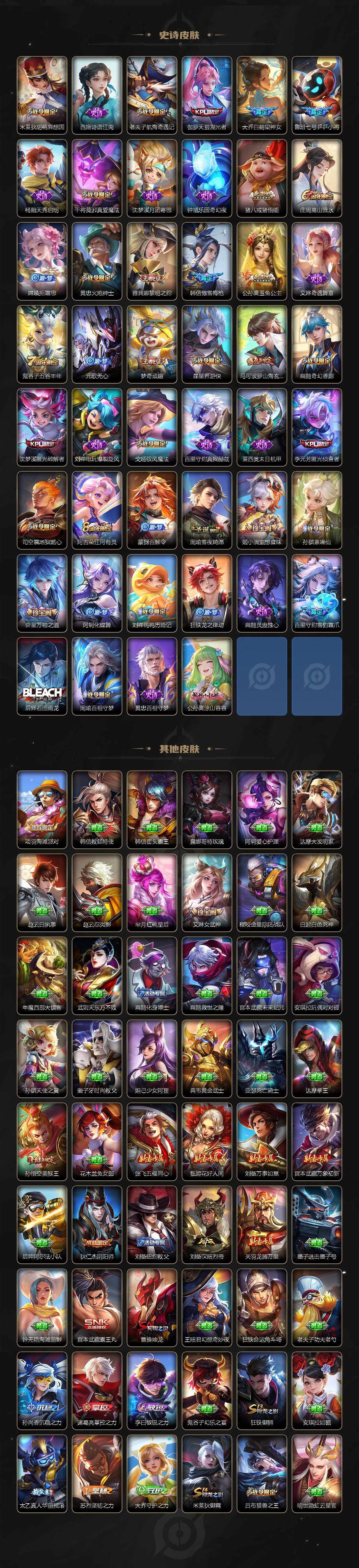 瑶遇见神鹿,伽罗箭羽风息,李元芳逐浪之夏,公孙离无限星赏官,大乔猫狗日记,孙策猫狗日记,阿轲节奏热浪,露娜紫霞仙子,诸葛亮黄金分割率,王昭君偶像歌手,韩信白龙吟,项羽苍穹之光,阿轲暗夜猫娘,雅典娜冰冠公主,吕布末日机甲,鲁班七号电玩小子,墨子龙骑士,嬴政摇滚巨星,刘禅绅士熊喵,刘禅天才门将,白起星夜王子,安琪拉心灵骇客,程咬金功夫厨神,刘邦德古拉伯爵,兰陵王暗隐猎兽者,曹操幽灵船长,宫本武藏鬼剑武藏,亚瑟心灵战警,钟馗乐园奇幻夜,杨戬天秀·启明,蔡文姬舞动绿茵,廉颇地狱岩魂,西施诗语江南,小乔缤纷独角兽,夏侯惇乘风破浪,花木兰水晶猎龙者,铠曙光守护者,墨子金属风暴,百里玄策原初追逐者,吕布圣诞狂欢,貂蝉圣诞恋歌,百里守约特工魅影,嬴政暗夜贵公子,嫦娥拒霜思,雅典娜黎明之约,李白千年之狐,艾琳奇遇舞章,沈梦溪匿光破解者,刘禅电玩·爆裂旋风,百里守约真我赫兹,莱西奥末日机甲,李元芳匿光侦查者,蒙犽百解令,周瑜雪夜绮愿