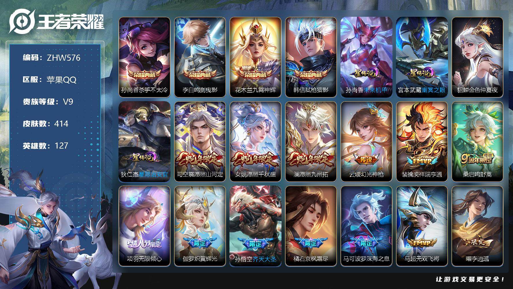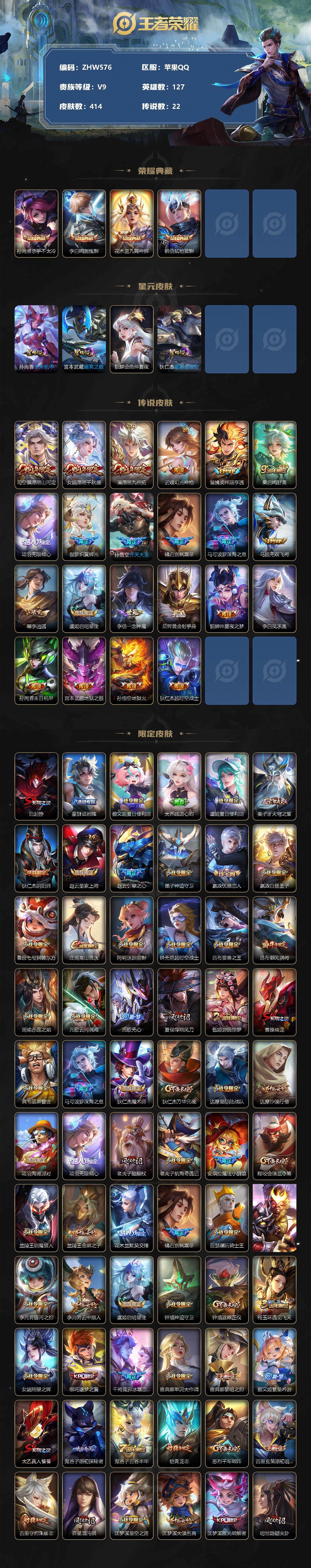 [12653009]【特价急出/详情看图】苹果Q-V9-至尊星耀II段位-127英雄-414皮肤-4典藏-22传说-4星元-116史诗 【英雄全皮】:阿轲全皮,钟馗全皮,司空震全皮,空空儿全皮,影全皮 【荣耀典藏】:孙尚香杀手不太冷,李白鸣剑曳影,花木兰九霄神辉,韩信弑枪猎影 【传说皮肤】:司空震愿照山河定,女娲愿照千秋盛,澜愿照九州拓,云缨幻光神枪,裴擒虎祥瑞亨通,桑启鸣野蒿,项羽无限倾心,伽罗炽翼辉光,孙悟空齐天大圣,橘右京枫霜尽,马可波罗深海之息,马超无双飞将,曜李逍遥 ,虞姬启明星使,李信一念神魔,后羿黄金射手座,貂蝉仲夏夜之梦,李白凤求凰,孙尚香末日机甲,宫本武藏地狱之眼,孙悟空地狱火,狄仁杰超时空战士 【限定皮肤】:白起狰,蒙犽顽岩魄,蔡文姬夏日便利店,大乔绒语心约,虞姬夏日便利店,姜子牙天穹之誓,狄仁杰阴阳师,赵云皇家上将,赵云引擎之心,墨子神迹守卫,嬴政优雅恋人,嬴政白昼王子,鲁班七号狮舞东方,庄周高山流水,阿轲迷踪丽影,钟无艳超时空战士,吕布猎兽之王,吕布御风骁将,周瑜赤莲之焰,元歌云间偶戏,元歌无心,夏侯惇朔风刀,甄姬游园惊梦,曹操烛龙,典韦蓝屏警告,马可波罗深海之息,狄仁杰魔术师,狄仁杰万华元夜,达摩星际陆战队,达摩沙漠行僧,项羽海滩派对,项羽无限倾心,老夫子醍醐杖,老夫子航海奇遇记,安琪拉魔法小厨娘,程咬金演武夺筹,兰陵王驯魔猎人,兰陵王金庭之子,花木兰默契交锋,橘右京枫霜尽,亚瑟潮玩骑士王,孙悟空齐天大圣,李元芳银河之约,李元芳云中旅人,虞姬启明星使,钟馗神迹守卫,钟馗驱傩正仪,杨玉环遇见飞天,女娲朔望之晖,哪吒逐梦之翼,干将莫邪冰霜恋舞曲,雅典娜单词大作战,雅典娜黎明之约,蔡文姬繁星吟游,太乙真人饕餮,鬼谷子原初探秘者,鬼谷子五谷丰年,铠青龙志,苏烈千军破阵,百里玄策原初追逐者,百里守约朱雀志,弈星混沌棋,沈梦溪星空之诺,沈梦溪大漠名商,沈梦溪匿光破解者,明世隐疑决卦,裴擒虎天狼狩猎者,裴擒虎李小龙,裴擒虎擒涛扼浪,狂铁御狮,米莱狄御霄,米莱狄胡桃异想国,云中君纤云弄巧,云中君时之祈愿,伽罗天狼溯光者,伽罗炽翼辉光,盾山御銮,猪八戒猪悟能,上官婉儿梁祝,嫦娥拒霜思,曜李逍遥 ,西施玲珑珍味,蒙犽狂想玩偶喵,鲁班大师探海日志,镜匿光追影者,桑启海盐诗旅,艾琳流音漫舞,司空震地狱燃心,阿古朵江河有灵,张良古海寻踪,裴擒虎梅西,蒙犽百解令,高渐离燃音魔法,妲己灵