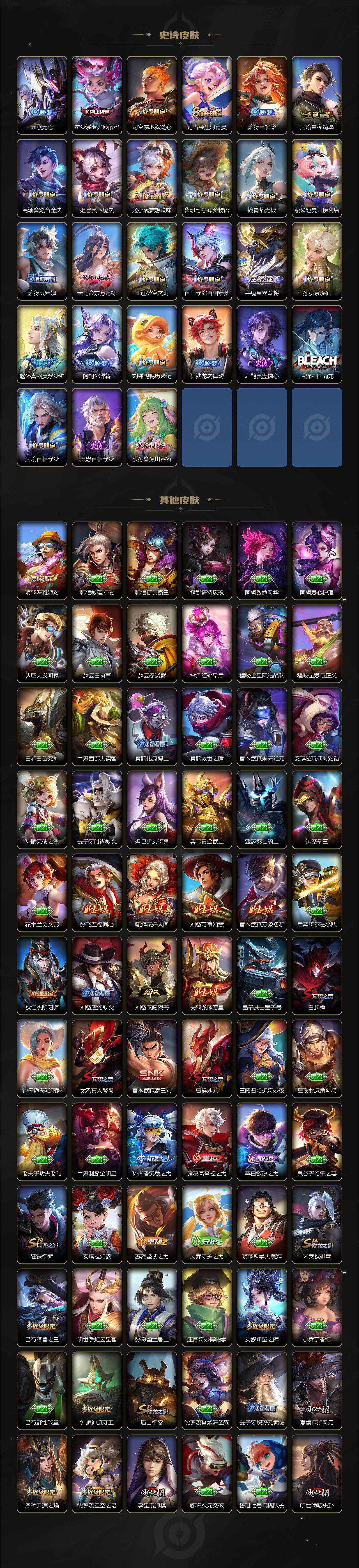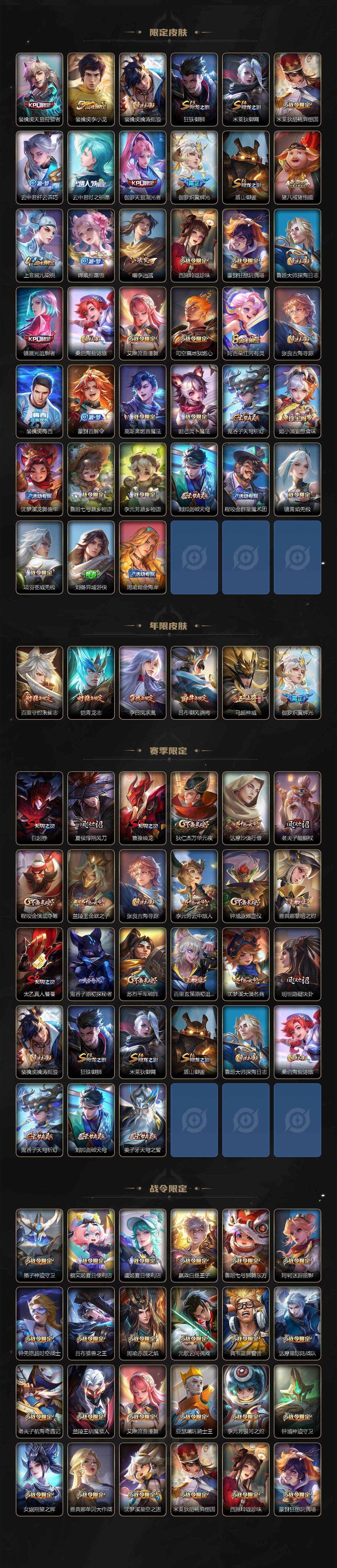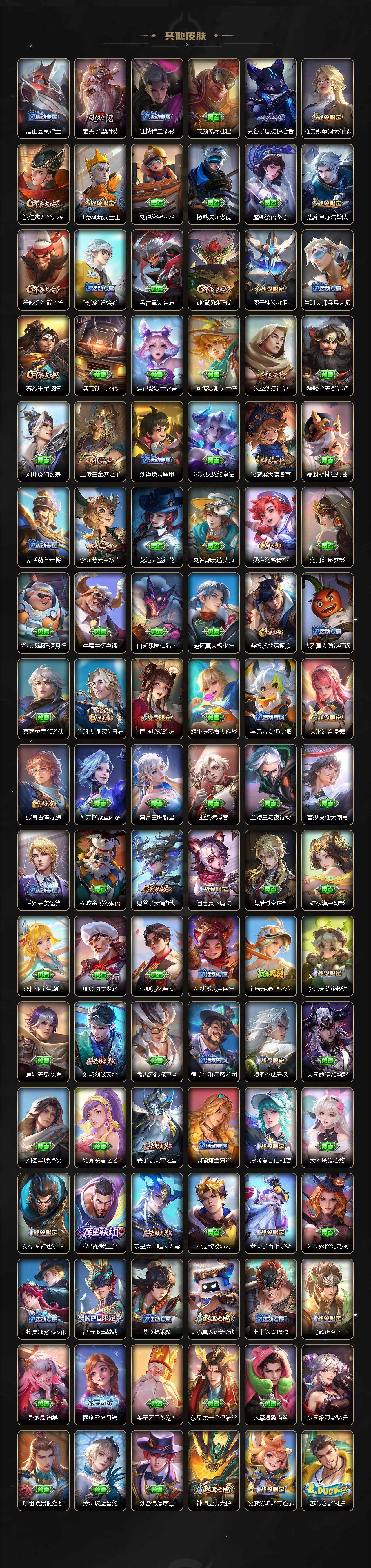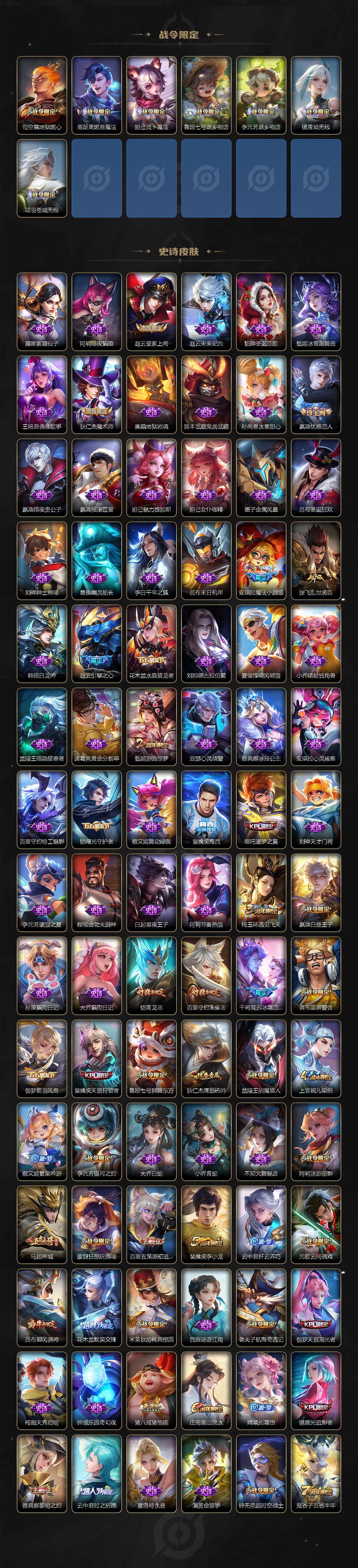【限定皮肤】:白起狰,蒙犽顽岩魄,蔡文姬夏日便利店,大乔绒语心约,虞姬夏日便利店,姜子牙天穹之誓,狄仁杰阴阳师,赵云皇家上将,赵云引擎之心,墨子神迹守卫,嬴政优雅恋人,嬴政白昼王子,鲁班七号狮舞东方,庄周高山流水,阿轲迷踪丽影,钟无艳超时空战士,吕布猎兽之王,吕布御风骁将,周瑜赤莲之焰,元歌云间偶戏,元歌无心,夏侯惇朔风刀,甄姬游园惊梦,曹操烛龙,典韦蓝屏警告,马可波罗深海之息,狄仁杰魔术师,狄仁杰万华元夜,达摩星际陆战队,达摩沙漠行僧,项羽海滩派对,项羽无限倾心,老夫子醍醐杖,老夫子航海奇遇记,安琪拉魔法小厨娘,程咬金演武夺筹,兰陵王驯魔猎人,兰陵王金庭之子,花木兰默契交锋,橘右京枫霜尽,亚瑟潮玩骑士王,孙悟空齐天大圣,李元芳银河之约,李元芳云中旅人,虞姬启明星使,钟馗神迹守卫,钟馗驱傩正仪,杨玉环遇见飞天,女娲朔望之晖,哪吒逐梦之翼,干将莫邪冰霜恋舞曲,雅典娜单词大作战,雅典娜黎明之约,蔡文姬繁星吟游,太乙真人饕餮,鬼谷子原初探秘者,鬼谷子五谷丰年,铠青龙志,苏烈千军破阵,百里玄策原初追逐者,百里守约朱雀志,弈星混沌棋,沈梦溪星空之诺,沈梦溪大漠名商,沈梦溪匿光破解者,明世隐疑决卦,裴擒虎天狼狩猎者,裴擒虎李小龙,裴擒虎擒涛扼浪,狂铁御狮,米莱狄御霄,米莱狄胡桃异想国,云中君纤云弄巧,云中君时之祈愿,伽罗天狼溯光者,伽罗炽翼辉光,盾山御銮,猪八戒猪悟能,上官婉儿梁祝,嫦娥拒霜思,曜李逍遥 ,西施玲珑珍味,蒙犽狂想玩偶喵,鲁班大师探海日志,镜匿光追影者,桑启海盐诗旅,艾琳流音漫舞,司空震地狱燃心,阿古朵江河有灵,张良古海寻踪,裴擒虎梅西,蒙犽百解令,高渐离燃音魔法,妲己灵