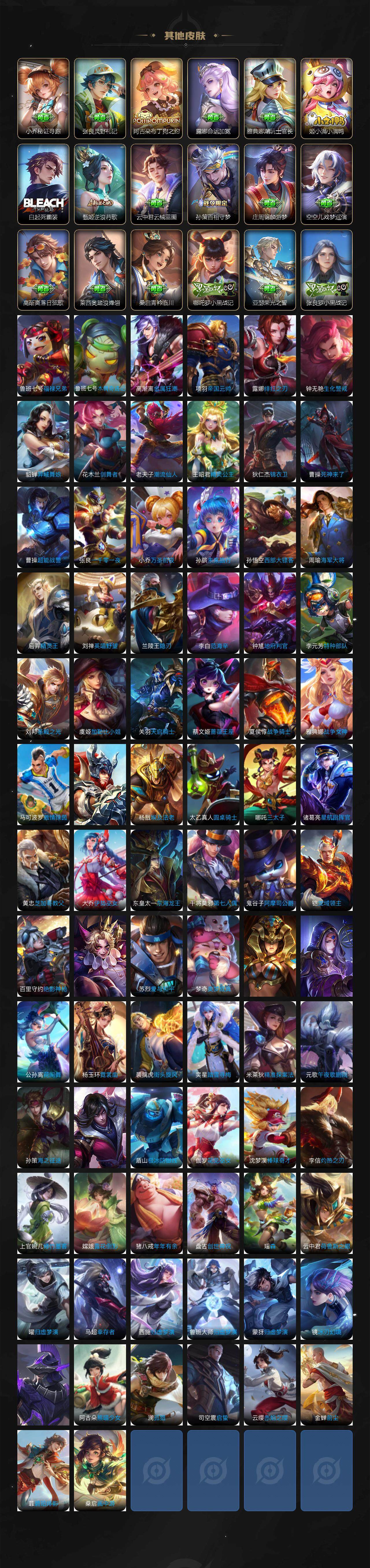 小乔青蛇,大乔白蛇,伽罗箭羽风息,李元芳逐浪之夏,不知火舞魅语,大乔猫狗日记,孙策猫狗日记,阿轲节奏热浪,露娜紫霞仙子,诸葛亮黄金分割率,王昭君偶像歌手,韩信白龙吟,阿轲暗夜猫娘,雅典娜冰冠公主,吕布末日机甲,嬴政摇滚巨星,刘禅绅士熊喵,刘禅天才门将,白起星夜王子,安琪拉心灵骇客,程咬金功夫厨神,刘邦德古拉伯爵,兰陵王暗隐猎兽者,曹操幽灵船长,宫本武藏鬼剑武藏,亚瑟心灵战警,钟馗乐园奇幻夜,杨戬天秀·启明,蔡文姬舞动绿茵,廉颇地狱岩魂,西施诗语江南,小乔缤纷独角兽,夏侯惇乘风破浪,花木兰水晶猎龙者,铠曙光守护者,墨子金属风暴,百里玄策原初追逐者,吕布圣诞狂欢,貂蝉圣诞恋歌,百里守约特工魅影,嬴政暗夜贵公子,嫦娥拒霜思,雅典娜黎明之约,李白千年之狐,夏洛特永昼,澜赏金猎手,沈梦溪匿光破解者,蒙犽百解令,周瑜雪夜绮愿,高渐离燃音魔法,赵怀真器灵·浮梦炉